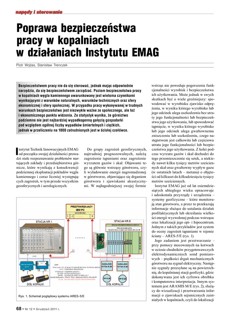 Poprawa bezpieczeństwa pracy w kopalniach w działaniach Instytutu EMAG Piotr Wojtas, Stanisław Trenczek Bezpieczeństwem pracy nie da się sterować, jednak mając odpowiednie narzędzia, da się bezpieczeństwem zarządzać. Poziom bezpieczeństwa pracy w kopalniach węgla kamiennego uwarunkowany jest wieloma czynnikami wynikającymi z warunków naturalnych, warunków technicznych oraz sfery ekonomicznej i sfery społecznej. W przypadku pracy wykonywanej w trudnych warunkach bezpieczeństwo jest niezwykle ważne ze społecznego, ale też i ekonomicznego punktu widzenia. Ze statystyk wynika, że górnictwo podziemne nie jest najbardziej wypadkogenną gałęzią gospodarki pod względem ogólnej liczby wypadków śmiertelnych i ciężkich, jednak w przeliczeniu na 1000 zatrudnionych jest w ścisłej czołówce. I nstytut Technik Innowacyjnych EMAG od początku swojej działalności prowadzi stałe rozpoznawanie problemów nurtujących zakłady i przedsiębiorstwa górnicze, które wynikają z konsekwencji podziemnej eksploatacji pokładów węgla kamiennego i coraz liczniej występujących zagrożeń, w tym przede wszystkim geosferycznych i aerologicznych. Do grupy zagrożeń geosferycznych, najtrudniej prognozowalnych, należą zagrożenie tąpaniami oraz zagrożenie wyrzutem gazów i skał. Objawami tego są głównie wstrząsy górotworu, czyli wyładowanie energii nagromadzonej w górotworze, objawiające się drganiem górotworu i zjawiskami akustycznymi. W najłagodniejszej swojej formie Rys. 1. Schemat poglądowy systemu ARES-5/E 68 l Nr 12 l Grudzień 2011 r. wstrząs nie powoduje pogorszenia funkcjonalności wyrobisk i bezpieczeństwa ich użytkowania. Może jednak w swych skutkach być o wiele groźniejszy: spowodować w wyrobisku zjawisko odprężenia, w wyniku którego wyrobisko lub jego odcinek ulega uszkodzeniu bez utraty jego funkcjonalności lub bezpieczeństwa jego użytkowania, lub spowodować tąpnięcie, w wyniku którego wyrobisko lub jego odcinek ulega gwałtownemu zniszczeniu lub uszkodzeniu, czego następstwem jest całkowita lub częściowa utrata jego funkcjonalności lub bezpieczeństwa jego użytkowania. Z kolei podczas wyrzutu gazów i skał dochodzi do tego przemieszczenie się setek, a niekiedy nawet kilku tysięcy metrów sześciennych skał oraz gwałtowny wypływ gazu (w ostatnich latach – metanu) o objętości od kilkuset do kilkudziesięciu tysięcy metrów sześciennych. Instytut EMAG już od lat osiemdziesiątych ubiegłego wieku opracowuje i udoskonala przyrządy i urządzenia – systemy geofizyczne – które monitorują stan górotworu, a przez to przekazują informacje służące do ustalania działań profilaktycznych lub określania wielkości energii wyzwolonej podczas wstrząsu oraz lokalizacji jego epi- i hipocentrum. Jednym z takich przykładów jest system do oceny zagrożeń tąpaniami w rejonie ściany – ARES-5/E (rys. 1). Jego zadaniem jest przetwarzanie – przy pomocy mocowanych na kotwach w ociosie chodników przygotowawczych elektrodynamicznych sond pomiarowych – prędkości drgań mechanicznych górotworu na sygnał elektryczny. Następnie sygnały przesyłane są na powierzchnię, do kopalnianej stacji geofizyki, gdzie dokonywana jest ich cyfrowa obróbka i komputerowa interpretacja. Innym systemem jest ARAMIS M/E (rys. 2), służący do wizualizacji i przetwarzania informacji o zjawiskach sejsmicznych zaistniałych w kopalniach, czyli do lokalizacji reklama Rys. 2. Schemat poglądowy systemu ARAMIS M/E Rys. 3. Schemat poglądowy aparatury PASAT M wstrząsów w obrębie kopalni, określania energii wstrząsów oraz wszechstronnej oceny zagrożenia tąpaniami. W zależności od rozległości obiektu system jako czujniki wykorzystuje sejsmometry lub opcjonalnie geofony niskoczęstotliwościowe. Cyfrowa transmisja danych umożliwia przesyłanie po jednej linii teletransmisyjnej trzech składowych rejestrowanej prędkości drgań (Y, X, Z), a próbkowanie sygnałów zapewnia dużą dynamikę przetwarzania i rejestracji. Oprócz wymienionych wyżej urządzeń stacjonarnych opracowana zosta- ła też aparatura przenośna – PASAT M (rys. 3), również służąca do oceny zagrożeń tąpaniami w kopalniach. Umożliwia uzyskanie i gromadzenie danych oraz ich przesyłanie w postaci cyfrowej do dalszego przetwarzania. Można np. określać naprężenia w górotworze i zmiany ich stanu w czasie i przestrzeni (anomalie naprężeń związane z: krawędziami zatrzymanej eksploatacji, oddziaływaniem resztek węglowych pokładów sąsiednich, czynną eksploatacją ściany, granicą starych zrobów, wyrobiskami korytarzowymi i uskokami). Można też wyznaczać niejednorodność geologiczną przed frontem eksploatacji (pustki, wymycia, uskoki itd.), a także i inne parametry charakteryzujące wytrzymałość i zwięzłość górotworu (moduł Younga, stała Poissona). Przechodząc do drugiej grupy zagrożeń – aerologicznych – trzeba tu wyróżnić takie, jak: wentylacyjno-gazowe, klimatyczne, metanowe, zagrożenie pożarem endogenicznym, działaniem pyłów szkodliwych dla zdrowia, wybuchem pyłu węglowego oraz zagrożenie radiacyjne naturalnymi substancjami promieniotwórczymi. Związane są one bezpośrednio lub pośrednio z przewietrzaniem kopalń. Instytut EMAG również i w tym obszarze prowadzi prace badawcze Nr 12 l Grudzień 2011 r. l 69 Rys. 4. Schemat poglądowy systemu SMP-NT/A i wdrożeniowe od początku swojej działalności. Początek to pojedyncze czujniki gazów, później urządzenia metanometrii automatycznej, a także pierwszy system kontroli zagrożenia pożarowego. Ciągły rozwój technik informatycznych, ale też i potrzeby zakładów górniczych doprowadziły do opracowania systemu o bardzo dużych możliwościach, mianowicie systemu SMP-NT/A (rys. 4) do monitorowania parametrów bezpieczeństwa i produkcji w zakładach górniczych zagrożonych wybuchem metanu i pyłu węglowego. Zapewnia on prowadzenie cią