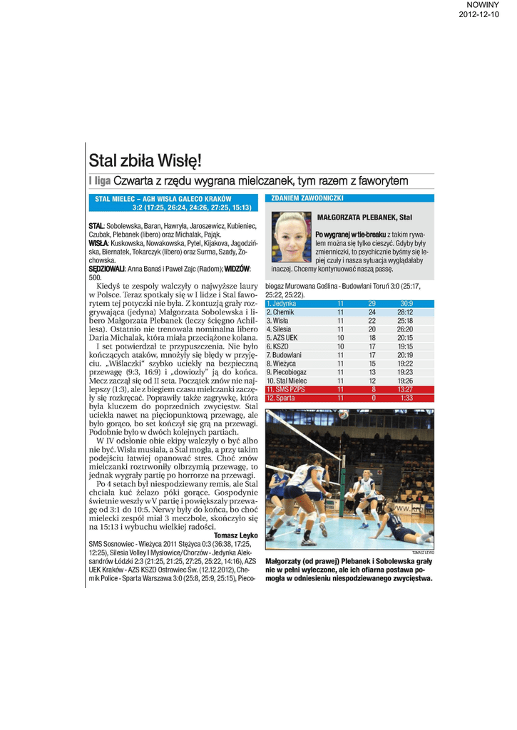 NOWINY 2012-12-10 Stal zbiła Wisłę! I liga Czwarta z rzędu wygrana mielczanek, tym razem z faworytem STAL MIELEC - AGH WISŁA GALECO KRAKÓW 3:2 (17:25, 26:24, 24:26, 27:25,15:13) ZDANIEM ZAWODNICZKI MAŁGORZATA PLEBANEK, Stal STAL: Sobolewska, Baran, Hawryta, Jaroszewicz, Kubieniec, Czubak, Plebanek (libero) oraz Michalak, Pająk. WISŁA: Kuskowska, Nowakowska, Pytel, Kijakova, Jagodziń ska, Biernatek, Tokarczyk (libero) oraz Surma, Szady, Żochowska. SĘDZIOWALI: Anna Banaś i Paweł Zajc (Radom); WIDZÓW: 500. Kiedyś te zespoły walczyły o najwyższe laury w Polsce. Teraz spotkały się w I lidze i Stal fawo rytem tej potyczki nie była. Z kontuzją grały roz grywająca (jedyna) Małgorzata Sobolewska i li bero Małgorzata Plebanek (leczy ścięgno Achil lesa). Ostatnio nie trenowała nominalna libero Daria Michalak, która miała przeciążone kolana. I set potwierdzał te przypuszczenia. Nie było kończących ataków, mnożyły się błędy w przyję ciu. „Wiślaczki" szybko uciekły na bezpieczną przewagę (9:3, 16:9) i „dowiozły" ją do końca. Mecz zaczął się od II seta. Początek znów nie naj lepszy (1:3), ale z biegiem czasu mielczanki zaczę ły się rozkręcać. Poprawiły także zagrywkę, która była kluczem do poprzednich zwycięstw. Stal uciekła nawet na pięciopunktową przewagę, ale było gorąco, bo set kończył się grą na przewagi. Podobnie było w dwóch kolejnych partiach. W TV odsłonie obie ekipy walczyły o być albo nie być. Wisła musiała, a Stal mogła, a przy takim podejściu łatwiej opanować stres. Choć znów mielczanki roztrwoniły olbrzymią przewagę, to jednak wygrały partię po horrorze na przewagi. Po 4 setach był niespodziewany remis, ale Stal chciała kuć żelazo póki gorące. Gospodynie świetnie weszły w V partię i powiększały przewa gę od 3:1 do 10:5. Nerwy były do końca, bo choć mielecki zespół miał 3 meczbole, skończyło się na 15:13 i wybuchu wielkiej radości. Tomasz Leyko SMS Sosnowiec - Wieżyca 2011 Stężyca 0:3 (36:38,17:25, 12:25), Silesia Volley I Mysłowice/Chorzów-Jedynka Alek sandrów Łódzki 2:3 (21:25, 21:25, 27:25, 25:22,14:16), AZS UEK Kraków-AZS KSZ0 Ostrowiec Św. (12.12.2012), Che mik Police-Sparta Warszawa 3:0 (25:8, 25:9,25:15), Pieco- Po wygranej wtie-breaku z takim rywa lem można się tylko cieszyć. Gdyby byty zmienniczki, to psychicznie byśmy się le piej czuty i nasza sytuacja wyglądałaby inaczej. Chcemy kontynuować naszą passę. biogaz Murowana Goślina- Budowlani Toruń 3:0 (25:17, 25:22, 25:22). 1. Jedynka 29 30:9 2. Chemik 28:12 11 24 3. Wisła 25:18 11 22 4. Silesia 26:20 11 20 5. AZS UEK 20:15 10 18 19:15 6. KSZ0 10 17 20:19 7. Budowlani 11 17 19:22 8. Wieżyca 11 15 19:23 9. Piecobiogaz 11 13 19:26 10. Stal Mielec 11 12 11.SMSPZPS 12. Sparta Małgorzaty (od prawej) Plebanek i Sobolewska grały nie w pełni wyleczone, ale ich ofiarna postawa po mogła w odniesieniu niespodziewanego zwycięstwa.