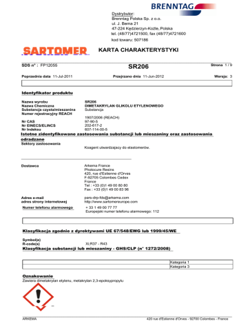 Dystrybutor: Brenntag Polska Sp. z o.o. ul. J. Bema 21 47-224 Kędzierzyn-Koźle, Polska tel. (48/77)4721500, fax (48/77)4721600 kod towaru: 507186 KARTA CHARAKTERYSTYKI _________________________________________________________________________________________________________________ SDS n° : FP12055 Strona 1 / 9 SR206 Poprzednia data 11-Jul-2011 Przejrzano dnia 11-Jun-2012 Wersja: 3 Identyfikator produktu Nazwa wyrobu Nazwa Chemiczna Substancja czysta/mieszanina Numer rejestracyjny REACH Nr CAS Nr EINECS/ELINCS Nr Indeksu SR206 DIMETAKRYLAN GLIKOLU ETYLENOWEGO Substancja 1907/2006 (REACH) 97-90-5 202-617-2 607-114-00-5 Istotne zidentyfikowane zastosowania substancji lub mieszaniny oraz zastosowania odradzane Sektory zastosowania Koagent utwardzajacy do elastomerów. Dostawca Arkema France Photocure Resins 420, rue d'Estienne d'Orves F-92705 Colombes Cedex France Tel : +33 (0)1 49 00 80 80 Fax : +33 (0)1 49 00 83 96 Adres e-mail adres strony internetowej [email protected] http://www.sartomereurope.com Numer telefonu alarmowego + 33 1 49 00 77 77 Europejski numer telefonu alarmowego: 112 Klasyfikacja zgodnie z dyrektywami UE 67/548/EWG lub 1999/45/WE Symbol(e) R-code(s) Xi;R37 - R43 Klasyfikacja substancji lub mieszaniny - GHS/CLP (n° 1272/2008) Kategoria 1 Kategoria 3 Oznakowanie Zawiera dimetakrylan etylenu, metakrylan 2,3-epoksypropylu _________________________________________________________________________________________________________________ ARKEMA 420 rue d'Estienne d'Orves - 92700 Colombes - France _________________________________________________________________________________________________________________ SDS n° : FP12055 Strona 2 / 9 SR206 Poprzednia data 11-Jul-2011 Przejrzano dnia 11-Jun-2012 Wersja: 3 _________________________________________________________________________________________________________________ P302 + P352 - W PRZYPADKU KONTAKTU ZE P333 + P313 - W przypadku wody z skóry lub wysypki: P304 + P340 - W PRZYPADKU DOSTANIA lub poszkodowanego na DO DRÓG ODDECHOWYCH: powietrze i warunki do ca Nazwa Chemiczna Nr WE dimetakrylan etylenu 202-617-2 Numer rejestracyjny REACH Nr CAS Procent wagowy Klasyfikacja (67/548) 97-90-5 >99 Xi; R37 R43 106-91-2 <0.9 Xn; R20/21/22 Xi; R36/38 R43 danych metakrylan 2,3-epoksypropylu 203-441-9 01-2119444916-3 0 Klasyfikacja (rozporzadzeniu (WE) 1272/2008) Skin Sens. 1 (H317) STOT SE 3 (H335) Acute Tox. 4 (H302) Acute Tox. 3 (H311) Skin Irrit. 2 (H315) Eye Irrit. 2 (H319) Skin Sens. 1 (H317) STOT Single Exp. 1 (H370) 4. PIERWSZA POMOC Porady ogólne Przedstawic lekarzowi dolaczona Karte Charakterystyki Substancji Niebezpiecznej Kontakt z oczami minut Zmyc natychmiast duza iloscia wody z mydlem po zdjeciu zanieczyszczonej odziezy i obuwia Wdychanie Wdychanie _________________________________________________________________________________________________________________ ARKEMA 420 rue d'Estienne d'Orves - 92700 Colombes - France _________________________________________________________________________________________________________________ SDS n° : FP12055 SR206 Poprzednia data 11-Jul-2011 Przejrzano dnia 11-Jun-2012 Strona 3 / 9 Wersja: 3 _________________________________________________________________________________________________________________ pierwszej pomocy Uzywac CO2, suchych srodków chemicznych lub piany Srodki gasnicze, które nie moga byc uzyte ze wzgledów bezpieczenstwa Specjalnych zagrozen zwiazanych gazu z narazeniem wynikajacych z wlasciwosci substancji lub preparatu jako takiego, produktów spalania, powstajacych gazów Inne informacje z lokalnymi przepisami kryzysowych Metody ograniczania _________________________________________________________________________________________________________________ ARKEMA 420 rue d'Estienne d'Orves - 92700 Colombes - France _________________________________________________________________________________________________________________ SDS n° : FP12055 SR206 Poprzednia data 11-Jul-2011 Przejrzano dnia 11-Jun-2012 Strona 4 / 9 Wersja: 3 _________________________________________________________________________________________________________________ Metody oczyszczania Odniesienie do innych sekcji substancjami i mieszaninami wybuchowi Upewnic sie, ze w bebnach jest powietrze i inhibitor. Dobrze zhomogenizowac produkt ogrzewajac w celu zapewnienia odpowiedniego rozprzestrzenienia sie ciepla i inhibitora. magazynowania miejscu elektrycznie uziemione Przechowywac w temperaturze ponizej 45°C Kwasy, Zasady, Utleniacze, Reduktory pojemniki Dalsze informacje Spelniac zalecenia odnosnie czasu przechowywania (6 miesiecy od daty dostawy) Parametry kontrolne Limity natezen Normy biologiczne _________________________________________________________________________________________________________________ ARKEMA 420 rue d'Estienne d'Orves - 92700 Colombes - France _________________________________________________________________________________________________________________ SDS n° : FP12055 Strona 5 / 9 SR206 Poprzednia data 11-Jul-2011 Przejrzano dnia 11-Jun-2012 Wersja: 3 _________________________________________________________________________________________________________________ Informacje ogólne Ochrona dróg oddechowych oddechowych. Ochrona oczu W czasie pracy z t¹ substancj¹ nie powinno siê stosowaæ soczewek kontaktowych Nie stosowac rekawic z kauczuku naturalnego, uzywac rekawic nitrylowych, Produkty uzywane z rozpuszczalnikami: uzywac grubych rekawic nitrylowych (>0,5 mm), Natychmiast wymienic rekawice podarte lub które zmienily wyglad (rozmiar, kolor, elastycznosc itd.) Uwagi bezbarwny Stan fizyczny Zapach charakterystyczny pH Temperatura topnienia/zakres temperatur topnienia Temperatura topnienia Temperatura wrzenia Zamkniety tygiel Seta górna dolna - 20°C Nierozpuszczalny w wodzie n-oktanol/woda 6 mPa.s 25 °C Inne informacje _________________________________________________________________________________________________________________ ________________