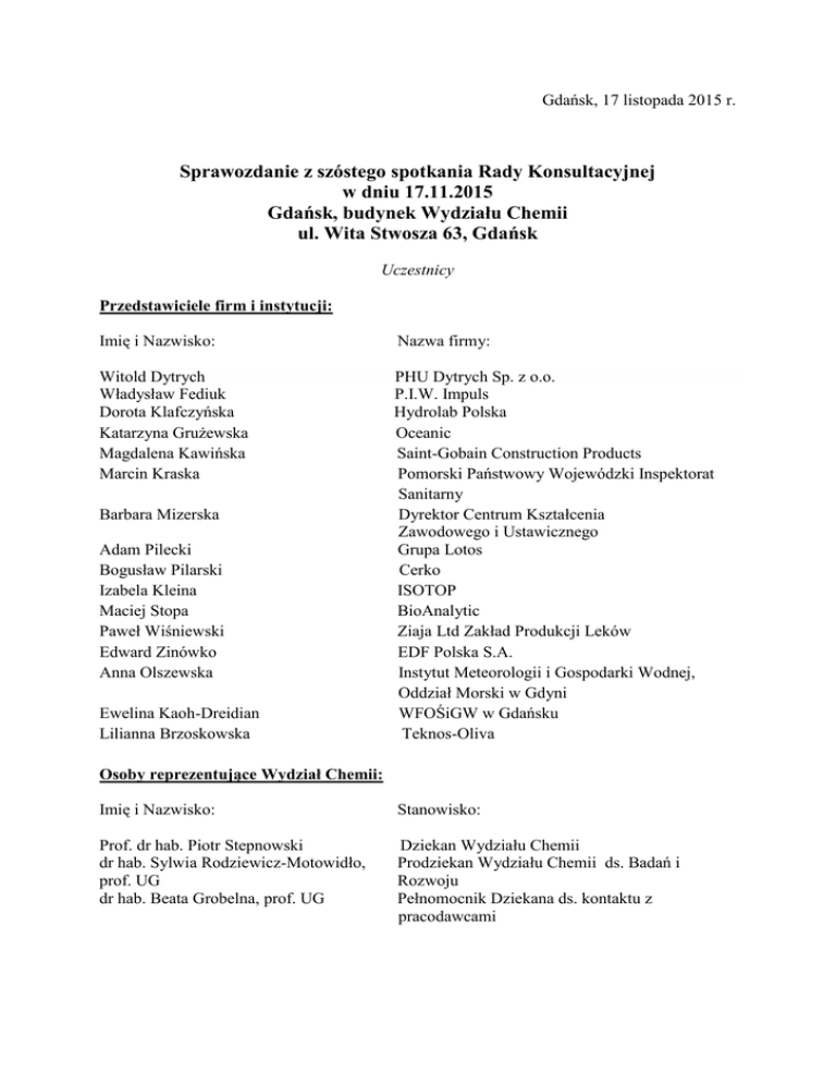 Gdańsk, 17 listopada 2015 r. Sprawozdanie z szóstego spotkania Rady Konsultacyjnej w dniu 17.11.2015 Gdańsk, budynek Wydziału Chemii ul. Wita Stwosza 63, Gdańsk Uczestnicy Przedstawiciele firm i instytucji: Imię i Nazwisko: Nazwa firmy: Witold Dytrych Władysław Fediuk Dorota Klafczyńska Katarzyna Grużewska Magdalena Kawińska Marcin Kraska PHU Dytrych Sp. z o.o. P.I.W. Impuls Hydrolab Polska Oceanic Saint-Gobain Construction Products Pomorski Państwowy Wojewódzki Inspektorat Sanitarny Dyrektor Centrum Kształcenia Zawodowego i Ustawicznego Grupa Lotos Cerko ISOTOP BioAnalytic Ziaja Ltd Zakład Produkcji Leków EDF Polska S.A. Instytut Meteorologii i Gospodarki Wodnej, Oddział Morski w Gdyni WFOŚiGW w Gdańsku Teknos-Oliva Barbara Mizerska Adam Pilecki Bogusław Pilarski Izabela Kleina Maciej Stopa Paweł Wiśniewski Edward Zinówko Anna Olszewska Ewelina Kaoh-Dreidian Lilianna Brzoskowska Osoby reprezentujące Wydział Chemii: Imię i Nazwisko: Stanowisko: Prof. dr hab. Piotr Stepnowski dr hab. Sylwia Rodziewicz-Motowidło, prof. UG dr hab. Beata Grobelna, prof. UG Dziekan Wydziału Chemii Prodziekan Wydziału Chemii ds. Badań i Rozwoju Pełnomocnik Dziekana ds. kontaktu z pracodawcami Szczegółowy opis spotkania: W dniu 17 listopada 2015 r. w godz. 12.00 - 14.30 na Wydziale Chemii Uniwersytetu Gdańskiego (s. C115) odbyło się szóste spotkanie Rady Konsultacyjnej Wydziału Chemii. W spotkaniu uczestniczyło 19 osób: zaproszeni przedstawiciele przedsiębiorstw i instytucji zatrudniających absolwentów Wydziału Chemii UG, oraz przedstawiciele kadry naukowej Wydziału Chemii UG. Przebieg spotkania: Spotkanie rozpoczęło się przywitaniem wszystkich zebranych gości przez Dziekana Wydziału Chemii UG, prof. dr hab. Piotra Stepnowskiego. Dziekan po przywitaniu przybyłych gości krótko przedstawił cel spotkania oraz jego program. W czasie spotkania Dziekan poinformował członków Rady Konsultacyjnej, że w dniu 25.06.2015 roku Prezydium Polskiej Komisji Akredytacyjnej podjęło uchwałę w sprawie udzielenia Wydziałowi Chemii oceny wyróżniającej. Ocena wyróżniająca to przede wszystkim potwierdzenie najwyższych standardów kształcenia akademickiego na Wydziale Chemii. Dziekan podziękował członkom Rady Konsultacyjnej za duży wkład w podnoszeniu jakości kształcenia na WCH. W dalszej części spotkania prof. dr hab. Piotr Stepnowski poinformował o stworzeniu nowego kierunku na Wydziale Chemii biznes chemiczny. Będą to studia inżynieryjne, które stwarzają możliwość kształcenia dla absolwentów techników chemicznych. Kierunek oparty będzie na współpracy z Wydziałem Ekonomicznym UG (30% zajęć prowadzonych przez Wydział Ekonomii, 70% zajęć prowadzonych przez Wydział Chemii). W dalszej części członkowie RK otrzymali siatkę godzin nowego kierunku i zostali poproszeni przez Dziekana o zaopiniowanie. Ponadto, Dziekan zwrócił się z prośbą o propozycję tematów wykładów, które mogłyby być poprowadzone przez przedstawicieli otoczenia gospodarczego. Otwarcie dyskusji: Jako pierwszy zabrał głos Pan Maciej Stopa, który zapytał się czy okres trwania studiów 3.5 letni nie jest za długi, z uwagi iż egzaminy inżynieryjne będą w lutym i studenci będą musieli czekać do lipca z rekrutacją na studia uzupełniające. Dziekan WCH odpowiedział, że jest to normalny cykl studiów inżynieryjnych. Wydział podejmie kroki aby otworzyć rekrutację również w semestrze zimowym. Ponadto studenci mogą kontynuować studia na Politechnice Gdańskiej, z którą mamy podpisaną umowę o współpracy w ramach konsorcjum. W planach jest również utworzenie wspólnym studiów doktoranckich w języku angielskim. Następne pytanie skierowała przedstawicielka WFOŚiGW, która zapytała o sylwetkę absolwenta. Na to pytanie również odpowiedział dziekan WCH – absolwent będzie mógł samodzielnie otworzyć działalność gospodarczą. Chcemy wspomóc również małe i średnie przedsiębiorstwa, ponadto wyposażyć absolwenta w wiedze praktyczną tak aby przedsiębiorcy otrzymali absolwenta sprawnie poruszającego się nie tylko w dziedzinie chemii ale również ochrony środowiska, wyposażonego w umiejętności korzystania z Systemów Zarządzania Jakością, aspektów REACH oraz sprawnie poruszającego się w aspektach prawnych tak ważnych w nowoczesnych przedsiębiorstwach. Ponadto, chcemy realizować wspólne projekty z przedsiębiorcami w formie prac licencjackich. Prezes firmy Impuls Władysław Fediuk – zwrócił uwagę na problem, który może zaistnieć jeśli młody absolwent, który nie jest przyzwyczajony do twardych reguł panujących w biznesie będzie chciał założyć własną działalność. Uważa, że lepiej być dobrym fachowcem w firmie niż zakładać własny biznes. Dziekan WCH ponownie zabrał głos i poinformowała, że oczywiście nowy kierunek studiów nie tylko będzie przygotowywał absolwentów do samodzielnego otwarcia firmy ale również do sprawnego poruszania się na rynku pracy. Adresatem mogą być zarówno duże jak i małe firmy chemiczne działające na rynku zarówno polskim jak i międzynarodowym. Podczas dyskusji, w której zabrali głos przedstawiciele RK padły następujące propozycje zagadnień, które powinny być wprowadzone do programu nowego kierunku studiów. - Logistyka w przedsiębiorstwie, - Aspekty przedsiębiorczości, - aspekty REACH, - opakowania w przemyśle chemicznym, farmaceutycznym i medycznym, - aspekty prawne w chemii i ochronie środowiska. Edward Zinówko przedstawiciel EDF Polska podsumował, że kierunek daje szereg możliwości dla współczesnego absolwenta, który musi mieć wiedze nie tylko chemiczną ale również i ekonomiczną. Pani Barbara Mizerska zapytała się czy Wydział Chemii rozpoczął już pewne kroki związane z promocja nowego kierunku, ponieważ jako Dyrektor Centrum Kształcenia Zawodowego i Ustawicznego jest zainteresowana nowym kierunkiem w 