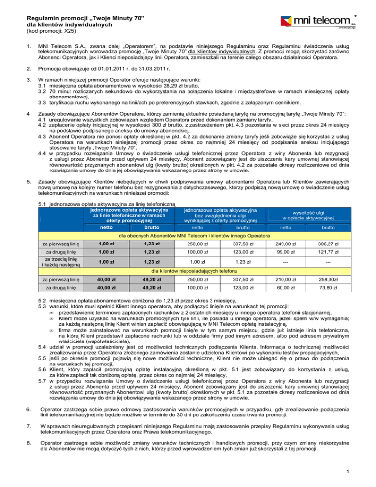 Regulamin promocji „Twoje Minuty 70” dla klientów indywidualnych (kod promocji: X25) 1. MNI Telecom S.A., zwana dalej „Operatorem”, na podstawie niniejszego Regulaminu oraz Regulaminu świadczenia usług telekomunikacyjnych wprowadza promocję „Twoje Minuty 70” dla klientów indywidualnych. Z promocji mogą skorzystać zarówno Abonenci Operatora, jak i Klienci nieposiadający linii Operatora, zamieszkali na terenie całego obszaru działalności Operatora. 2. Promocja obowiązuje od 01.01.2011 r. do 31.03.2011 r. 3. W ramach niniejszej promocji Operator oferuje następujące warunki: 3.1 miesięczna opłata abonamentowa w wysokości 28,29 zł brutto, 3.2 70 minut rozliczanych sekundowo do wykorzystania na połączenia lokalne i międzystrefowe w ramach miesięcznej opłaty abonamentowej, 3.3 taryfikacja ruchu wykonanego na linii/ach po preferencyjnych stawkach, zgodnie z załączonym cennikiem. 4 Zasady obowiązujące Abonentów Operatora, którzy zamienią aktualnie posiadaną taryfę na promocyjną taryfę „Twoje Minuty 70”: 4.1 uregulowanie wszystkich zobowiązań względem Operatora przed dokonaniem zamiany taryfy, 4.2 zapłacenie opłaty inicjacyjnej w wysokości 300 zł brutto, z zastrzeŜeniem pkt. 4.3 pozostania w sieci przez okres 24 miesięcy na podstawie podpisanego aneksu do umowy abonenckiej, 4.3 Abonent Operatora nie ponosi opłaty określonej w pkt. 4.2 za dokonanie zmiany taryfy jeśli zobowiąŜe się korzystać z usług Operatora na warunkach niniejszej promocji przez okres co najmniej 24 miesięcy od podpisania aneksu inicjującego stosowanie taryfy „Twoje Minuty 70”, 4.4 w przypadku rozwiązania Umowy o świadczenie usługi telefonicznej przez Operatora z winy Abonenta lub rezygnacji z usługi przez Abonenta przed upływem 24 miesięcy, Abonent zobowiązany jest do uiszczenia kary umownej stanowiącej równowartość przyznanych abonentowi ulg (kwoty brutto) określonych w pkt. 4.2 za pozostałe okresy rozliczeniowe od dnia rozwiązania umowy do dnia jej obowiązywania wskazanego przez strony w umowie. 5. Zasady obowiązujące Klientów niebędących w chwili podpisywania umowy abonentami Operatora lub Klientów zawierających nową umowę na kolejny numer telefonu bez rezygnowania z dotychczasowego, którzy podpiszą nową umowę o świadczenie usług telekomunikacyjnych na warunkach niniejszej promocji: 5.1 jednorazowa opłata aktywacyjna za linię telefoniczną jednorazowa opłata aktywacyjna za linie telefoniczne w ramach oferty promocyjnej netto brutto jednorazowa opłata aktywacyjna bez uwzględnienia ulgi wynikającej z oferty promocyjnej netto brutto wysokość ulgi w opłacie aktywacyjnej netto brutto dla obecnych Abonentów MNI Telecom i klientów innego Operatora za pierwszą linię 1,00 zł 1,23 zł 250,00 zł 307,50 zł 249,00 zł 306,27 zł za drugą linię za trzecią linię i kaŜdą następną 1,00 zł 1,23 zł 100,00 zł 123,00 zł 99,00 zł 121,77 zł 1,00 zł 1,23 zł 1,00 zł 1,23 zł --- --- za pierwszą linię 40,00 zł 49,20 zł 250,00 zł 307,50 zł 210,00 zł 258,30zł za drugą linię 40,00 zł 49,20 zł 100,00 zł 123,00 zł 60,00 zł 73,80 zł dla klientów nieposiadających telefonu 5.2 miesięczna opłata abonamentowa obniŜona do 1,23 zł przez okres 3 miesięcy, 5.3 warunki, które musi spełnić Klient innego operatora, aby podłączyć linię/e na warunkach tej promocji: • przedstawienie terminowo zapłaconych rachunków z 2 ostatnich miesięcy u innego operatora telefonii stacjonarnej, • Klient moŜe uzyskać na warunkach promocyjnych tyle linii, ile posiada u innego operatora, jeŜeli spełni w/w wymagania; za kaŜdą następną linię Klient winien zapłacić obowiązującą w MNI Telecom opłatę instalacyjną, • firma moŜe zainstalować na warunkach promocji linię/e w tym samym miejscu, gdzie juŜ istnieje linia telefoniczna, na którą Klient przedstawił zapłacone rachunki lub w oddziale firmy pod innym adresem, albo pod adresem prywatnym właściciela (współwłaściciela), 5.4 udział w promocji uzaleŜniony jest od moŜliwości technicznych podłączenia Klienta. Informacja o technicznej moŜliwości zrealizowania przez Operatora złoŜonego zamówienia zostanie udzielona Klientowi po wykonaniu testów propagacyjnych, 5.5 jeśli po okresie promocji pojawią się nowe moŜliwości techniczne, Klient nie moŜe ubiegać się o prawo do podłączenia na warunkach tej promocji, 5.6 Klient, który zapłacił promocyjną opłatę instalacyjną określoną w pkt. 5.1 jest zobowiązany do korzystania z usług, za które zapłacił tak obniŜoną opłatę, przez okres co najmniej 24 miesięcy, 5.7 w przypadku rozwiązania Umowy o świadczenie usługi telefonicznej przez Operatora z winy Abonenta lub rezygnacji z usługi przez Abonenta przed upływem 24 miesięcy, Abonent zobowiązany jest do uiszczenia kary umownej stanowiącej równowartość przyznanych Abonentowi ulg (kwoty brutto) określonych w pkt. 5.1 za pozostałe okresy rozliczeniowe od dnia rozwiązania umowy do dnia jej obowiązywania wskazanego przez strony w umowie. 6. Operator zastrzega sobie prawo odmowy zastosowania warunków promocyjnych w przypadku, gdy zrealizowanie podłączenia linii telekomunikacyjnej nie będzie moŜliwe w terminie do 30 dni po zakończeniu czasu trwania promocji. 7. W sprawach nieuregulowanych przepisami niniejszego Regulaminu mają zastosowanie przepisy Regulaminu wykonywania usług telekomunikacyjnych przez Operatora oraz Prawa telekomunikacyjnego. 8. Operator zastrzega sobie moŜliwość zmiany warunków technicznych i handlowych promocji, przy czym zmiany niekorzystne dla Abonentów nie mogą dotyczyć tych z nich, którzy przed wprowadzeniem tych zmian juŜ skorzystali z tej promocji. 1 Opłata miesięczna miesięczna opłata abonamentowa (zawiera 70 minut do wykorzystania na połączenia lokalne i międzystrefowe) cena netto kwota VAT cena brutto 23,00 5,29 28,29 cena za minutę netto kwota VAT cena za min