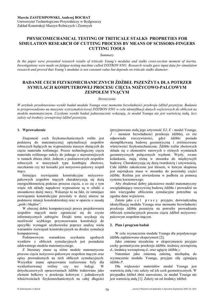 Marcin ZASTEMPOWSKI, Andrzej BOCHAT Uniwersytet Technologiczno-Przyrodniczy w Bydgoszczy Zakład Konstrukcji Maszyn Rolniczych i Ziemnych PHYSICOMECHANICAL TESTING OF TRITICALE STALKS PROPRETIES FOR SIMULATION RESEARCH OF CUTTING PROCESS BY MEANS OF SCISSORS-FINGERS CUTTING TOOLS Summary In the paper were presented research results of triticale Young’s modulus and stalks cross-section moment of inertia. Investigations were made on fatigue-testing machine called INSTRON 8501. Research results gave input data for simulation research and proved that Young’s modulus is not constant value but depends on triticale stalks diameter. BADANIE CECH FIZYKOMECHANICZNYCH ŹDŹBEŁ PSZENŻYTA DLA POTRZEB SYMULACJI KOMPUTEROWEJ PROCESU CIĘCIA NOŻYCOWO-PALCOWYM ZESPOŁEM TNĄCYM Streszczenie W artykule przedstawiono wyniki badań modułu Younga oraz momentu bezwładności przekroju źdźbeł pszenżyta. Badania te przeprowadzono na maszynie wytrzymałościowej INSTRON 8501 w celu identyfikacji danych wejściowych do obliczeń na modelu matematycznym. Uzyskane wyniki badań jednoznacznie wskazują, że moduł Younga nie jest wartością stałą, lecz zależy od średnicy zewnętrznej źdźbeł pszenżyta. (przyjmowano stałą jego sztywność EJ; E - modul Younga, J - moment bezwładności przekroju źdźbła), co nie odpowiada rzeczywistości, gdyż źdźbło posiada skomplikowaną budowę geometryczną i zróżnicowane właściwości fizykomechaniczne. Źdźbło roślin zbożowych składa się z elementów rurowych o różnych wymiarach geometrycznych połączonych węzłami. Węzły, zwane kolankami, mają różną w stosunku do międzywęźli budowę. Charakteryzują się dużą twardością i sztywnością. Całe źdźbło zakończone jest kłosem, w którym skupiona jest największa masa w stosunku do pozostałej części źdźbła. Roślina jest utwierdzona w podłożu za pomocą systemu korzeniowego. Aby zbudować dobry jakościowo model matematyczny uwzględniający rzeczywistą budowę źdźbła i prowadzić na nim wiarygodne obliczenia symulacyjne potrzebne są zgodne dane wejściowe. Zatem jako c e l p r a c y przyjęto, doświadczalną identyfikację modułu Younga oraz momentu bezwładności przekroju źdźbła pszenżyta na potrzeby prowadzenia obliczeń symulacyjnych procesu cięcia źdźbeł nożycowopalcowym zespołem tnącym. 1. Wprowadzenie Znajomość cech fizykomechanicznych roślin jest podstawą do matematycznej optymalizacji zespołów roboczych będących na wyposażeniu maszyn służących do cięcia materiału roślinnego. Proces technologiczny cięcia materiału roślinnego należy do jednego z najważniejszych w ramach zbioru zbóż. Jednym z podstawowych zespołów roboczych w maszynach typu kombajny zbożowe, sieczkarnie czy też kosiarki jest nożycowo-palcowy zespół tnący. Istniejące rozwiązania konstrukcyjne nożycowopalcowych zespołów tnących charakteryzują się dużą energochłonnością podczas procesu cięcia, a co się z tym wiąże ich układy napędowe wyposażone są w silniki o stosunkowo dużej mocy. Wskazuje to na fakt, że istniejące rozwiązania konstrukcyjne powstały w dużej mierze na podstawie intuicji konstruktorskiej oraz w oparciu o zasadę „prób i błędów”. W obecnej dobie komputeryzacji proces projektowania zespołów tnących może ograniczać się do czysto informatycznych zabiegów. Dzięki temu uzyskuje się możliwość szybkiego przystosowania konstrukcji do specyfiki wymagań użytkownika poprzez analizę wielu wariantów rozwiązań konstrukcyjnych na drodze symulacji komputerowej. Podstawowym warunkiem uzyskania zgodnych wyników z obliczeń symulacyjnych jest posiadanie adekwatnego modelu matematycznego. Z literatury znane są różne modele matematyczne procesu cięcia nożycowo-palcowym zespołem tnącym oraz opisy prowadzonych na nich obliczeń symulacyjnych. Wszystkie znane opracowania realizowane były dla wyidealizowanej rośliny czy tez łodygi. W dotychczasowych opracowaniach źdźbło traktowano jako element belkowy o przekroju kołowym i jednakowych właściwościach fizykomechanicznych na całej długości M. Zastempowski, A. Bochat 2. Plan i program badań W celu wyznaczenia modułu Younga dla pojedynczego źdźbła zaplanowano eksperyment [2]. Jako zmienne niezależne w eksperymencie przyjęto cechy geometryczne przekroju źdźbła: średnicę zewnętrzną dz, średnicę wewnętrzną dw oraz ugięcie źdźbła y. Natomiast jako zmienną zależną, niezbędną do wyznaczenia modułu Younga, przyjęto siłę zginającą źdźbło P. Dla większości materiałów moduł Younga jest wartością stałą i nie zależy od ich cech geometrycznych. W przypadku źdźbeł zbóż zauważono, że moduł Younga nie jest wartością stałą [1]. Zależy on od średnicy źdźbeł. 79 „Journal of Research and Application in Agriculture Engineering” 2009, Vol. 54(1) Celem badań jest wyznaczenie wartości modułu Younga E dla pszenżyta w celu ustalenia zależności: E = f (dz), gdzie: dz – średnica zewnętrzna źdźbła. W normalnym trybie pracy INSTRON 8501 pozwala na realizację zadania w zakresie obciążeń statycznych do 120 kN i dynamicznych do 100 kN. W doświadczeniu zaplanowano rejestrację sił w zakresie do 25 N, na co nie pozwalało standardowe wyposażenie maszyny wytrzymałościowej. Dlatego w celu realizacji badań doświadczalnych, wykonano we własnym zakresie, rejestrator siły specjalnej konstrukcji. Schemat konstrukcyjny rejestratora siły przedstawiono na rys. 2. (1) Badania realizowano dla serii 30 źdźbeł o różnych średnicach zewnętrznych. Reprezentatywną serię źdźbeł wylosowano z całej populacji posiadanego materiału do badań. Wilgotność względna źdźbeł pszenżyta w czasie badań doświadczalnych była stała i wynosiła 12%. Stała wilgotność była zapewniona poprzez ciągłe przechowywanie próbek w szafie klimatyzacyjnej. Badania zasadnicze poprzedzono pomiarem śr