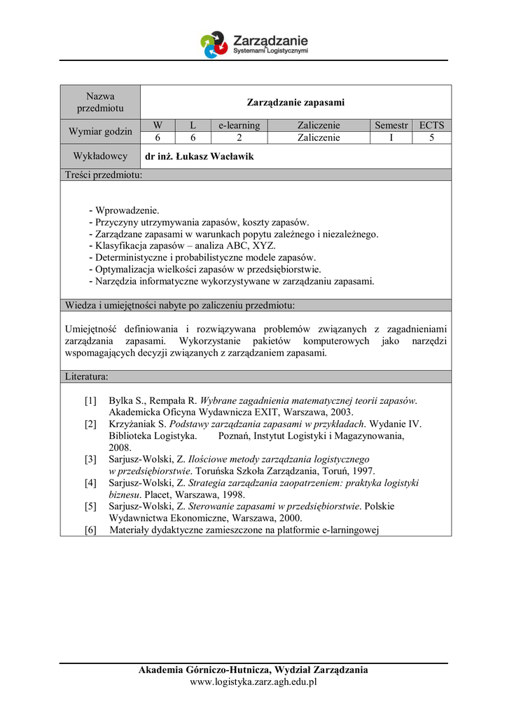 Akademia Górniczo-Hutnicza, Wydział Zarządzania www.logistyka
