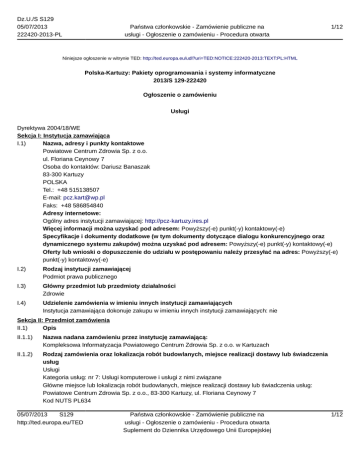 Dz.U./S S129 05/07/2013 222420-2013-PL Państwa członkowskie - Zamówienie publiczne na usługi - Ogłoszenie o zamówieniu - Procedura otwarta 1/12 Niniejsze ogłoszenie w witrynie TED: http://ted.europa.eu/udl?uri=TED:NOTICE:222420-2013:TEXT:PL:HTML Polska-Kartuzy: Pakiety oprogramowania i systemy informatyczne 2013/S 129-222420 Ogłoszenie o zamówieniu Usługi Dyrektywa 2004/18/WE Sekcja I: Instytucja zamawiająca I.1) Nazwa, adresy i punkty kontaktowe Powiatowe Centrum Zdrowia Sp. z o.o. ul. Floriana Ceynowy 7 Osoba do kontaktów: Dariusz Banaszak 83-300 Kartuzy POLSKA Tel.: +48 515138507 E-mail: [email protected] Faks: +48 586854840 Adresy internetowe: Ogólny adres instytucji zamawiającej: http://pcz-kartuzy.ires.pl Więcej informacji można uzyskać pod adresem: Powyższy(-e) punkt(-y) kontaktowy(-e) Specyfikacje i dokumenty dodatkowe (w tym dokumenty dotyczące dialogu konkurencyjnego oraz dynamicznego systemu zakupów) można uzyskać pod adresem: Powyższy(-e) punkt(-y) kontaktowy(-e) Oferty lub wnioski o dopuszczenie do udziału w postępowaniu należy przesyłać na adres: Powyższy(-e) punkt(-y) kontaktowy(-e) I.2) Rodzaj instytucji zamawiającej Podmiot prawa publicznego I.3) Główny przedmiot lub przedmioty działalności Zdrowie I.4) Udzielenie zamówienia w imieniu innych instytucji zamawiających Instytucja zamawiająca dokonuje zakupu w imieniu innych instytucji zamawiających: nie Sekcja II: Przedmiot zamówienia II.1) Opis II.1.1) Nazwa nadana zamówieniu przez instytucję zamawiającą: Kompleksowa Informatyzacja Powiatowego Centrum Zdrowia Sp. z o.o. w Kartuzach II.1.2) Rodzaj zamówienia oraz lokalizacja robót budowlanych, miejsce realizacji dostawy lub świadczenia usług Usługi Kategoria usług: nr 7: Usługi komputerowe i usługi z nimi związane Główne miejsce lub lokalizacja robót budowlanych, miejsce realizacji dostawy lub świadczenia usług: Powiatowe Centrum Zdrowia Sp. z o.o., 83-300 Kartuzy, ul. Floriana Ceynowy 7 Kod NUTS PL634 05/07/2013 S129 http://ted.europa.eu/TED Państwa członkowskie - Zamówienie publiczne na usługi - Ogłoszenie o zamówieniu - Procedura otwarta Suplement do Dziennika Urzędowego Unii Europejskiej 1/12 Dz.U./S S129 05/07/2013 222420-2013-PL Państwa członkowskie - Zamówienie publiczne na usługi - Ogłoszenie o zamówieniu - Procedura otwarta 2/12 II.1.3) Informacje na temat zamówienia publicznego, umowy ramowej lub dynamicznego systemu zakupów (DSZ) Ogłoszenie dotyczy zamówienia publicznego II.1.4) Informacje na temat umowy ramowej II.1.5) Krótki opis zamówienia lub zakupu 1. Dane ogólne 1.1. Przedmiotem zamówienia jest rozbudowa posiadanego przez Zamawiającego systemu informatycznego SSI wraz z wykonaniem okablowania strukturalnego z dedykowaną instalacją zasilania energetycznego komputerów, remont pomieszczeń w celu dostosowania na potrzeby serwerowni i dostawą potrzebnego sprzętu komputerowego i oprogramowania. 1.2. Przedmiot zamówienia realizowany jest w ramach projektu „Kompleksowa informatyzacja Powiatowego Centrum Zdrowia Sp. z o.o. w Kartuzach” współfinansowanego przez Unię Europejską w ramach Regionalnego Programu Operacyjnego dla Województwa Pomorskiego na lata 2007 – 2013, Osi Priorytetowej 2. Społeczeństwo wiedzy, Działania 2.2 Infrastruktura i usługi tworzące podstawy społeczeństwa informacyjnego, Poddziałania 2.2.2 Rozwój usług społeczeństwa informacyjnego. 2. Przedmiot zamówienia obejmuje, w szczególności: 2.1. Rozbudowa posiadanego przez Zamawiającego systemu informatycznego SSI (opis wymagań szczegółowych znajduje się w załączniku NR 7 do SIWZ) poprzez: 2.1.1. Dostawę następujących modułów oprogramowania aplikacyjnego SSI (Szpitalnego Systemu Informatycznego) składającego się z HIS (ang. Hospital Information System – Szpitalny System Informacyjny), ERP (Enterprise Resource Planning - Planowanie Zasobów Przedsiębiorstwa), Systemu Informacji Zarządczej - Business Intelligence, RIS/PACS i Portali e-Platformy zapisanych na nośniku danych (1 sztuka), udzielenie bezterminowej licencji na sieciowe użytkowanie tych programów aplikacyjnych wraz z nadzorem autorskim nad tym oprogramowaniem aplikacyjnym przez okres 2 lat od daty podpisania umowy realizacyjnej (opis wymagań funkcjonalnych dla oprogramowania aplikacyjnego znajduje się w dalszej części SIWZ): e-Platforma: Portal informacyjny - licencja otwarta na nieograniczoną ilość użytkowników e-Platforma: Portal ePacjent - licencja otwarta na nieograniczoną ilość pacjentów e-Platforma: Portal eKontrahent - licencja otwarta na nieograniczoną ilość kontrahentów HIS: Sprzedaż Usług Medycznych – Umowy komercyjne - licencja otwarta na nieograniczoną ilość kontrahentów HIS: Przychodnia - Rejestracja - licencja otwarta na nieograniczoną ilość użytkowników HIS: Przychodnia - Gabinet Lekarski - licencja otwarta na nieograniczoną ilość użytkowników HIS: Medycyna Pracy - licencja dla 3 użytkowników HIS: Rehabilitacja - licencja dla 5 użytkowników HIS: Pracownia Diagnostyczna - licencja otwarta na nieograniczoną ilość użytkowników HIS: Laboratorium z mikrobiologią - licencja dla 8 użytkowników HIS: Interfejs do aparatu w Laboratorium - Integracja z 9 aparatami HIS: Punkt pobrań - licencja dla 3 użytkowników HIS: Ruch Chorych - licencja otwarta na nieograniczoną ilość użytkowników HIS: Blok Operacyjny - licencja otwarta na nieograniczoną ilość użytkowników HIS: Apteczka Oddziałowa - licencja otwarta na nieograniczoną ilość użytkowników HIS: Zakażenia Szpitalne - licencja dla 1 użytkownika HIS: Dokumentacja Formularzowa/Medyczna - licencja otwarta na nieograniczoną ilość formularzy i użytkowników HIS: Zlecenia - licencja otwarta na nieograniczoną ilość użytkowników 05/07/2013 S129 http://ted.europa.eu/TED Państwa członkowskie - Zamówienie publiczne na usługi - Ogłoszenie o zamówieniu - Procedura otwarta Suplement do Dziennik