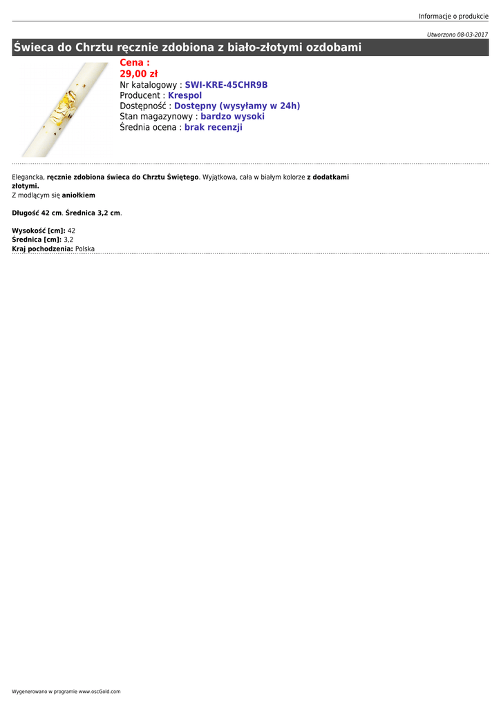 Informacje o produkcie Utworzono 08-03-2017 Świeca do Chrztu ręcznie zdobiona z biało-złotymi ozdobami Cena : 29,00 zł Nr katalogowy : SWI-KRE-45CHR9B Producent : Krespol Dostępność : Dostępny (wysyłamy w 24h) Stan magazynowy : bardzo wysoki Średnia ocena : brak recenzji Elegancka, ręcznie zdobiona świeca do Chrztu Świętego. Wyjątkowa, cała w białym kolorze z dodatkami złotymi. Z modlącym się aniołkiem Długość 42 cm. Średnica 3,2 cm. Wysokość [cm]: 42 Średnica [cm]: 3,2 Kraj pochodzenia: Polska Wygenerowano w programie www.oscGold.com