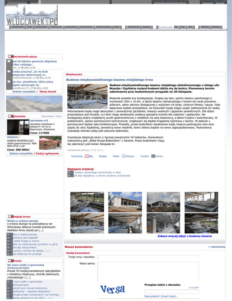 Wloclawek.info.pl Nowo ści imieniny: Bogusława, Bronisława, Ilony czwartek, 18 sierpnia 2011 . Zarejestruj Zaloguj Włocławek Wiadomo ści Sport Katalog Firm Strefa Video Foto galerie Oferty pracy Ważne numery Mapa Program TV Pogoda Rozkład jazdy: PKS PKP MPK Reklama Kontakt Włocławianie piszą: Apel do kibiców generała zbigniewa Ścibor-rylskiego .. Tom , 17-08-2011, 21:55 Trzeba przyznać ,że nie brak kolejarzom determinacji w.. Antydzia łkowiec , 17-08-2011, 21:19 Czy tzw. janosikowe, które płacą bogate samorządy na.. Wiadomości Budowa międzyosiedlowego basenu miejskiego trwa Budowa międzyosiedlowego basenu miejskiego zlokalizowanego u zbiegu ulic Wysoka i Szpitalna małymi krokami zbliża się do końca. Planowany termin zakończenia prac budowlanych przypada na 30 listopada. Janosikowe !?! , 17-08-2011, 13:55 Zobacz wszystkie / Nowy temat Ogłoszenia Motoryzacja / Praca sprzedam m3 Sprzedam mieszkanie 2 pokoje,47 m2 na ul. Bojańczyka. Mieszkanie Cena: 117000 OKAZJA ! DOBRZE PROSPERUJĄCY obiekt gastronomiczny "BAR NON-STOP u Joli" Cena: 300 000zł Budynek posiada trzy kondygnacje. Znajdą się tam, oprócz basenu sportowego o wymiarach 25m x 12,5m, a także basenu rekreacyjnego z torami do nauki pływania solarium, salon odnowy biologicznej z wyjściem na taras, centrum fitness i sauna. Hala basenowa będzie przeszklona, na trybunach będą mogły usiąść jednocześnie 62 osoby. Włocławianie będą mogli skorzystać z zewnętrznej zjeżdżalni, masaży wodnych i gejzerów powietrznych. Dla dzieci przewidziany jest brodzik, tuż koło niego zbudowane zostaną specjalne leżanki dla rodziców i opiekunów. Na kondygnacji piętra znajdziemy punkt gastronomiczny z widokiem na salę basenową, a także fryzjera i kosmetyczkę. W podziemiach, oprócz pomieszczeń technicznych, znajdować się będzie kręgielnia sportowa z barem. W jednym z pomieszczeń będzie sala konferencyjna. Ponadto, przed budynkiem zbudowane będą miejsca parkingowe oraz dwa zjazdy do ulicy Szpitalnej, powstaną nowe chodniki, teren zielony będzie na nowo zagospodarowany. Wykonawca wybuduje również płytę pod sztuczne lodowisko. Inwestycja obejmuje teren o łącznej powierzchni 10 hektarów. Generalnym wykonawcą jest „Alstal Grupa Budowlana” z Jacewa. Prace budowlane mają się zakończyć pod koniec listopada br. wloclawek.info.pl, 18-08-2011r. Zobacz wszystkie / Dodaj ogłoszenie Facebook Blip Śledzik Flaker Wykop Twitter Grono Następne artykuły Jak szukać używanego samochodu w sieci Kradli olej napędowy z terenu budowy autostrady Przegląd prasy Walka o własną pensję o trzecia skarga na pracodawcę we Włocławku dotyczy kwestii płacowych. Niektóre firmy nawet po (...) Walka o własną pensję Najdroższy jest angielski To nadal kropla w morzu Opłaty za użytkowanie gruntów w gór ę Zwierzęta niosą śmierć Po pomoc cho ćby do diabła 6 opinii U nas Wisła się nie przeleje Zobacz więcej zdjęć z budowy basenu + skomentuj Wasze komentarze: Dodaj komentarz: Twoje imię i nazwisko: Zdrowie Na rzecz walki z opornością drobnoustrojów Wpisz opinię: Ponad 70 międzynarodowych specjalistów z dziedziny medycyny, chorób zakaźnych, mikrobiologii i (...) Na rzecz walki z opornością drobnoustrojów Erlotynib jest równie skuteczny Wazektomia – słusznie niesłuszna? Przekąski przed ćwiczeniami i po treningu Dekalog zdrowia na rok 2011 1 opinia Przepisz tekst z obrazka: co to jest? Nieczytelne? Zmień tekst... W kolejce po oczy wolne od za ćmy 3 opinie Niewiarygodne, a jednak prawdziwe 9 opinii Polecamy Dodaj Szanowny internauto zanim dodasz swoj ą opinię do artykułu pami ętaj, aby dotyczyła ona tematu zwi ązanego z artykułem. Pami ętaj, w sieci nie jeste ś anonimowy i to Ty ponosisz całkowit ą odpowiedzialno ść prawn ą za tre ść swojej wypowiedzi/opinii. Dodanie opinii jest jednoznaczne z akceptacj ą Regulaminu portalu . Je żeli uwa żasz, że która ś z zamieszczonych na portalu opinii łamie powy ższe prawo lub dobry obyczaj "Zgłoś do Moderacji". Konkursy „Bezpieczeństwo w obiektywie” Wydział Prewencji Komendy Miejskiej Policji we Włocławku w ramach działań prewencyjnych (...) 1 opinia „Bezpieczeństwo w obiektywie ” 1 opinia Kontakt | Reklama | Listy, Opinie, Sugestie | O Nas | Informacja dla Firm | Współpraca | Praktyki / Staże | Logotypy portalu Wiadomości | Sport | Przegląd Prasy | Kronika Policyjna | Włocławianie Pisza | Katalog Firm | Ogłoszenia | Foto galerie | Oferty pracy z PUP | Zapowiedzi Copyright © 2007-2011 Włocławski Portal Informacyjny Regulamin serwisu | Mapa serwisu | Provider R-LINK | Designed & hosted by 1MW.pl Czas generowania strony: 0.1s, 42 zapytania sql.