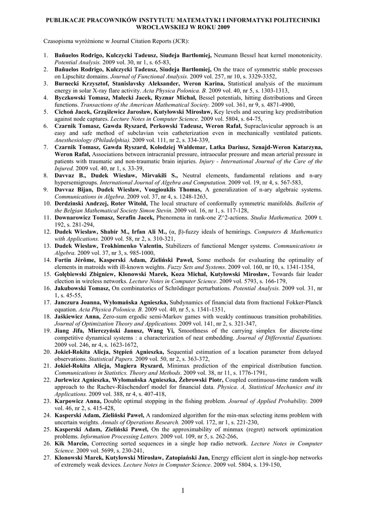 PUBLIKACJE PRACOWNIKÓW INSTYTUTU MATEMATYKI I INFORMATYKI POLITECHNIKI WROCŁAWSKIEJ W ROKU 2009 Czasopisma wyróŜnione w Journal Citation Reports (JCR): 1. 2. 3. 4. 5. 6. 7. 8. 9. 10. 11. 12. 13. 14. 15. 16. 17. 18. 19. 20. 21. 22. 23. 24. 25. 26. 27. Bañuelos Rodrigo, Kulczycki Tadeusz, Siudeja Bartłomiej, Neumann Bessel heat kernel monotonicity. Potential Analysis. 2009 vol. 30, nr 1, s. 65-83, Bañuelos Rodrigo, Kulczycki Tadeusz, Siudeja Bartłomiej, On the trace of symmetric stable processes on Lipschitz domains. Journal of Functional Analysis. 2009 vol. 257, nr 10, s. 3329-3352, Burnecki Krzysztof, Stanislavsky Aleksander, Weron Karina, Statistical analysis of the maximum energy in solar X-ray flare activity. Acta Physica Polonica. B. 2009 vol. 40, nr 5, s. 1303-1313, Byczkowski Tomasz, Małecki Jacek, Ryznar Michał, Bessel potentials, hitting distributions and Green functions. Transactions of the American Mathematical Society. 2009 vol. 361, nr 9, s. 4871-4900, Cichoń Jacek, Grząślewicz Jarosław, Kutyłowski Mirosław, Key levels and securing key predistribution against node captures. Lecture Notes in Computer Science. 2009 vol. 5804, s. 64-75, Czarnik Tomasz, Gawda Ryszard, Perkowski Tadeusz, Weron Rafał, Supraclavicular approach is an easy and safe method of subclavian vein catheterization even in mechanically ventilated patients. Anesthesiology (Philadelphia). 2009 vol. 111, nr 2, s. 334-339, Czarnik Tomasz, Gawda Ryszard, Kolodziej Waldemar, Latka Dariusz, Sznajd-Weron Katarzyna, Weron Rafał, Associations between intracranial pressure, intraocular pressure and mean arterial pressure in patients with traumatic and non-traumatic brain injuries. Injury - International Journal of the Care of the Injured. 2009 vol. 40, nr 1, s. 33-39, Davvaz B., Dudek Wiesław, Mirvakili S., Neutral elements, fundamental relations and n-ary hypersemigroups. International Journal of Algebra and Computation. 2009 vol. 19, nr 4, s. 567-583, Davvaz Bijan, Dudek Wiesław, Vougiouklis Thomas, A generalization of n-ary algebraic systems. Communications in Algebra. 2009 vol. 37, nr 4, s. 1248-1263, Derdzinski Andrzej, Roter Witold, The local structure of conformally symmetric manifolds. Bulletin of the Belgian Mathematical Society Simon Stevin. 2009 vol. 16, nr 1, s. 117-128, Downarowicz Tomasz, Serafin Jacek, Phenomena in rank-one Z^2-actions. Studia Mathematica. 2009 t. 192, s. 281-294, Dudek Wiesław, Shabir M., Irfan Ali M., (α, β)-fuzzy ideals of hemirings. Computers & Mathematics with Applications. 2009 vol. 58, nr 2, s. 310-321, Dudek Wiesław, Trokhimenko Valentin, Stabilizers of functional Menger systems. Communications in Algebra. 2009 vol. 37, nr 3, s. 985-1000, Fortin Jérôme, Kasperski Adam, Zieliński Paweł, Some methods for evaluating the optimality of elements in matroids with ill-known weights. Fuzzy Sets and Systems. 2009 vol. 160, nr 10, s. 1341-1354, Gołębiewski Zbigniew, Klonowski Marek, Koza Michał, Kutyłowski Mirosław, Towards fair leader election in wireless networks. Lecture Notes in Computer Science. 2009 vol. 5793, s. 166-179, Jakubowski Tomasz, On combinatorics of Schrödinger perturbations. Potential Analysis. 2009 vol. 31, nr 1, s. 45-55, Janczura Joanna, Wyłomańska Agnieszka, Subdynamics of financial data from fractional Fokker-Planck equation. Acta Physica Polonica. B. 2009 vol. 40, nr 5, s. 1341-1351, Jaśkiewicz Anna, Zero-sum ergodic semi-Markov games with weakly continuous transition probabilities. Journal of Optimization Theory and Applications. 2009 vol. 141, nr 2, s. 321-347, Jiang Jifa, Mierczyński Janusz, Wang Yi, Smoothness of the carrying simplex for discrete-time competitive dynamical systems : a characterization of neat embedding. Journal of Differential Equations. 2009 vol. 246, nr 4, s. 1623-1672, Jokiel-Rokita Alicja, Stępień Agnieszka, Sequential estimation of a location parameter from delayed observations. Statistical Papers. 2009 vol. 50, nr 2, s. 363-372, Jokiel-Rokita Alicja, Magiera Ryszard, Minimax prediction of the empirical distribution function. Communications in Statistics. Theory and Methods. 2009 vol. 38, nr 11, s. 1776-1791, Jurlewicz Agnieszka, Wyłomańska Agnieszka, śebrowski Piotr, Coupled continuous-time random walk approach to the Rachev-Rüschendorf model for financial data. Physica. A, Statistical Mechanics and its Applications. 2009 vol. 388, nr 4, s. 407-418, Karpowicz Anna, Double optimal stopping in the fishing problem. Journal of Applied Probability. 2009 vol. 46, nr 2, s. 415-428, Kasperski Adam, Zieliński Paweł, A randomized algorithm for the min-max selecting items problem with uncertain weights. Annals of Operations Research. 2009 vol. 172, nr 1, s. 221-230, Kasperski Adam, Zieliński Paweł, On the approximability of minmax (regret) network optimization problems. Information Processing Letters. 2009 vol. 109, nr 5, s. 262-266, Kik Marcin, Correcting sorted sequences in a single hop radio network. Lecture Notes in Computer Science. 2009 vol. 5699, s. 230-241, Klonowski Marek, Kutyłowski Mirosław, Zatopiański Jan, Energy efficient alert in single-hop networks of extremely weak devices. Lecture Notes in Computer Science. 2009 vol. 5804, s. 139-150, 1 28. Klonowski Marek, Krzywiecki Łukasz, Kutyłowski Mirosław, Lauks Anna, Step-out group signatures. Computing. 2009 vol. 85, nr 1/2, s. 137-151, 29. Klonowski Marek, Przykucki Michał, Strumiński Tomasz, Data deletion with provable security. Lecture Notes in Computer Science. 2009 vol. 5379, s. 240-255, 30. Kołodziejczyk Krzysztof, Parity properties and terminal points for lattice walks with steps of equal length. Journal of Mathematical Analysis and Applications. 2009 vol. 356, nr 1, s. 363-368, 31. Kowalski Zbigniew S, Iterations of the Frobenius-Perron operator for parabolic random maps. Fundamenta Mathematicae. 2009 vol. 202, nr 3, s. 241-250, 32. Kozłowski M, Rałowski Robert, The dielectric response with respect to the weight distribution of