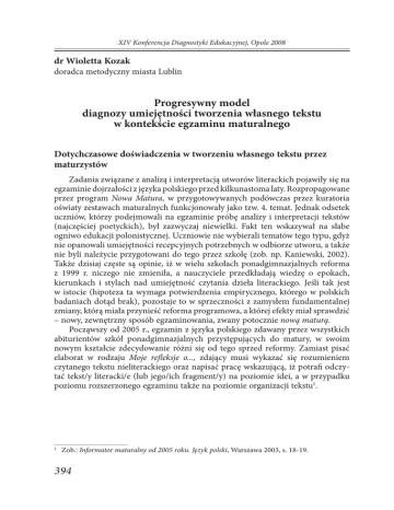 XIV Konferencja Diagnostyki Edukacyjnej, Opole 2008 dr Wioletta Kozak doradca metodyczny miasta Lublin Progresywny model diagnozy umiejętności tworzenia własnego tekstu w kontekście egzaminu maturalnego Dotychczasowe doświadczenia w tworzeniu własnego tekstu przez maturzystów Zadania związane z analizą i interpretacją utworów literackich pojawiły się na egzaminie dojrzałości z języka polskiego przed kilkunastoma laty. Rozpropagowane przez program Nowa Matura, w przygotowywanych podówczas przez kuratoria oświaty zestawach maturalnych funkcjonowały jako tzw. 4. temat. Jednak odsetek uczniów, którzy podejmowali na egzaminie próbę analizy i interpretacji tekstów (najczęściej poetyckich), był zazwyczaj niewielki. Fakt ten wskazywał na słabe ogniwo edukacji polonistycznej. Uczniowie nie wybierali tematów tego typu, gdyż nie opanowali umiejętności recepcyjnych potrzebnych w odbiorze utworu, a także nie byli należycie przygotowani do tego przez szkołę (zob. np. Kaniewski, 2002). Także dzisiaj częste są opinie, iż w wielu szkołach ponadgimnazjalnych reforma z 1999 r. niczego nie zmieniła, a nauczyciele przedkładają wiedzę o epokach, kierunkach i stylach nad umiejętność czytania dzieła literackiego. Jeśli tak jest w istocie (hipoteza ta wymaga potwierdzenia empirycznego, którego w polskich badaniach dotąd brak), pozostaje to w sprzeczności z zamysłem fundamentalnej zmiany, którą miała przynieść reforma programowa, a której efekty miał sprawdzić – nowy, zewnętrzny sposób egzaminowania, zwany potocznie nową maturą. Począwszy od 2005 r., egzamin z języka polskiego zdawany przez wszystkich abiturientów szkół ponadgimnazjalnych przystępujących do matury, w swoim nowym kształcie zdecydowanie różni się od tego sprzed reformy. Zamiast pisać elaborat w rodzaju Moje refleksje o..., zdający musi wykazać się rozumieniem czytanego tekstu nieliterackiego oraz napisać pracę wskazującą, iż potrafi odczytać tekst/y literacki/e (lub jego/ich fragment/y) na poziomie idei, a w przypadku poziomu rozszerzonego egzaminu także na poziomie organizacji tekstu1. Zob.: Informator maturalny od 2005 roku. Język polski, Warszawa 2003, s. 18-19. 1 394 Uczenie się i egzamin w oczach nauczyciela Jak więc abiturient szkoły ponadgimnazjalnej czyta tekst kultury? Przeprowadzone analizy2 dowodzą, iż przede wszytkim odczytuje tekst powierzchownie, a w przeważającej większości prac słabych i średnich dowodzi, iż nie rozumie wszystkich treści, ponadto pisze bez pogłębionej refleksji nad zawartym w temacie problemem, wreszcie nie umiejscawia dokonywanych rozważań w szerokim kontekście kulturowym. Niewielu maturzystów cechuje dociekliwość poznawcza i traktowanie tekstu literackiego jako partnera dialogu; w większości analizowanych prac przeważa podejście odtwórcze, polegające na streszczeniu opisywanych wydarzeń, tekst nie stanowi projekcji, czy też inspiracji do głębszej refleksji kulturowej, historycznej czy socjologicznej. Można więc – z dużą dozą ostrożności – przyjąć, że niekoniecznie maturzysta rozumie czytany tekst i zjawiska kultury, o których się wypowiada. Jeśli przyjmiemy, iż rozumienie czytanego tekstu może przebiegać na poziomie percepcyjnym, semantycznym, receptywnym, krytycznym i twórczym, to znaczna część prac słabych nie kwalifikuje uczniów do poziomu semantycznego, obejmującego rozumienie i interpretowanie jednostek w ciągu rosnącym: od znaczenia wyrazów, zdań do fraz, fragmentów, wreszcie całego tekstu. Pozostają oni na poziomie percepcyjnym, odnoszącym się do wyodrębniania wyrazów i zdań tekstu. W pracach dobrych dominuje poziom krytyczny, polegający na ocenie przedstawionych danych. Natomiast pisanie własnego tekstu w oparciu o załączone fragmenty i znajomość całości utworu odzwierciedla umiejętność czytania literatury i szerzej – tekstów kultury. Ponieważ kultura jest, jak pisze M. Jędrychowska, przepływem wśród ludzi znaków, które nie tylko znaczą, ale i niosą z sobą wartości3, w tym kontekście bezsporne wydaje się twierdzenie, iż dzięki kształceniu umiejetności recepcji, analizy i interpretacji tekstu kultury, kszałtujemy także samodzielność w myśleniu i działaniu oraz uczymy sztuki porozumiewania się. Jaką więc samodzielnością, jakimi umiejętnościami komunikacyjnymi wykazują się maturzyści na egzaminie? Przede wszystkim autorzy prac słabych i średnich są niesamodzielni. Ich brak samodzielności polega na naśladownictwie, częstym przyjmowaniu stylu załączonego fragmentu poprzez wprowadzanie, np. form archaicznych, a także na odtwarzaniu lub parafrazowaniu treści zawartych w przedstawionych fragmentach. W pracach słabych i średnich dominuje czytanie na poziomie znaczeń dosłownych, polegające na wiernym odzwierciedlaniu przedstawionych treści, z tym że w pracach słabych jest ono bezkrytyczne, często są to przepisywane lub tylko lekko modyfikowane frazy z załączonych fragmentów, prace średnie zawierają raczej parafrazy powieści. Natomiast prace najlepsze, poza próbami czytania metaforycznego, mają w większym stopniu W. Kozak, B. Mlonka, Osiągnięcia w zakresie rozumienia, analizy i interpretacji tekstów kultury na przykładzie matury z języka polskiego, Raport z badań przeprowadzonych na zlecenie Centralnej Komisji Egzaminacyjnej w ramach współfinansowanego przez EFS projektu Badania dotyczące wyników egzaminów zewnętrznych w obszarze Uwarunkowania pedagogiczne zróżnicowania wyników egzaminów zewnętrznych, Warszawa 2007. 2 M. Jędrychowska, Najpierw człowiek¸ Kraków 1998. 3 395 XIV Konferencja Diagnostyki Edukacyjnej, Opole 2008 cechy czytania wartościującego, polegającego na wyodrębnianiu aspektu moralnego i aksjologicznego omawianego problemu. W niewielkim stopniu wyeksponowana jest w pracach świadomość kulturowa odbiorcy. By ten proces mógł zaistnieć, odbi