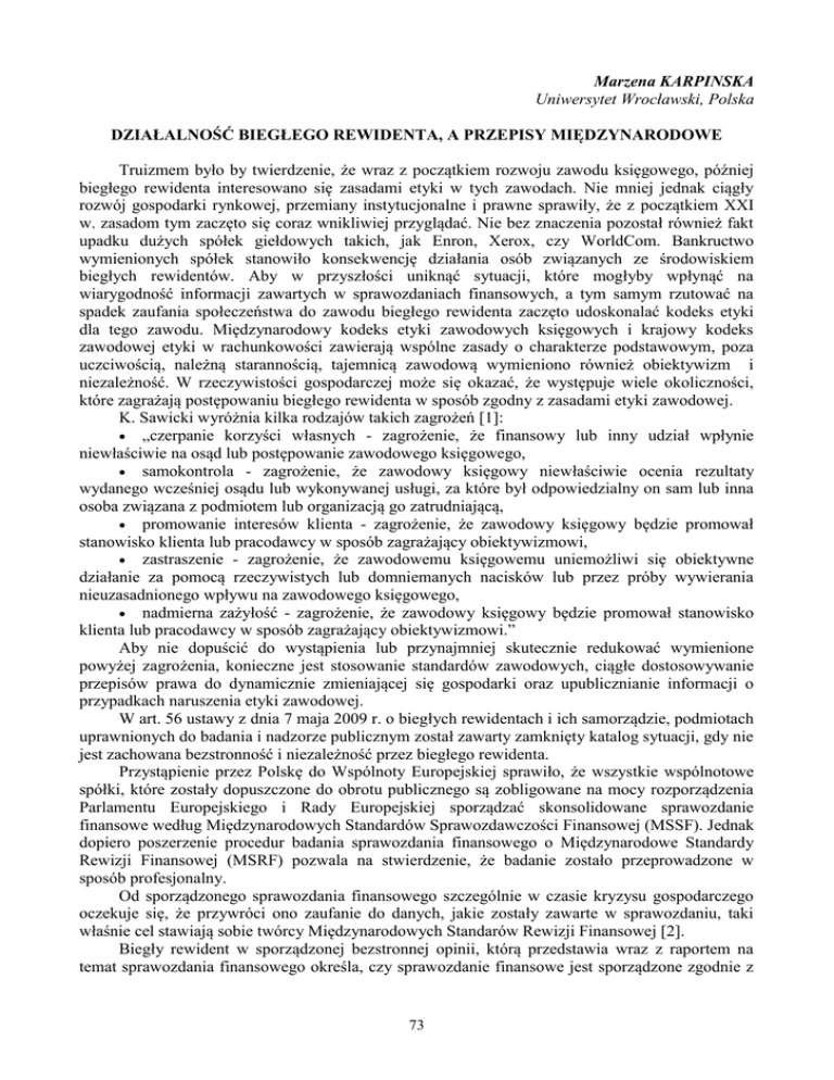 Marzena KARPINSKA Uniwersytet Wrocławski, Polska DZIAŁALNOŚĆ BIEGŁEGO REWIDENTA, A PRZEPISY MIĘDZYNARODOWE Truizmem było by twierdzenie, że wraz z początkiem rozwoju zawodu księgowego, później biegłego rewidenta interesowano się zasadami etyki w tych zawodach. Nie mniej jednak ciągły rozwój gospodarki rynkowej, przemiany instytucjonalne i prawne sprawiły, że z początkiem XXI w. zasadom tym zaczęto się coraz wnikliwiej przyglądać. Nie bez znaczenia pozostał również fakt upadku dużych spółek giełdowych takich, jak Enron, Xerox, czy WorldCom. Bankructwo wymienionych spółek stanowiło konsekwencję działania osób związanych ze środowiskiem biegłych rewidentów. Aby w przyszłości uniknąć sytuacji, które mogłyby wpłynąć na wiarygodność informacji zawartych w sprawozdaniach finansowych, a tym samym rzutować na spadek zaufania społeczeństwa do zawodu biegłego rewidenta zaczęto udoskonalać kodeks etyki dla tego zawodu. Międzynarodowy kodeks etyki zawodowych księgowych i krajowy kodeks zawodowej etyki w rachunkowości zawierają wspólne zasady o charakterze podstawowym, poza uczciwością, należną starannością, tajemnicą zawodową wymieniono również obiektywizm i niezależność. W rzeczywistości gospodarczej może się okazać, że występuje wiele okoliczności, które zagrażają postępowaniu biegłego rewidenta w sposób zgodny z zasadami etyki zawodowej. K. Sawicki wyróżnia kilka rodzajów takich zagrożeń [1]: „czerpanie korzyści własnych - zagrożenie, że finansowy lub inny udział wpłynie niewłaściwie na osąd lub postępowanie zawodowego księgowego, samokontrola - zagrożenie, że zawodowy księgowy niewłaściwie ocenia rezultaty wydanego wcześniej osądu lub wykonywanej usługi, za które był odpowiedzialny on sam lub inna osoba związana z podmiotem lub organizacją go zatrudniającą, promowanie interesów klienta - zagrożenie, że zawodowy księgowy będzie promował stanowisko klienta lub pracodawcy w sposób zagrażający obiektywizmowi, zastraszenie - zagrożenie, że zawodowemu księgowemu uniemożliwi się obiektywne działanie za pomocą rzeczywistych lub domniemanych nacisków lub przez próby wywierania nieuzasadnionego wpływu na zawodowego księgowego, nadmierna zażyłość - zagrożenie, że zawodowy księgowy będzie promował stanowisko klienta lub pracodawcy w sposób zagrażający obiektywizmowi.” Aby nie dopuścić do wystąpienia lub przynajmniej skutecznie redukować wymienione powyżej zagrożenia, konieczne jest stosowanie standardów zawodowych, ciągłe dostosowywanie przepisów prawa do dynamicznie zmieniającej się gospodarki oraz upublicznianie informacji o przypadkach naruszenia etyki zawodowej. W art. 56 ustawy z dnia 7 maja 2009 r. o biegłych rewidentach i ich samorządzie, podmiotach uprawnionych do badania i nadzorze publicznym został zawarty zamknięty katalog sytuacji, gdy nie jest zachowana bezstronność i niezależność przez biegłego rewidenta. Przystąpienie przez Polskę do Wspólnoty Europejskiej sprawiło, że wszystkie wspólnotowe spółki, które zostały dopuszczone do obrotu publicznego są zobligowane na mocy rozporządzenia Parlamentu Europejskiego i Rady Europejskiej sporządzać skonsolidowane sprawozdanie finansowe według Międzynarodowych Standardów Sprawozdawczości Finansowej (MSSF). Jednak dopiero poszerzenie procedur badania sprawozdania finansowego o Międzynarodowe Standardy Rewizji Finansowej (MSRF) pozwala na stwierdzenie, że badanie zostało przeprowadzone w sposób profesjonalny. Od sporządzonego sprawozdania finansowego szczególnie w czasie kryzysu gospodarczego oczekuje się, że przywróci ono zaufanie do danych, jakie zostały zawarte w sprawozdaniu, taki właśnie cel stawiają sobie twórcy Międzynarodowych Standarów Rewizji Finansowej [2]. Biegły rewident w sporządzonej bezstronnej opinii, którą przedstawia wraz z raportem na temat sprawozdania finansowego określa, czy sprawozdanie finansowe jest sporządzone zgodnie z 73 przepisami ustawy o rachunkowości, tzn. sposób jasny i niebudzący wątpliwości przedstawia sytuację majątkową oraz wynik finansowy przedsiębiorstwa [2]. Zgodnie z Międzynarodowymi Standardami Rewizji Finansowej uzyskanie przez biegłego rewidenta wystarczającej pewności, co to tego, że sprawozdanie finansowe nie posiada istotnego błędu bądź oszustwa stanowi podstawę do wydania opinii. Uzyskanie wystarczającej pewności jest możliwe, tylko wtedy, gdy audytor dokonując badania zebrał wszelkie dowody, które umożliwiłyby zmniejszenie ryzyka, jakie niesie z sobą owe badanie. Zarówno Międzynarodowe Standardy Rewizji Finansowej jak również Krajowe Standardy Rewizji Finansowej przypisują spore znaczenie oszacowaniu właśnie ryzyka, które definiują, jako możliwość niewłaściwego wydania opinii o badaniu [2]. Międzynarodowe Standardy Rewizji Finansowej w jasny sposób określają sam cel badania, a mianowicie stawiają przed audytorem obowiązek wykrywania istotnych oszustw, niestety tak jasnego i ewidentnego stanowiska nie widać w polskich przepisach, które na domiar złego wprowadzają pewien chaos. „Stwierdzenie, że zadaniem biegłego rewidenta przeprowadzającego badanie sprawozdania finansowego – o ile nie zobowiązuje go do tego umowa o badanie – nie jest poszukiwanie możliwych nadużyć, błędów lub naruszeń prawa” [2] można uznać za sprzeczne z podstawowym celem badania. Analizując przepisy można by przypuszczać, że na biegłym rewidencie nie spoczywa obowiązek wykrywania oszustw finansowych, nawet tych, które miałby istotny wpływ na prezentowany wynik finansowy. Nic bardziej mylnego, podsumowując powyższe rozważania można wysnuć generalny wniosek, że każde oszustwo, które mogłoby mieć istotny wpływ na sprawozdanie finansowe powinno podlegać szczególnej uwadze biegłych rewidentów [2]. Literatura: 1. K. Sawicki, Obiektywizm i