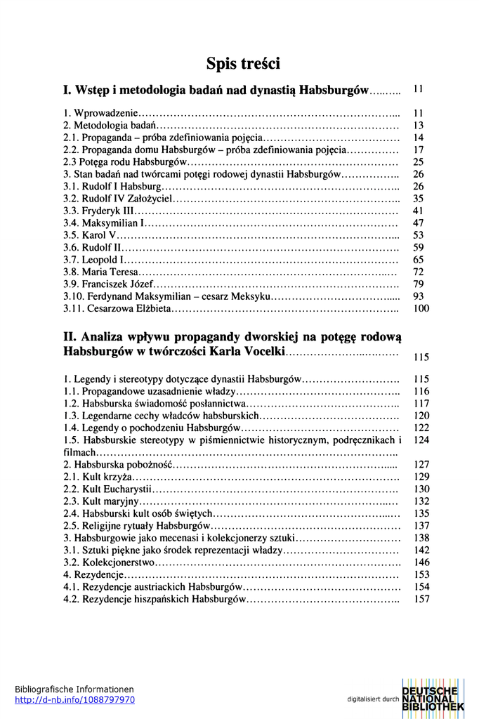 Spis treści 1· ١ Vs،؟p i metodologia badań nad dynastią Habsburgów.. .... .... 5 6 7 7 9 1 ٠ 5 1 11222 1 1 1 1 5 1 2 1 4 2 2 1 1 7 3 1 . 3 33344555 1 1 1 1 1 1 2 1 3 1 4 1 7 6 1 1 7 . 9 5 7 8 2 6 ا. Legendy i stereotypy dotyczące dynastii Habsburgów........................................ 1.1· Propagandowe uzasadnienie władzy.................................................................... 1.2. Habsburska świadomość posłannictwa............................................................... 1.3. Legendarne cechy władców habsburskich.......................................................... 1•4. Legendy o pochodzeniu Habsburgów................................................................. 1.5. Habsburskie stereotypy w piśmiennictwie historycznym ,podręcznikach i filmach.................................................................................................. . 2. Habsburska pobożność.............................................................................................. 2.1. Kult krzyża............................................................................................................... 2.2. Kult Eucharystii....................................................................................................... 2.3· Kult maryjny............................................................................................................ 2.4· Habsburski kult osób świętych.............................................................................. 2.5· Religijne rytuały Habsburgów............................................................................... 3· Habsburgowie jako mecenasi 1 kolekcjonerzy sztuki........................................... 3.1· Sztuki piękne jako środek reprezentacji władzy................................................ 3.2. Kolekcjonerstwo....................................................................................................... 4. Rezydencje................................................................................................................... 4.1. Rezydencje austriackich Habsburgów............................................................... 4.2· Rezydencje hiszpańskich Habsburgów............................................................... 5 11· Analiza wpływu propagandy dworskiej na potęgę rodową Habsburgów w twórczości Karta Voceiki................................... 1 31 4 71 5 616 5 17 32 9 53 2 943 0 1 2 2 4 1. Wprowadzenie............................................................................................................. 2· Metodologia badań..................................................................................................... 2 . ا. Propaganda —próba zdefiniowania pojęcia..................................................... 2.2· Propaganda domu Habsburgów —próba zdefiniowania poj ؟cia. ·.···.···...·. 2.3 Potęga rodu Habsburgów........................................................................................ 3. Stan badań nad twórcami potęgi rodowej dynastii Habsburgów................. 3.1· Rudolf I Habsburg................................................................................................... 3.2. Rudolf IV Założyciel............................................................................................... 3.3. Fryderyk 111••…:… … ··… … … ·… ··… … … … ··… ·… ·… ··… … … …… … · 3.4· Maksymilian I.......................................................................................................... 3.5· Karol V ...................................................................................................................... 3.6· Rudolf II.................................................................................................................... 3.7. Leopold I.................................................................................................................. 3.8. Maria Teresa............................................................................................................ 3.9· Franciszek Józef....................................................................................................... 3.10. Ferdynand Maksymilian - cesarz Meksyku..................................................... 3.11• Cesarzowa Elżbieta............................................................................................... 4.3. Rezydencje klasztorne........................................................................................... 5. Ceremoniały dworskie................................................................................................ 5· ا. Ceremonial burgundzko-hiszpáski..................................................................... 5.2. Ceremóniái wiedeński......................................................................................... 6. Święta i uroczystości dworskie Habsburgów....................................................... 6.1. Turnieje i teatr.......................................................................................................... 6.2· Triumf władcy.......................................................................................................... 6.3· Rytuały przejścia..................................................................................................... 6.4. Uroczystości ostatniego wieku monarchii habsburskiej - jubileusze i bale dworskie............................................................................................................................. 7. Wojny z Turcją........................................................................................................... 8. Symbole władzy i insygnia........................................................................................ 8.1. Kapelusz arcyksiążęcy.....................................................