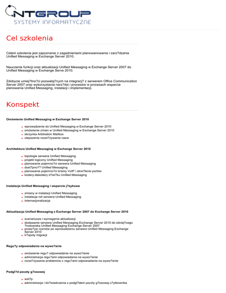 Cel szkolenia Celem szkolenia jest zapoznanie z zagadnieniami planowanowania i zarz?dzania Unified Messaging w Exchange Server 2010. Nauczenie funkcji oraz aktualizacji Unified Messaging w Exchange Server 2007 do Unified Messaging w Exchange Serve 2010. Zdobycie umiej?tno?ci pozwalaj?cych na integracj? z serwerem Office Communication Server 2007 oraz wykorzystania narz?dzi i procesów w procesach wsparcia planowania Unified Messaging, instalacji i implementacji. Konspekt Omówienie Unified Messaging w Exchange Server 2010 wprowadzenie do Unified Messaging w Exchange Server 2010 omówienie zmian w Unified Messaging w Exchange Server 2010 skrzynka Arbitration Mailbox ulepszenia rozwi?zywania nazw Architektura Unified Messaging w Exchange Server 2010 topologie serwera Unified Messaging projekt logiczny Unified Messaging planowanie pojemno?ci serwera Unified Messaging dost?pno?? Unified Messaging planowanie pojemno?ci bramy VoIP i okre?lenie portów kodery-dekodery d?wi?ku Unified Messaging Instalacja Unified Messaging i wsparcie j?zykowe zmiany w instalacji Unified Messaging instalacja roli serwera Unified Messaging internacjonalizacja Aktualizacja Unified Messaging z Exchange Server 2007 do Exchange Server 2010 scenariusze i wymagania aktualizacji dodawanie serwera Unified Messaging Exchange Server 2010 do istniej?cego ?rodowiska Unified Messaging Exchange Server 2007 przep?yw rozmów po wprowadzeniu serwera Unified Messaging Exchange Server 2010 k?opoty migracji Regu?y odpowiadania na wywo?anie omówienie regu? odpowiadania na wywo?anie administracja regu?ami odpowiadania na wywo?anie rozwi?zywanie problemów z regu?ami odpowiadania na wywo?anie Podgl?d poczty g?osowej wst?p administracja i do?wiadczenia z podgl?dem poczty g?osowej u?ytkownika Chroniona poczta g?osowa omówienie chronionej poczty g?osowej us?uga Active Directory Rights Management Service wspieranie operacji chronionej poczty g?osowej implementacja chronionej poczty g?osowej Wska?nik wiadomo?ci oczekuj?cej wst?p konfiguracja wska?nika wiadomo?ci oczekuj?cej projektow wska?nika wiadomo?ci oczekuj?cej i wsparcie Nazwa: Szkolenie MS 10508 Planning, Deploying, and Managing Microsoft Exchange Server 2010 Unified Messaging Us?uga faksowania z Unified Messaging w Exchange Server 2010 omówienie us?ugi faksowania konfiguracja us?ugi faksów Czas trwania: 5 dni Ilość godzin: Integracja Office Communications Server 2007 R2 z serwerem Unified Messaging Exchange Server 2010 Język: integracja OCS 2007 R2 i serwera Unified Messaging Exchange Server 2010 integracja OCS 2007 R2 z Outlook Web App Dodatkowe informacje W cenę szkolenia wliczony jest: Certyfikat Microsoft Materiały szkoleniowe, notatnik, długopis Kontakt z trenerem po szkoleniu Kawa, herbata, słodki poczęstunek Obiad 40 Prowadzący: Certyfikowany trener Microsoft Lokalizacja: NT Group Łódź, siedziba klienta, lub dowolne miasto w Polsce Cena szkolenia: 3500 PLN Dostępne terminy NT GROUP Sp. z o.o. 90-418 Łódź, Al. T. Kościuszki 39 III piętro Firma posiada wpis w Urzędzie Miasta Łodzi jako placówka kształcenia ustawicznego. infolina 801 011 684 Tel.: +48 42 655-33-77; Fax: +48 42 630-15-63 e-mail: [email protected] NT Group Systemy Informatyczne Sp. z o.o. Krajowy Rejestr Sądowy Konto Bankowe 90-418 Łódź, Al. T. Kościuszki 39 III piętro KRS 0000214993 Kredyt Bank S.A. tel.: +42 6553377 Sąd Rejonowy dla Łodzi-Śródmieścia Rozliczenie Krajowe: tel. / fax. +42 6301563 w Łodzi, XX Wydział KRS 71 1500 1246 1215 4005 5991 0000 e-mail: [email protected] www.ntgroup.pl Rozliczenie Zagraniczne: Regon: 470557218 PL 71 1500 1246 1215 4005 5991 0000 NIP: 7251888624 KRDBPLPW