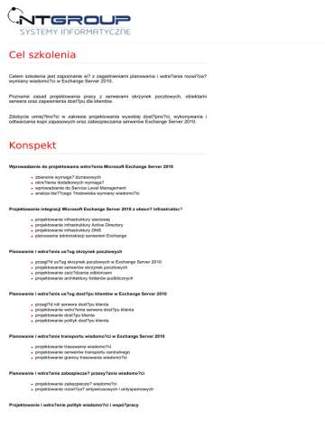 Cel szkolenia Celem szkolenia jest zapoznanie si? z zagadnieniami planowania i wdra?ania rozwi?za? wymiany wiadomo?ci w Exchange Server 2010. Poznanie zasad projektowania pracy z serwerami skrzynek pocztowych, obiektami serwera oraz zapewnienia dost?pu dla klientów. Zdobycie umiej?tno?ci w zakresie projektowania wysokiej dost?pno?ci, wykonywania i odtwarzania kopii zapasowych oraz zabezpieczania serwerów Exchange Server 2010. Konspekt Wprowadzenie do projektowania wdro?enia Microsoft Exchange Server 2010 zbieranie wymaga? biznesowych okre?lenie dodatkowych wymaga? wprowadzenie do Service Level Management analiza bie??cego ?rodowiska wymiany wiadomo?ci Projektowanie integracji Microsoft Exchange Server 2010 z obecn? infrastruktur? projektowanie infrastruktury sieciowej projektowanie infrastruktury Active Directory projektowanie infrastruktury DNS planowanie administracji serwerem Exchange Planowanie i wdra?anie us?ug skrzynek pocztowych przegl?d us?ug skrzynek pocztowych w Exchange Server 2010 projektowanie serwerów skrzynek pocztowych projektowanie zarz?dzania odbiorcami projektowanie architektury folderów pudblicznych Planowanie i wdra?anie us?ug dost?pu klientów w Exchange Server 2010 przegl?d roli serwera dost?pu klienta projektowanie wdro?enia serwera dost?pu klienta projektowanie dost?pu klienta projektowanie polityk dost?pu klienta Planowanie i wdra?anie transportu wiadomo?ci w Exchange Server 2010 projektowanie trasowania wiadomo?ci projektowanie serwerów transportu centralnego projektowanie granicy trasowania wiadomo?ci Planowanie i wdra?anie zabezpiecze? przesy?ania wiadomo?ci projektowanie zabezpiecze? wiadomo?ci projektowanie rozwi?za? antywirusowych i antyspamowych Projektowanie i wdra?anie polityk wiadomo?ci i wspó?pracy projektowanie zgodno?ci przesy?ania projektowanie integracji AD RMS z Exchange Server 2010 projektowanie rejestrowania i archiwizacji projektowanie zarz?dzania rekordami wiadomo?ci Planowanie i wdra?anie wysokiej dost?pno?ci wprowadzenie do planowania wysokiej dost?pno?ci projektowanie wysokiej dost?pno?ci dla bazy skrzynek pocztowych projektowanie wysokiej dost?pno?ci dla innych ról serwera planowanie odporno?ci lokacji Nazwa: Planowanie rozwi?za? odtwarzania awaryjnego planowanie rozwi?za? zmniejszania awarii planowanie kopii zapasowych serwera planowanie odtwarzania kopii zapasowych serwera Szkolenie MS 10233 Designing and Deploying Messaging Solutions with Microsoft Exchange Server 2010 Czas trwania: 1 dni Planowanie monitorowania i rozwi?zywania problemów z Exchange Server 2010 Ilość godzin: planowanie monitorowania Exchange Server planowanie rozwi?zywania problemów z Exchange Server Język: Prowadzący: Certyfikowany trener Microsoft Lokalizacja: NT Group Łódź, siedziba klienta, lub dowolne miasto w Polsce Cena szkolenia: 1400 PLN Aktualizacja do Exchange Server 2010 przegl?d zagadnie? aktualizacji planowanie aktualizacji z Exchange Server 2003 do Exchange Server 2010 planowanie aktualizacji z Exchange Server 2007 do Exchange Server 2010 Integracja Exchange Server 2010 z innymi systemami pocztowymi projektowanie integracji Exchange Server 2010 z innymi systemami pocztowymi projektowanie integracji Exchange Server 2010 z partnerami federacji projektowanie integracji z Exchange Online Dostępne terminy NT GROUP Sp. z o.o. 90-418 Łódź, Al. T. Kościuszki 39 III piętro Dodatkowe informacje infolina 801 011 684 Tel.: +48 42 655-33-77; Fax: +48 42 630-15-63 e-mail: [email protected] W cenę szkolenia wliczony jest: Certyfikat Microsoft Materiały szkoleniowe, notatnik, długopis Kontakt z trenerem po szkoleniu Kawa, herbata, słodki poczęstunek Obiad Firma posiada wpis w Urzędzie Miasta Łodzi jako placówka kształcenia ustawicznego. NT Group Systemy Informatyczne Sp. z o.o. Krajowy Rejestr Sądowy Konto Bankowe 90-418 Łódź, Al. T. Kościuszki 39 III piętro KRS 0000214993 Kredyt Bank S.A. tel.: +42 6553377 Sąd Rejonowy dla Łodzi-Śródmieścia Rozliczenie Krajowe: tel. / fax. +42 6301563 w Łodzi, XX Wydział KRS 71 1500 1246 1215 4005 5991 0000 e-mail: [email protected] www.ntgroup.pl Rozliczenie Zagraniczne: Regon: 470557218 PL 71 1500 1246 1215 4005 5991 0000 NIP: 7251888624 KRDBPLPW