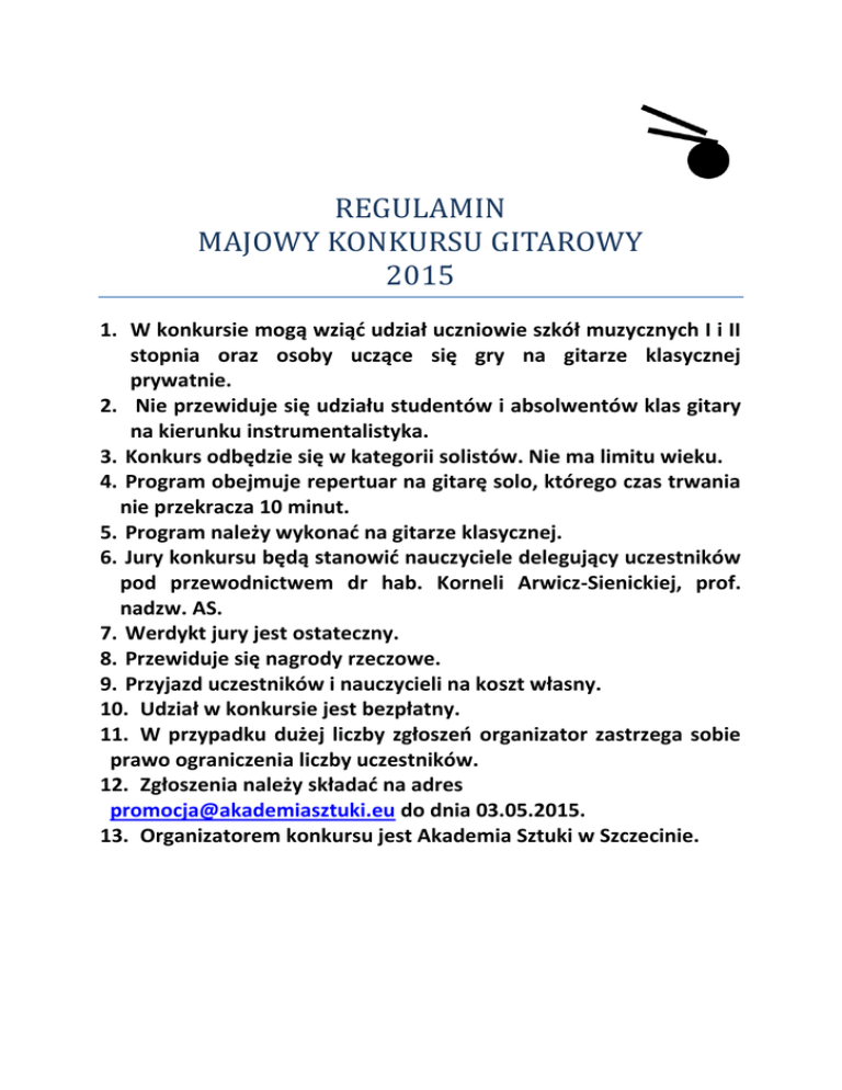 REGULAMIN MAJOWY KONKURSU GITAROWY 2015 1. W konkursie mogą wziąć udział uczniowie szkół muzycznych I i II stopnia oraz osoby uczące się gry na gitarze klasycznej prywatnie. 2. Nie przewiduje się udziału studentów i absolwentów klas gitary na kierunku instrumentalistyka. 3. Konkurs odbędzie się w kategorii solistów. Nie ma limitu wieku. 4. Program obejmuje repertuar na gitarę solo, którego czas trwania nie przekracza 10 minut. 5. Program należy wykonać na gitarze klasycznej. 6. Jury konkursu będą stanowić nauczyciele delegujący uczestników pod przewodnictwem dr hab. Korneli Arwicz-Sienickiej, prof. nadzw. AS. 7. Werdykt jury jest ostateczny. 8. Przewiduje się nagrody rzeczowe. 9. Przyjazd uczestników i nauczycieli na koszt własny. 10. Udział w konkursie jest bezpłatny. 11. W przypadku dużej liczby zgłoszeń organizator zastrzega sobie prawo ograniczenia liczby uczestników. 12. Zgłoszenia należy składać na adres [email protected] do dnia 03.05.2015. 13. Organizatorem konkursu jest Akademia Sztuki w Szczecinie.