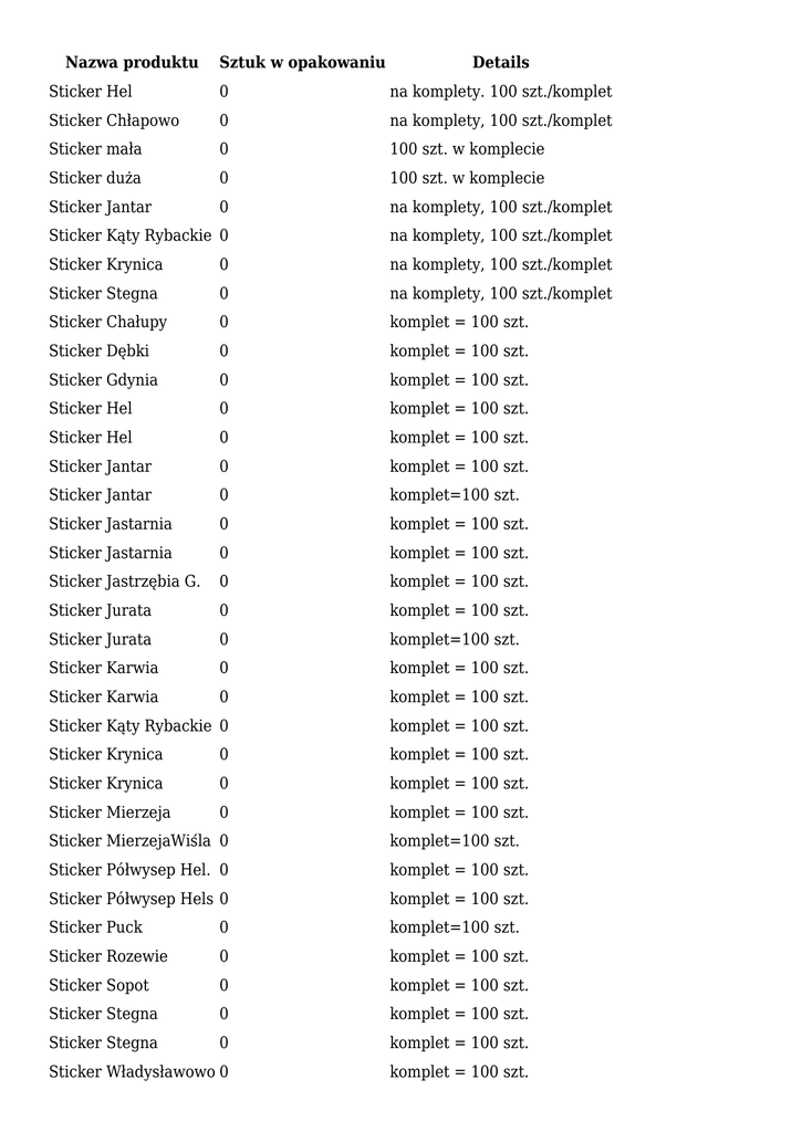 Nazwa produktu Sztuk w opakowaniu Details Sticker Hel 0 na komplety. 100 szt./komplet Sticker Chłapowo 0 na komplety, 100 szt./komplet Sticker mała 0 100 szt. w komplecie Sticker duża 0 100 szt. w komplecie Sticker Jantar 0 na komplety, 100 szt./komplet Sticker Kąty Rybackie 0 na komplety, 100 szt./komplet Sticker Krynica 0 na komplety, 100 szt./komplet Sticker Stegna 0 na komplety, 100 szt./komplet Sticker Chałupy 0 komplet = 100 szt. Sticker Dębki 0 komplet = 100 szt. Sticker Gdynia 0 komplet = 100 szt. Sticker Hel 0 komplet = 100 szt. Sticker Hel 0 komplet = 100 szt. Sticker Jantar 0 komplet = 100 szt. Sticker Jantar 0 komplet=100 szt. Sticker Jastarnia 0 komplet = 100 szt. Sticker Jastarnia 0 komplet = 100 szt. Sticker Jastrzębia G. 0 komplet = 100 szt. Sticker Jurata 0 komplet = 100 szt. Sticker Jurata 0 komplet=100 szt. Sticker Karwia 0 komplet = 100 szt. Sticker Karwia 0 komplet = 100 szt. Sticker Kąty Rybackie 0 komplet = 100 szt. Sticker Krynica 0 komplet = 100 szt. Sticker Krynica 0 komplet = 100 szt. Sticker Mierzeja 0 komplet = 100 szt. Sticker MierzejaWiśla 0 komplet=100 szt. Sticker Półwysep Hel. 0 komplet = 100 szt. Sticker Półwysep Hels 0 komplet = 100 szt. Sticker Puck 0 komplet=100 szt. Sticker Rozewie 0 komplet = 100 szt. Sticker Sopot 0 komplet = 100 szt. Sticker Stegna 0 komplet = 100 szt. Sticker Stegna 0 komplet = 100 szt. Sticker Władysławowo 0 komplet = 100 szt. Nazwa produktu Sztuk w opakowaniu Details Sticker Gdańsk 0 na komplety, 100 szt./komplet Sticker Gdynia 0 na komplety, 100 szt./komplet Sticker Giżycko 0 na komplety, 100 szt./komplet Sticker Jastarnia 0 na komplety, 100 szt./komplet Sticker Karwia 0 na komplety, 100 szt./komplet Sticker Łeba 0 na komplety, 100 szt./komplet Sticker Rowy 0 na komplety, 100 szt./komplet Sticker Ustka 0 na komplety, 100 szt./komplet Sticker Władysławowo 0 na komplety, 100 szt./komplet
