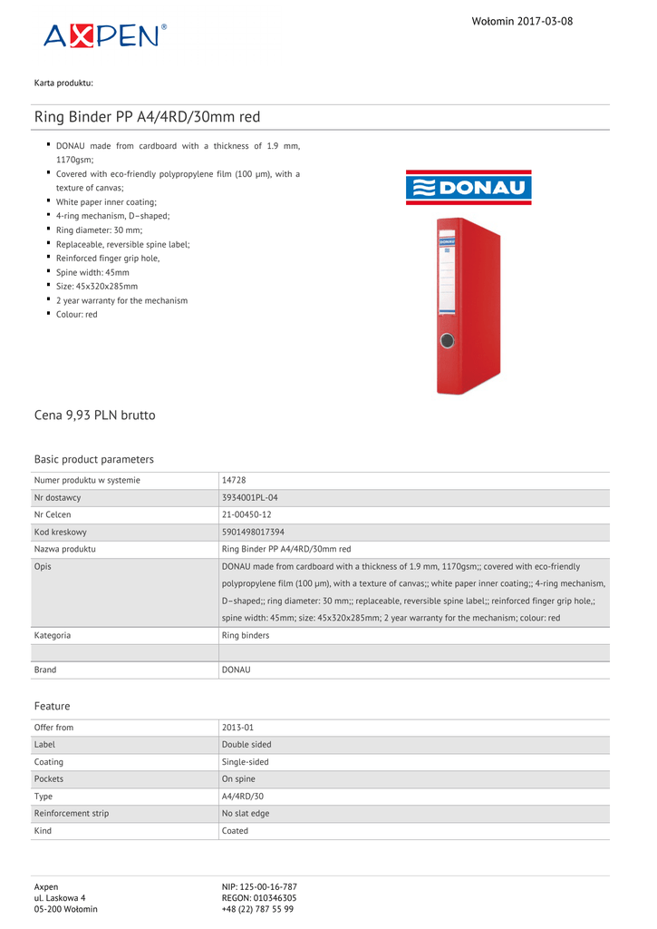 Wołomin 2017-03-08 Karta produktu: Ring Binder PP A4/4RD/30mm red DONAU made from cardboard with a thickness of 1.9 mm, 1170gsm; Covered with eco-friendly polypropylene film (100 µm), with a texture of canvas; White paper inner coating; 4-ring mechanism, D–shaped; Ring diameter: 30 mm; Replaceable, reversible spine label; Reinforced finger grip hole, Spine width: 45mm Size: 45x320x285mm 2 year warranty for the mechanism Colour: red Cena 9,93 PLN brutto Basic product parameters Numer produktu w systemie 14728 Nr dostawcy 3934001PL-04 Nr Celcen 21-00450-12 Kod kreskowy 5901498017394 Nazwa produktu Ring Binder PP A4/4RD/30mm red Opis DONAU made from cardboard with a thickness of 1.9 mm, 1170gsm;; covered with eco-friendly polypropylene film (100 µm), with a texture of canvas;; white paper inner coating;; 4-ring mechanism, D–shaped;; ring diameter: 30 mm;; replaceable, reversible spine label;; reinforced finger grip hole,; spine width: 45mm; size: 45x320x285mm; 2 year warranty for the mechanism; colour: red Kategoria Ring binders Brand DONAU Feature Offer from 2013-01 Label Double sided Coating Single-sided Pockets On spine Type A4/4RD/30 Reinforcement strip No slat edge Kind Coated Axpen ul. Laskowa 4 05-200 Wołomin NIP: 125-00-16-787 REGON: 010346305 +48 (22) 787 55 99 Wołomin 2017-03-08 Karta katalogowa produktu cd. Ring Binder PP A4/4RD/30mm red Product Binder Material Cardboard/pp Dimensions Format A4 Dimensions (mm) 45x320x285 Thickness (mm) 100 Width (mm) 45 Weight (g/m2) 1170 Cardboard (mm) 1,9 Procurement vocabulary CPV 30199500-5 Segregatory, pudełka na listy, pudełka do przechowywania i podobne wyroby Certifications Warranty 2 New product Standard Hit Standard Colour Colour Red Pozostałe zdjęcia produktu Serdecznie zapraszamy do współpracy Axpen zespół. Axpen ul. Laskowa 4 05-200 Wołomin NIP: 125-00-16-787 REGON: 010346305 +48 (22) 787 55 99