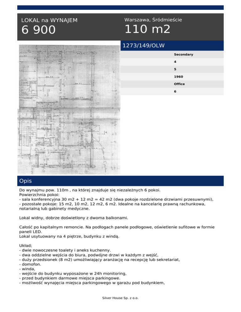 LOKAL na WYNAJEM 6 900 Warszawa, Śródmieście 110 m2 1273/149/OLW Secondary 4 5 1960 Office 6 Opis Do wynajmu pow. 110m , na której znajduje się niezależnych 6 pokoi. Powierzchnia pokoi: - sala konferencyjna 30 m2 + 12 m2 = 42 m2 (dwa pokoje rozdzielone drzwiami przesuwnymi), - pozostałe pokoje: 15 m2, 10 m2, 12 m2, 6 m2. Idealne na kancelarię prawną rachunkowa, notarialną lub gabinety medyczne. Lokal widny, dobrze doświetlony z dwoma balkonami. Całość po kapitalnym remoncie. Na podłogach panele podłogowe, oświetlenie sufitowe w formie paneli LED. Lokal usytuowany na 4 piętrze, budynku z windą. Układ; - dwie nowoczesne toalety i aneks kuchenny. - dwa oddzielne wejścia do biura, podwójne drzwi w każdym z wejść, - duży przedsionek (8 m2) umożliwiający aranżację na recepcję lub sekretariat, - domofon. - winda, - wejście do budynku wyposażone w 24h monitoring, - przed budynkiem darmowe miejsca parkingowe. - możliwość wynajęcia miejsca parkingowego w garażu pod budynkiem, Silver House Sp. z o.o. - łatwy dojazd autobusami wzdłuż ul. Belwederskiej, - kawiarnie oraz lokale gastronomiczne zlokalizowane w pobliżu: za rogiem kafejka serwująca kanapki i napoje, w pobliżu restauracja „Dzik” umożliwiająca lunche firmowe, Hotel Poselski w odległości 200 m. KOSZTY Czynsz najmu: 6900 zł/mies + media: woda i prąd (liczniki). *Informacje zawarte w opisie nieruchomości nie stanowią oferty w rozumieniu Kodeksu Cywilnego. Dążymy do tego, aby informacje zawarte w opisach oferowanych przez nas nieruchomości były możliwie dokładne, kompletne i aktualne. Z uwagi jednak na fakt, iż czasami pochodzą one od osób trzecich i część z nich nie zawsze daje się zweryfikować, Silver House Sp. z o.o. nie ponosi odpowiedzialności za ich dokładność, kompletność i aktualność. Anna Różańska tel. 509 513 153 tel. (22) 319 80 00 email: [email protected] Silver House Sp. z o.o. Powered by TCPDF (www.tcpdf.org)