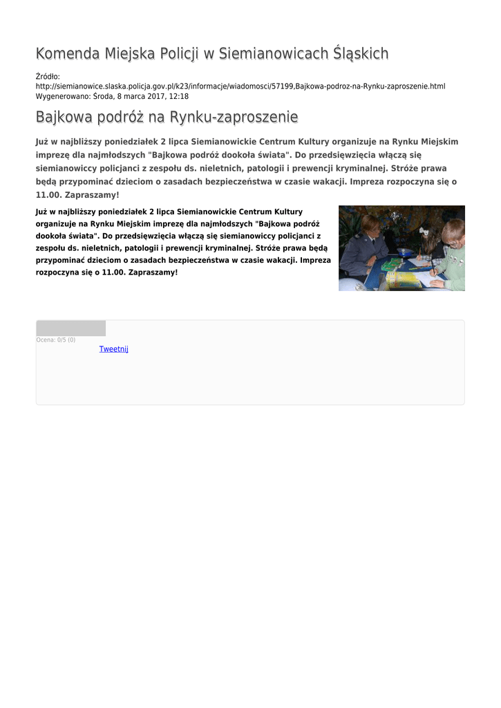 Komenda Miejska Policji w Siemianowicach Śląskich Źródło: http://siemianowice.slaska.policja.gov.pl/k23/informacje/wiadomosci/57199,Bajkowa-podroz-na-Rynku-zaproszenie.html Wygenerowano: Środa, 8 marca 2017, 12:18 Bajkowa podróż na Rynku-zaproszenie Już w najbliższy poniedziałek 2 lipca Siemianowickie Centrum Kultury organizuje na Rynku Miejskim imprezę dla najmłodszych "Bajkowa podróż dookoła świata". Do przedsięwzięcia włączą się siemianowiccy policjanci z zespołu ds. nieletnich, patologii i prewencji kryminalnej. Stróże prawa będą przypominać dzieciom o zasadach bezpieczeństwa w czasie wakacji. Impreza rozpoczyna się o 11.00. Zapraszamy! Już w najbliższy poniedziałek 2 lipca Siemianowickie Centrum Kultury organizuje na Rynku Miejskim imprezę dla najmłodszych "Bajkowa podróż dookoła świata". Do przedsięwzięcia włączą się siemianowiccy policjanci z zespołu ds. nieletnich, patologii i prewencji kryminalnej. Stróże prawa będą przypominać dzieciom o zasadach bezpieczeństwa w czasie wakacji. Impreza rozpoczyna się o 11.00. Zapraszamy! Ocena: 0/5 (0) Tweetnij