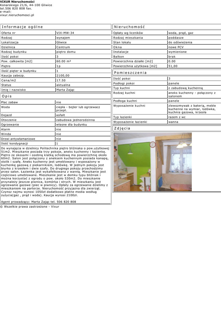VIXUR Nieruchomości Konarskiego 21/6, 44-100 Gliwice tel.506 820 808 fax. e-mail: vixur.nieruchomosci.pl Informacje ogólne Nieruchomość Oferta nr VIX-MW-34 Opłaty wg liczników woda, prąd, gaz Rodzaj wynajem Rodzaj mieszkania poddasze Lokalizacja Gliwice Stan lokalu do odświeżenia Dzielnica Centrum Okna nowe PCV Rodzaj budynku piętro domu Instalacje wymienione Ilość pokoi 3 Balkon brak Pow. całkowita [m2] 60.00 m² Powierzchnia działki [m2] 0.00 Piętro 1p Powierzchnia użytkowa [m2] 51,00 Ilość pięter w budynku 1 Kaucja zabezp. 2100,00 Cena/m2 17.50 Pomieszczenia Ilość pokoi 3 Podłogi pokoi panele Typ kuchni z zabudową kuchenną Rodzaj kuchni aneks kuchenny - połączony z salonem nie Podłoga kuchni panele Woda ciepła - bojler lub ogrzewacz przepł. Wyposażenie kuchni zlewozmywak z baterią, meble kuchenne na wymiar, lodówka, kuchnia gazowa, krzesła Dojazd asfalt Typ łazienki razem z wc Otoczenie zabudowa jednorodzinna Wyposażenie łazienki wanna Ogrzewanie własne dla budynku Alarm nie Winda nie Drzwi antywłamaniowe nie Ilość kondygnacji 1 Status Imię i nazwisko aktualna Marta Zając Opis Plac zabaw Do wynajęcia w dzielnicy Politechnika piętro bliźniaka o pow.użytkowej 51m2. Mieszkanie posiada trzy pokoje, aneks kuchenny i łazienkę. Piętro ze skosami i osobną klatką schodową ma powierzchnię około 60m2. Salon jest połączony z aneksem kuchennym posiada kanapę, stolik i szafę. Aneks kuchenny jest umeblowany i wyposażony w kuchenkę gazową z piekarnikiem, lodówkę. W jednym pokoju jest biurko z krzesłem i dwie szafy. Do drugiego pokoju przechodzimy przez salon. Łazienka jest wykafelkowana z wanną. Mieszkanie jest częściowo umeblowane. Mieszkanie jest w domku typu bliźniak i można korzystać z ogrodu o pow. około 530m2. Do mieszkanie przynależy jeszcze piwnica, komórka i strych. W mieszkaniu jest ogrzewanie gazowe (piec w piwnicy). Opłaty za ogrzewanie dzielimy z mieszkaniem na parterze. Nieruchomość przyjazna dla zwierząt. Czynsz najmu wynosi 1050zł dodatkowo płatne media według zużycia(gaz , prąd i woda). Kaucja wynosi 2100zł. Agent prowadzący: Marta Zając tel. 506 820 808 © Wszelkie prawa zastrzeżone - Vixur Zdjęcia