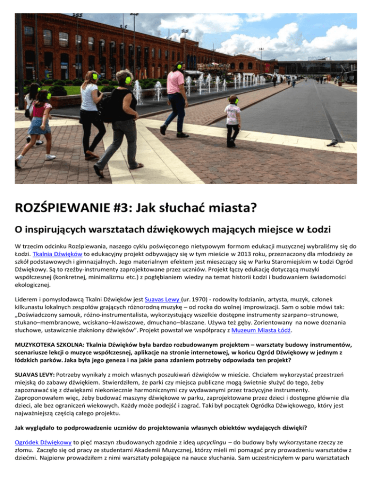 ROZŚPIEWANIE #3: Jak słuchać miasta? O inspirujących warsztatach dźwiękowych mających miejsce w Łodzi W trzecim odcinku Rozśpiewania, naszego cyklu poświęconego nietypowym formom edukacji muzycznej wybraliśmy się do Łodzi. Tkalnia Dźwięków to edukacyjny projekt odbywający się w tym mieście w 2013 roku, przeznaczony dla młodzieży ze szkół podstawowych i gimnazjalnych. Jego materialnym efektem jest mieszczący się w Parku Staromiejskim w Łodzi Ogród Dźwiękowy. Są to rzeźby-instrumenty zaprojektowane przez uczniów. Projekt łączy edukację dotyczącą muzyki współczesnej (konkretnej, minimalizmu etc.) z pogłębianiem wiedzy na temat historii Łodzi i budowaniem świadomości ekologicznej. Liderem i pomysłodawcą Tkalni Dźwięków jest Suavas Lewy (ur. 1970) - rodowity łodzianin, artysta, muzyk, członek kilkunastu lokalnych zespołów grających różnorodną muzykę – od rocka do wolnej improwizacji. Sam o sobie mówi tak: „Doświadczony samouk, różno-instrumentalista, wykorzystujący wszelkie dostępne instrumenty szarpano–strunowe, stukano–membranowe, wciskano–klawiszowe, dmuchano–blaszane. Używa też gęby. Zorientowany na nowe doznania słuchowe, ustawicznie złakniony dźwięków”. Projekt powstał we współpracy z Muzeum Miasta Łódź. MUZYKOTEKA SZKOLNA: Tkalnia Dźwięków była bardzo rozbudowanym projektem – warsztaty budowy instrumentów, scenariusze lekcji o muzyce współczesnej, aplikacje na stronie internetowej, w końcu Ogród Dźwiękowy w jednym z łódzkich parków. Jaka była jego geneza i na jakie pana zdaniem potrzeby odpowiada ten projekt? SUAVAS LEVY: Potrzeby wynikały z moich własnych poszukiwań dźwięków w mieście. Chciałem wykorzystać przestrzeń miejską do zabawy dźwiękiem. Stwierdziłem, że parki czy miejsca publiczne mogą świetnie służyć do tego, żeby zapoznawać się z dźwiękami niekoniecznie harmonicznymi czy wydawanymi przez tradycyjne instrumenty. Zaproponowałem więc, żeby budować maszyny dźwiękowe w parku, zaprojektowane przez dzieci i dostępne głównie dla dzieci, ale bez ograniczeń wiekowych. Każdy może podejść i zagrać. Taki był początek Ogródka Dźwiękowego, który jest najważniejszą częścią całego projektu. Jak wyglądało to podprowadzenie uczniów do projektowania własnych obiektów wydających dźwięki? Ogródek Dźwiękowy to pięć maszyn zbudowanych zgodnie z ideą upcyclingu – do budowy były wykorzystane rzeczy ze złomu. Zaczęło się od pracy ze studentami Akademii Muzycznej, którzy mieli mi pomagać przy prowadzeniu warsztatów z dziećmi. Najpierw prowadziłem z nimi warsztaty polegające na nauce słuchania. Sam uczestniczyłem w paru warsztatach m.in. Pauliny Oliveros (kompozytorki elektronicznej muzyki eksperymentalnej), sam się w pewien sposób otworzyłem na dźwięki i to, co jest wokół mnie. Następnie opracowaliśmy scenariusze warsztatów, które przeprowadzaliśmy z prawie 200 dziećmi, przez 4 dni, codziennie po 2 grupy. Na tych warsztatach staraliśmy się bawić dźwiękami, zachęcając uczniów do swobodnej improwizacji. W finalnej części dzieci budowały proste instrumenty ze śmieci, a na koniec projektowały maszyny dźwiękowe, które chciałyby zobaczyć w takim parku. Następnym etapem było wybieranie prac, które były możliwe do zrealizowania. Musieliśmy uwzględniać bezpieczeństwo i techniczną możliwość wykonania danego obiektu. Wybraliśmy pięć pomysłów, które zostały przeniesione na fizycznie istniejące obiekty artystyczne. Finał projektu miał miejsce 1 czerwca 2013 roku, w Dzień Dziecka. Powstały dodatkowo scenariusze lekcji, które stworzyli studenci. Powstały one w oparciu o Ogród Dźwiękowy – można je przedstawić w terenie, są to lekcje umuzykalniania, czy na temat przestrzeni, dźwięków miasta etc. Celem tych lekcji jest otwarcie młodych ludzi na dźwięki niekoniecznie harmoniczne. Pojawia się tu kwestia improwizowania, bawienia się dźwiękiem, otwieranie się na naturalne odruchy, żeby się tego nie wstydzić, przekonywania, że dźwięk, który jest nie jest harmoniczny, nie jest też automatycznie zły. Udało wam się zagrać coś na wykonanych w czasie warsztatów instrumentach? Był moment w ciągu dwugodzinnych warsztatów, kiedy zorganizowaliśmy regularne jam session na różnych instrumentach wykonanych np. z kartonów czy plastikowych butelek. Chodziło o przełamanie bariery wstydu - karton czy puszka może też być instrumentem. ROZŚPIEWANIE #1: Wywiad z Saszą Tomaszewskim, prowadzącym koło muzyczne w Gimnazjum Umiejętności Twórczych w Łodzi - See more at: http://muzykotekaszkolna.pl/1510-co-slychac-/1519-poczytaj-wiecej/1922-rozspiewanie-2-duchy-zeszkolnego-choru-#sthash.OwitKlAu.dpuf ROZŚPIEWANIE #1: Szkoła rocka z Saszą Tomaszewskim ROZŚPIEWANIE #2: Historia Langley Schools Music Project ROZŚPIEWANIE #1: Wywiad z Saszą Tomaszewskim, prowadzącym koło muzyczne w Gimnazjum Umiejętności Twórczych w Łodzi - See more at: http://muzykotekaszkolna.pl/1510-co-slychac-/1519-poczytaj-wiecej/1922-rozspiewanie-2-duchy-zeszkolnego-choru-#sthash.OwitKlAu.dpuf ROZŚPIEWANIE #1: Wywiad z Saszą Tomaszewskim, prowadzącym koło muzyczne w Gimnazjum Umiejętności Twórczych w Łodzi - See more at: http://muzykotekaszkolna.pl/1510-co-slychac-/1519-poczytaj-wiecej/1922-rozspiewanie-2-duchy-zeszkolnego-choru-#sthash.OwitKlAu.dpuf Tkalnia Dźwięków ma też bardzo ważny aspekt ekologiczny i dotyczący przestrzeni miejskiej. To był punkt wyjścia, z jakim poszedłem do Muzeum w Łodzi. 2-3 lata temu zacząłem nagrywać łódzkie rzeki i odkryłem historię, która mnie jako łodzianina też zadziwiła, bo to miasto powstało dzięki rzekom. W Łodzi wyznaczono na początku XIX wieku miejsce na osadę przemysłową dlatego, że istniała tu gęsta sieć wartkich rzek. Różnica poziomów między Stokami a Lublinkiem to około 107 metrów. Uder