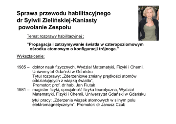 Sprawa przewodu habilitacyjnego dr Sylwii Zielińskiej-Kaniasty powołanie Zespołu Temat rozprawy habilitacyjnej : ”Propagacja i zatrzymywanie światła w czteropoziomowym ośrodku atomowym o konfiguracji trójnoga.” Wykształcenie: 1985 – doktor nauk fizycznych, Wydział Matematyki, Fizyki i Chemii, Uniwersytet Gdański w Gdańsku Tytuł rozprawy: „Zderzeniowe zmiany prędkości atomów oddziałujących z wiązką światła”, Promotor: prof. dr hab. Jan Fiutak 1981 – magister fizyki, specjalność fizyka teoretyczna, Wydział Matematyki, Fizyki i Chemii, Uniwersytet Gdański w Gdańsku tytuł pracy: „Zderzenia wiązek atomowych w silnym polu elektromagnetycznym”, Promotor: dr Janusz Czub Sprawa przewodu habilitacyjnego dr Sylwii Zielińskiej-Kaniasty - powołanie Zespołu Nagrody, realizowane projekty badawcze i staże podoktorskie • Nagrody II stopnia JM Rektora UTP za osiągnięcia naukowe w roku akademickim 2006/07 i 2009/10 • Nagrody zespołowe II stopnia JM Rektora UTP za osiągnięcia naukowe w roku akademickim 2003/04 i 2005/06 . • Współwykonawca projektu badawczego KBN „Propagacja i zatrzymywanie światła w ośrodkach atomowych o spójnie modyfikowanych właściwościach”, 2005-2007; • Współwykonawca projektu badawczego PRIN 2006-021037 MUIR, Italy „Toward alloptical information processing and store in time-dependent photonic band-gap materials” • Staż podoktorski w Max Planck Institut fuer Quantenoptik w Garching bei Muenchen, Niemcy – 1986/87 12 miesięcy • Visiting scientist Scuola Normale Superiore Pisa, Włochy – 2007/08 5 miesięcy Sprawa przewodu habilitacyjnego dr Sylwii Zielińskiej-Kaniasty - powołanie Zespołu Publikacje naukowe Autorka i współautorka 18 prac opublikowanych w czasopismach z listy filadelfijskiej, w tym 2 artykułów w Physical Review A, 8 artykułów w Optics Communications, 3 artykułów w Journal of Modern Optics, 2 artykułów w Physica B, po 1 artykule w Journal of Physics B, Physica Scripta, Acta Physica Polonica. Autorka i współautorka ponad 20 prezentacji na konferencjach międzynarodowych. Dziesięć najważniejszych publikacji 1) S. Zielińska-Kaniasty, Velocity redistribution of carriers in semiconductors induced by a laser beam and collisions, Physica B 168, 219-224 (1991) 2) S. Zielińska-Kaniasty, Light-induced drift of electrons, Physica B 168, 225-227 (1991) 3) A. Raczyński, J. Zaremba, S. Zielińska-Kaniasty. Coherent processing of a light pulse stored in a medium of four-level atoms, Optics Comm. 217, 275-280 (2003) 4) A. Raczyński, J. Zaremba, S. Zielińska-Kaniasty, Electromagnetically induced transparency and storing a pair of pulses of light, Phys. Rev. A 69, 043801-5 (2004) 5) M. Perdian, A. Raczyński, J. Zaremba, S. Zielińska-Kaniasty, Light slowdown in the vicinity of cross-over resonaces, Optics Comm. 248, 485-492 (2005) Dziesięć najważniejszych publikacji 6) A. Raczyński, M. Rzepecka, J. Zaremba, S. Zielińska-Kaniasty, Polariton picture of light propagation and storing in a tripod system, Optics Comm. 260, 73-80 (2006), 7) A. Raczyński, J. Zaremba, S. Zielińska-Kaniasty, Beam splitting and Hong-OuMandel interference for stored light, Phys. Rev. A 74, 031810-7 (2007) 8) A. Raczyński, J. Zaremba, K. Słowik and S. Zielińska-Kaniasty, Controlling statistical properties of stored light, Optics Comm. 279, 324-329 (2007) 9) A. Raczyński, J. Zaremba, S. Zielińska-Kaniasty, M. Artoni, G.C La Rocca, Reflectivity comb in coherently dressed three-level media, J. Mod. Opt. 56, 2348-2356 (2009) 10) K. Słowik, A. Raczyński, J. Zaremba, S. Zielińska-Kaniasty, Light storage in a tripod medium as a basis for logical operation, Optics Comm. 285-296, 2392-2396 (2012) Sprawa przewodu habilitacyjnego dr Sylwii Zielińskiej Kaniasty- powołanie Zespołu Propozycja składu Zespołu • dr hab. Grzegorz Pestka - przewodniczący • prof. dr hab. Ryszard Trawiński • prof. dr hab. Jarosław Zaremba • dr hab. Roman Ciuryło, prof. UMK • dr hab. Jacek Kobus