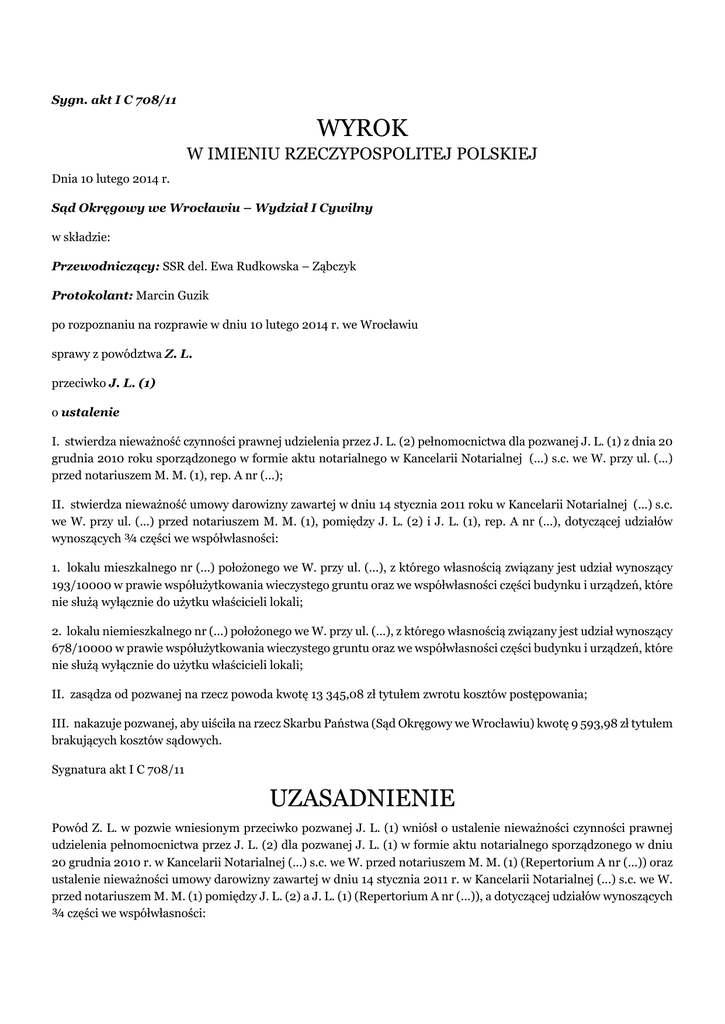 Sygn. akt I C 708/11 WYROK W IMIENIU RZECZYPOSPOLITEJ POLSKIEJ Dnia 10 lutego 2014 r. Sąd Okręgowy we Wrocławiu – Wydział I Cywilny w składzie: Przewodniczący: SSR del. Ewa Rudkowska – Ząbczyk Protokolant: Marcin Guzik po rozpoznaniu na rozprawie w dniu 10 lutego 2014 r. we Wrocławiu sprawy z powództwa Z. L. przeciwko J. L. (1) o ustalenie I. stwierdza nieważność czynności prawnej udzielenia przez J. L. (2) pełnomocnictwa dla pozwanej J. L. (1) z dnia 20 grudnia 2010 roku sporządzonego w formie aktu notarialnego w Kancelarii Notarialnej (...) s.c. we W. przy ul. (...) przed notariuszem M. M. (1), rep. A nr (...); II. stwierdza nieważność umowy darowizny zawartej w dniu 14 stycznia 2011 roku w Kancelarii Notarialnej (...) s.c. we W. przy ul. (...) przed notariuszem M. M. (1), pomiędzy J. L. (2) i J. L. (1), rep. A nr (...), dotyczącej udziałów wynoszących ¾ części we współwłasności: 1. lokalu mieszkalnego nr (...) położonego we W. przy ul. (...), z którego własnością związany jest udział wynoszący 193/10000 w prawie współużytkowania wieczystego gruntu oraz we współwłasności części budynku i urządzeń, które nie służą wyłącznie do użytku właścicieli lokali; 2. lokalu niemieszkalnego nr (...) położonego we W. przy ul. (...), z którego własnością związany jest udział wynoszący 678/10000 w prawie współużytkowania wieczystego gruntu oraz we współwłasności części budynku i urządzeń, które nie służą wyłącznie do użytku właścicieli lokali; II. zasądza od pozwanej na rzecz powoda kwotę 13 345,08 zł tytułem zwrotu kosztów postępowania; III. nakazuje pozwanej, aby uiściła na rzecz Skarbu Państwa (Sąd Okręgowy we Wrocławiu) kwotę 9 593,98 zł tytułem brakujących kosztów sądowych. Sygnatura akt I C 708/11 UZASADNIENIE Powód Z. L. w pozwie wniesionym przeciwko pozwanej J. L. (1) wniósł o ustalenie nieważności czynności prawnej udzielenia pełnomocnictwa przez J. L. (2) dla pozwanej J. L. (1) w formie aktu notarialnego sporządzonego w dniu 20 grudnia 2010 r. w Kancelarii Notarialnej (...) s.c. we W. przed notariuszem M. M. (1) (Repertorium A nr (...)) oraz ustalenie nieważności umowy darowizny zawartej w dniu 14 stycznia 2011 r. w Kancelarii Notarialnej (...) s.c. we W. przed notariuszem M. M. (1) pomiędzy J. L. (2) a J. L. (1) (Repertorium A nr (...)), a dotyczącej udziałów wynoszących ¾ części we współwłasności: 1. lokalu mieszkalnego nr (...) położonego we W. przy ul. (...), dla którego Sąd Rejonowy dla Wrocławia – Krzyków prowadzi księgę wieczystą nr (...), z którego własnością związany jest udział wynoszący 193/10 000 w prawie użytkowania wieczystego gruntu oraz we współwłasności części budynku i urządzeń, które nie służą wyłącznie do użytku właścicieli lokali; 2. lokalu niemieszalnego nr (...), stanowiącego garaż, położonego we W. przy ul. (...), dla którego Sąd Rejonowy dla Wrocławia – Krzyków prowadzi księgę wieczystą nr (...), z którego własnością związany jest udział wynoszący 678/10 000 w prawie użytkowania wieczystego gruntu oraz we współwłasności części budynku i urządzeń, które nie służą wyłącznie do użytku właścicieli lokali. Powód wniósł także o zasądzenie zwrotu kosztów procesu, w tym zwrotu kosztów zastępstwa prawnego w wysokości 10 000,00 zł ostatecznie sprecyzowanej na rozprawie w dniu 10 lutego 2014 r. W uzasadnieniu powyższego żądania powód podniósł, że jest synem, a pozwana córką J. L. (2), który zmarł we W. w dniu (...) r. J. L. (2) wraz z żoną E. L., zmarłą (...) r. byli współwłaścicielami na prawach majątkowej wspólności majątkowej dwóch nieruchomości, tj. lokalu mieszkalnego nr (...) położonego we W. przy ul. (...) oraz lokalu niemieszalnego nr (...), stanowiącego garaż, położonego we W. przy ul. (...). Spadek po E. L. nabyli na podstawie dziedziczenia ustawowego mąż J. L. (2) oraz Z. G. (syn). Po śmierci J. L. (2), kilka dni po jego pogrzebie powód dowiedział się, że pozwana jest wyłączną właścicielką obu nieruchomości na podstawie umowy darowizny z dnia 14 stycznia 2011 r., którą pozwana zawarła jako obdarowana oraz jako pełnomocnik darczyńcy, na podstawie pełnomocnictwa z dnia 20 grudnia 2010 r. Powód podniósł, że powyższe pełnomocnictwo jest nieważne albowiem zostało sporządzone w stanie wyłączającym swobodne i świadome podjęcie decyzji i wyrażenie woli przez J. L. (2) z uwagi na stan jego zdrowia psychicznego. Skoro tak, to nieważna jest także umowa darowizny z dnia 14 stycznia 2011 r. albowiem nie może ona zostać skutecznie potwierdzona przez spadkobierców J. L. (2), jako że powód odmawia jej potwierdzenia, a pozwana jako falsus procurator takiego uprawnienia nie posiada. W odpowiedzi na pozew z dnia 11 października 2011 r. (k. 54) pozwana wniosła o oddalenie powództwa, a ponadto o zasądzenie kosztów postępowania, w tym kosztów zastępstwa procesowego, według norm przepisanych. W uzasadnieniu powyższego stanowiska pozwana przyznała, że J. L. (2) chorował i w związku z tym był hospitalizowany, a nadto przyjmował rozliczne lekarstwa, jednak zaprzeczyła, jakoby w dniu 20 grudnia 2010 r. był w stanie wyłączającym świadome i swobodne podjęcie decyzji i wyrażenie woli. Pozwana wskazała, że w dniu udzielania jej pełnomocnictwa przez notariuszem M. M. (1) była także sporządzany akt poświadczenia dziedziczenia po zmarłej E. L.. W takcie dokonywania tej czynności J. L. (2) wyraził wolę dokonania na rzecz swojej córki J. L. (1) darowizny udziału w spornych nieruchomościach, jednak w związku z udzieloną przez notariusza odpowiedzią, że akt poświadczenia dziedziczenia ma skutki prawomocnego postanowienia o stwierdzeniu nabycia spadku dopiero po zarejestrowaniu w systemie informatycznym, J. L. (2) postanowił – co zasugerował notariusz – udzielić pozwanej p