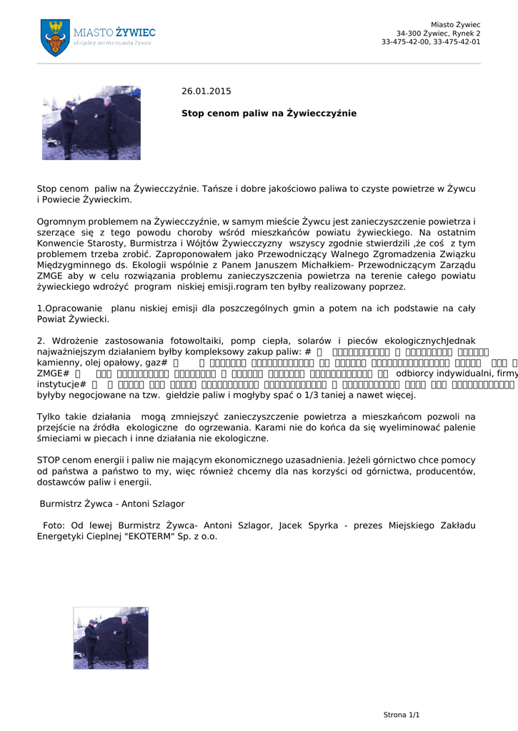 Miasto Żywiec 34-300 Żywiec, Rynek 2 33-475-42-00, 33-475-42-01 26.01.2015 Stop cenom paliw na Żywiecczyźnie Stop cenom paliw na Żywiecczyźnie. Tańsze i dobre jakościowo paliwa to czyste powietrze w Żywcu i Powiecie Żywieckim. Ogromnym problemem na Żywiecczyźnie, w samym mieście Żywcu jest zanieczyszczenie powietrza i szerzące się z tego powodu choroby wśród mieszkańców powiatu żywieckiego. Na ostatnim Konwencie Starosty, Burmistrza i Wójtów Żywiecczyzny wszyscy zgodnie stwierdzili ,że coś z tym problemem trzeba zrobić. Zaproponowałem jako Przewodniczący Walnego Zgromadzenia Związku Międzygminnego ds. Ekologii wspólnie z Panem Januszem Michałkiem- Przewodniczącym Zarządu ZMGE aby w celu rozwiązania problemu zanieczyszczenia powietrza na terenie całego powiatu żywieckiego wdrożyć program niskiej emisji.rogram ten byłby realizowany poprzez. 1.Opracowanie planu niskiej emisji dla poszczególnych gmin a potem na ich podstawie na cały Powiat Żywiecki. 2. Wdrożenie zastosowania fotowoltaiki, pomp ciepła, solarów i pieców ekologicznychJednak najważniejszym działaniem byłby kompleksowy zakup paliw: #℣佐⌡⌀攀欀漀最爀漀猀稀攀欀Ⰰ Ⰰ 戀爀礀欀椀攀琀礀Ⰰ 省ᤀ最椀攀l kamienny, olej opałowy, gaz#℣䍐⌡⌀ 椀 攀渀攀爀最椀椀 攀氀攀欀琀爀礀挀稀渀攀樀 瀀漀 挀攀渀愀挀栀 眀礀渀攀最漀挀樀漀眀愀渀礀挀栀 瀀爀稀攀稀 娀眀椁Ԁ稀攀 ZMGE#℣䍐⌡⌀ 搀氀愀 眀猀稀礀猀琀欀椀挀栀 挀栁ᤀ琀渀礀挀栀 稀 挀愁䈀攀最漀 瀀漀眀椀愀琀甀 簀礀眀椀攀挀欀椀攀最漀⸀⌡⍏倣℣ odbiorcy indywidualni, firmy instytucje#℣䍐⌡⌀⸀ 娀愀欀甀瀀 琀攀渀 戀礁䈀戀礀 爀攀愀氀椀稀漀眀愀渀礀 戀攀稀瀀漁嬀爀攀搀渀椀漀 甀 瀀爀漀搀甀挀攀渀琀眀 瀀愀氀椀 戀攀稀 瀀漁嬀爀攀搀渀椀欀眀⸀ byłyby negocjowane na tzw. giełdzie paliw i mogłyby spać o 1/3 taniej a nawet więcej. Tylko takie działania mogą zmniejszyć zanieczyszczenie powietrza a mieszkańcom pozwoli na przejście na źródła ekologiczne do ogrzewania. Karami nie do końca da się wyeliminować palenie śmieciami w piecach i inne działania nie ekologiczne. STOP cenom energii i paliw nie mającym ekonomicznego uzasadnienia. Jeżeli górnictwo chce pomocy od państwa a państwo to my, więc również chcemy dla nas korzyści od górnictwa, producentów, dostawców paliw i energii. Burmistrz Żywca - Antoni Szlagor Foto: Od lewej Burmistrz Żywca- Antoni Szlagor, Jacek Spyrka - prezes Miejskiego Zakładu Energetyki Cieplnej "EKOTERM" Sp. z o.o. Strona 1/1 Powered by TCPDF (www.tcpdf.org)