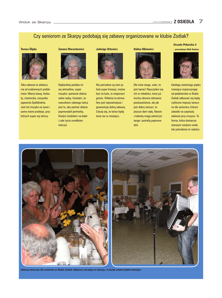 Widok ze Skarpy www.smnaskarpie.pl z osiedla 7 Czy seniorom ze Skarpy podobają się zabawy organizowane w klubie Zodiak? Urszula Pokorska 4 Teresa Ślipko Zenona Warachewicz Jadwiga Orłowicz Halina Olkiewicz Taka zabawa to odskocznia od codziennych problemów. Mamy kawę, herbatę, ciasteczka, wszystko zapewnia Spółdzielnia. Jest też muzyka na żywo i same znane przeboje, przy których super się tańczy. Najbardziej podoba mi się atmosfera, super muzyka i panowie dobrze sobie radzą. Uważam, że warunkiem udanego tańca jest to, aby partner dobrze poprowadził partnerkę. Kiedyś chodziłam na balet i całe życie uwielbiam tańczyć. Nie potrzebne są nam jakieś super kreacje, można być na luzie, w znajomym gronie. Właśnie ta atmosfera jest najważniejsza i gwarantuje dobrą zabawę. Cieszę się, że tańce będą teraz raz w miesiącu. Dla mnie tango, walc, to jest taniec! Nauczyłam się ich w młodości, teraz już trochę zdrowie odmawia posłuszeństwa, ale jak jest dobry tancerz, to jeszcze dam radę. Nawet z kobietą mogę zatańczyć tango i potrafię poprowadzić. Zabawy taneczne dla seniorów w Klubie Zodiak odbywać się będą co miesiąc, w każdy ostatni piątek miesiąca – prowadząca Klub Seniora Każdego ostatniego piątku miesiąca rozpoczynając od października w Klubie Zodiak odbywać się będą cykliczne imprezy taneczne dla seniorów, którym zależało na częstszej zabawie przy muzyce. To forma, która dostarcza starszym osobom wiele tak potrzebnej im radości.