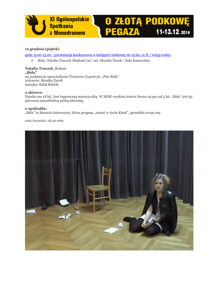 12 grudnia (piątek) godz. 9.00-13.00 - prezentacja konkursowa w kategorii wiekowej 16-19 lat, cz.II / wstęp wolny Bida, Natalia Traczyk (Radom) 30‘, reż. Monika Żurek / Sala Kameralna Natalia Traczyk, Radom „Bida” na podstawie opowiadania Trumana Capote pt. „Pan Bida” reżyseria: Monika Żurek muzyka: Rafał Balicki o aktorce: Natalia ma 18 lat. Jest tegoroczną maturzystką. W MDK-owskim teatrze Scena 05 gra od 5 lat. „Bida” jest jej pierwszą samodzielną próbą aktorską. o spektaklu: „Bida” to historia dziewczyny, która pragnąc „zostać w życiu Kimś”, sprzedała swoje sny. czas trwania: ok.30 min.