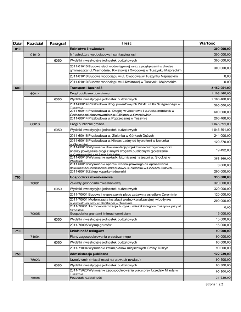 Dział Rozdział Treść Paragraf 010 01010 6050 Wartość Rolnictwo i łowiectwo 300 000,00 Infrastruktura wodociągowa i sanitacyjna wsi 300 000,00 Wydatki inwestycyjne jednostek budżetowych 300 000,00 2011-01010 Budowa sieci wodociągowej wraz z przyłączami w drodze gminnej przy ul.Wschodniej, Kwiatowej i Owocowej w Tuszynku Majorackim 300 000,00 2011-01010 Budowa wodociągu w ul. Owocowej w Tuszynku Majorackim 0,00 2011-01010 Budowa wodociągu w ul.Kwiatowej w Tuszynku Majorackim 600 60014 6050 2 152 051,00 Drogi publiczne powiatowe 1 106 460,00 Wydatki inwestycyjne jednostek budżetowych 1 106 460,00 2011-60014 Przebudowa drogi powiatowej Nr 2904E ul.Ks.Ściegiennego w Tuszynie 2011-60014 Przebudowa ul. Długiej w Głuchowie i ul.Aleksandrówek w Garbowie od skrzyżowania z ul.Glinianą w Szczukwinie 2011-60014 Przebudowa ul.Poprzecznej w Tuszynie 60016 6050 6050 70005 6050 710 71004 6050 1 045 591,00 6050 75095 244 000,00 129 870,00 19 492,00 358 569,00 3 660,00 290 000,00 Gospodarka mieszkaniowa 335 000,00 Zakłady gospodarki mieszkaniowej 320 000,00 Wydatki inwestycyjne jednostek budżetowych 320 000,00 2011-70001 Budowa i wyposażenie placu zabaw na osiedlu w Żerominie 120 000,00 2011-70001 Modernizacja instalacji wodno-kanalizacyjnej w budynku mieszkalnym przy ul.Szpitalnej w Tuszynie 2011-70001 Termomodernizacja budynku mieszkalnego w Tuszynie przy ul. Szpitalnej Gospodarka gruntami i nieruchomościami 200 000,00 0,00 15 000,00 Wydatki inwestycyjne jednostek budżetowych 15 000,00 2011-70005 Wykup gruntów 15 000,00 Działalność usługowa 90 000,00 Plany zagospodarowania przestrzennego 90 000,00 Wydatki inwestycyjne jednostek budżetowych 90 000,00 Administracja publiczna 75023 206 460,00 Wydatki inwestycyjne jednostek budżetowych 2011-71004 Wykonanie zmian planów miejscowych Gminy Tuszyn 750 600 000,00 1 045 591,00 2011-60016 Przebudowa ul.Niedas Leśny od hydroforni w kierunku ul.Góreckiej 2011-60016 Wykonanie dokumentacji projektowo-kosztorysowej oraz analizy powiązania drogi z innymi drogami publicznymi ;połączenie ul.Garbowskiej z ul.Starościańską 2011-60016 Wykonanie nakładki bitumicznej na jezdni ul. Srockiej w Wodzinku 2011-60016 Wykonanie operatu wodno-prawnego do opracowania dokumentacji projektowej przebudowy ul.Zielonka w Górkach Dużych 2011-60016 Zakup koparko-ładowarki 70001 300 000,00 Drogi publiczne gminne 2011-60016 Przebudowa ul. Zielonka w Górkach Dużych 700 0,00 Transport i łączność 90 000,00 122 239,00 Urzędy gmin (miast i miast na prawach powiatu) 90 300,00 Wydatki inwestycyjne jednostek budżetowych 90 300,00 2011-75023 Wykonanie zagospodarowania placu przy Urzędzie Miasta w Tuszynie Pozostała działalność 90 300,00 31 939,00 Strona 1 z 2 6060 6639 Wydatki na zakupy inwestycyjne jednostek budżetowych 10 000,00 2011-75095 Zakup chłodziarki dla sołectwa Modlica 5 000,00 2011-75095 Zakup namiotu dla sołectwa Rydzynki 5 000,00 Dotacje celowe przekazane do samorządu województwa na inwestycje i zakupy inwestycyjne realizowane na podstawie porozumień (umów) między jednostkami samorządu terytorialnego 2011-75095 Budowa Zintegrowanego Systemu e-Usług Publicznych WRŁ 21 939,00 21 939,00 Bezpieczeństwo publiczne i ochrona przeciwpożarowa 10 172,61 Ochotnicze straże pożarne 10 172,61 6050 Wydatki inwestycyjne jednostek budżetowych 10 172,61 6060 2011-75412 Zakup i instalacja przydomowej oczyszczalni ścieków z drenażem rozsączającym przy strażnicy OSP w Mąkoszynie Wydatki na zakupy inwestycyjne jednostek budżetowych 754 75412 10 172,61 0,00 2011-75412 Zakup zestawu ratowniczego dla OSP Kruszów 801 80104 6050 900 90001 6050 0,00 Oświata i wychowanie 15 000,00 Przedszkola 15 000,00 Wydatki inwestycyjne jednostek budżetowych 15 000,00 2011-80104 Ułożenie kostki w ciągu komunikacyjnym w Przedszkolu Nr 1 w Tuszynie Gospodarka komunalna i ochrona środowiska 1 614 691,73 Gospodarka ściekowa i ochrona wód 1 234 648,00 Wydatki inwestycyjne jednostek budżetowych 1 234 648,00 2011-90001 Budowa kanalizacji sanitarnej i deszczowej w części ul. Pułaskiego i Poniatowskiego w Tuszynie Lesie 2011-90001 Budowa kanalizacji w ul. Wschodniej 90004 6050 90015 6050 926 92601 6050 15 000,00 1 170 186,00 64 462,00 Utrzymanie zieleni w miastach i gminach 340 205,00 Wydatki inwestycyjne jednostek budżetowych 340 205,00 2011-90004 Przebudowa parku miejskiego w Tuszynie 340 205,00 Oświetlenie ulic, placów i dróg 39 838,73 Wydatki inwestycyjne jednostek budżetowych 39 838,73 2011-90015 Budowa oświetlenia ulicznego ul.Góreckiej, Bocznej i Zacisze w Woli Kazubowej i Dylewie 2011-90015 Wykonanie dokumentacji projektowej oświetlenia ul. Dylewskiej w Górkach Małych 2011-90015 Wykonanie dokumentacji projektowej oświetlenia ul. Okupnikiw Wodzinie Majorackim 2011-90015 Zakup i instalacja hybrydowej lampy ulicznej w Wodzinie Prywatnym Kultura fizyczna 500 000,00 Obiekty sportowe 500 000,00 Wydatki inwestycyjne jednostek budżetowych 500 000,00 2011-92601 Wykonanie instalacji kolektorów słonecznych na Krytej Pływalni "OCEANIK" 500 000,00 Razem 8 734,32 8 000,00 7 000,00 16 104,41 5 139 154,34 Strona 2 z 2