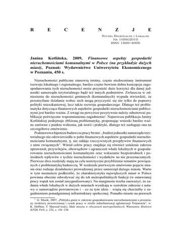 R E C E N Z J E Studia Regionalne i Lokalne Nr 1(39)/2010 ISSN 1509–4995 Janina Kotlińska, 2009, Finansowe aspekty gospodarki nieruchomościami komunalnymi w Polsce (na przykładzie dużych miast), Poznań: Wydawnictwo Uniwersytetu Ekonomicznego w Poznaniu, 450 s. Nieruchomości publiczne stanowią istotny, często niedoceniany instrument rozwoju lokalnego i regionalnego, bardzo często bowiem dobra koncepcja zagospodarowania tych nieruchomości może przynieść duże korzyści dla danej jednostki samorządu terytorialnego bądź też innych podmiotów. Zwłaszcza w odniesieniu do nieruchomości gminnych (komunalnych) wypada stwierdzić, że przemyślane działania wobec nich mogą przyczynić się nie tylko do poprawy polityki mieszkaniowej, lecz także rozwoju gospodarczego. Dlatego też problematyka dotycząca finansowych aspektów gospodarki nieruchomościami publicznymi jest bardzo ważna. Z uwagi na powyższe pozytywnie należy odnotować publikacje poświęcone wspomnianemu zagadnieniu1. Najnowsza publikacja Janiny Kotlińskiej podejmuje zbliżoną problematykę, proponując wnioski bardzo ważne zarówno z punktu widzenia, jak teorii i praktyki, dlatego też zasługuje ona na szczegółowe omówienie. Podstawowa hipoteza badawcza pracy brzmi: „budżet jednostki samorządu terytorialnego nie odzwierciedla w pełni finansowych aspektów gospodarki nieruchomościami komunalnymi, tj. nie oddaje rzeczywistych przepływów finansowych z nimi związanych”. Wśród celów pracy znajduje się również ustalenie zakresu uprawnień, przywilejów, obowiązków i ograniczeń władz lokalnych w gospodarowaniu nieruchomościami komunalnymi oraz wskazanie bezpośrednich i pośrednich wpływów z tychże nieruchomości i wydatków na nie przeznaczanych. Pierwsze dwa rozdziały mają na celu teoretyczne przybliżenie tematów powiązanych z problematyką badawczą. W rozdziale pierwszym omówiono pojęcie miasta oraz rodzaje działalności prowadzonej przez samorząd dużego miasta. Warto w tym momencie podkreślić, że charakterystyka największych miast w Polsce powinna obecnie odwoływać się do ich metropolitalnych funkcji (w omawianej pracy wątek ten został zasygnalizowany). Na marginesie trzeba zauważyć, że zadania władz lokalnych w dużych miastach wynikają w szerokim zakresie z ustawy o samorządzie powiatowym i – co za tym idzie – wiążą się chociażby z zagadnieniem ponadgminnej infrastruktury społecznej. Ponadto miasto na prawach 1 G. Masik, 2007, „Polityka gmin w zakresie gospodarowania nieruchomościami a przemiany struktury przestrzennej i rynek pracy w strefie suburbanizacji aglomeracji Trójmiasta”, w: K. Heffner, T. Marszał (red.), Małe miasta w obszarach metropolitalnych, Warszawa: Biuletyn KPZK PAN, z. 232, s. 116–130. RECENZJE 117 powiatu dysponuje większym mieniem komunalnym (Autorka wyjaśnia różne definicje wspomnianego pojęcia). Wchodzące w skład takiego mienia nieruchomości stanowią ważny składnik rzeczowy środków trwałych danej jednostki samorządu terytorialnego i mogą być przez nią pozyskiwane w różny sposób (zakup nieruchomości, darowizna, realizacja roszczeń czy inne czynności prawne). Same nieruchomości – jak to zaprezentowano w rozdziale drugim – mogą być klasyfikowane w różny sposób. Poza wynikającym z kodeksu cywilnego podziałem na nieruchomości gruntowe, lokalowe i budynkowe Autorka słusznie zwróciła uwagę na podział z punktu widzenia spełnianych przez nie funkcji. Zgodnie z powyższym wyróżniamy dwie grupy: nieruchomości zaspokajające potrzeby (mieszkańców, władzy lokalnej, administracji publicznej itd.) oraz nieruchomości spełniające funkcję łącznikową (czyli np. służące komunikacji, zaopatrzeniu w wodę czy odprowadzaniu ścieków). Jeden z podrozdziałów został poświęcony gminnym informacjom o stanie mienia komunalnego. Zwrócono w nim uwagę, że omawiane dokumenty są coraz lepiej opracowane, jednakże wciąż nie są skorelowane z projektami uchwał budżetowych, nie stosuje się w nich podziału nieruchomości według kryterium ich wykorzystania ani planów z nimi związanych. W chwili obecnej na podstawie wspomnianych dokumentów nie można oceniać działań organów samorządowych podejmowanych w ramach gospodarowania nieruchomościami. Rozdziały trzeci oraz czwarty dotyczą dochodów i wydatków związanych z nieruchomościami komunalnymi. Autorka dokonuje przeglądu rodzajów dochodów według różnych ujęć literatury przedmiotu. W przypadku opłat z tytułu użytkowania wieczystego słusznie podkreśla, że przejawem samodzielności w tym zakresie może być stosowanie niektórych bonifikat. Przy okazji charakterystyki opłat z tytułu trwałego zarządu zasygnalizowana została kwestia odmiennego rozumienia wspomnianego pojęcia w literaturze oraz w doktrynie. W związku z tym J. Kotlińska słusznie postuluje zawężenie odpłatnego zarządu tylko do podmiotów powiązanych z budżetem metodą netto. Analizując zaś dochody z najmu lokali, sugeruje, że czynsze za komunalne lokale mieszkalne powinny być w Polsce zdecydowanie wyższe. Ich wysokość w stosunku do kosztów odtworzenia powinna wynosić w zależności od standardu i wartości użytkowej mieszkania od 4% do 7%. Z kolei możliwość wniesienia nieruchomości komunalnej do spółki w formie aportu stanowi sposób uczestnictwa władz lokalnych w działaniach podmiotu realizującego zadania samorządu terytorialnego innego aniżeli jednostka budżetowa czy zakład budżetowy. Kolejne zagadnienie stanowią dochody z obrotu nieruchomościami komunalnymi. Bardzo ważnym elementem pracy jest określenie czynników wpływających bezpośrednio na cenę nieruchomości i odwołanie się w tym kontekście do znanej publikacji M. Czornik Miasto. Ekonomiczne aspekty funkcjonowania2. Wydaje się bowiem, że rozpatrywanie gospodarki nieruchomościami komunalnymi powinno w istotnym stopniu wiązać si