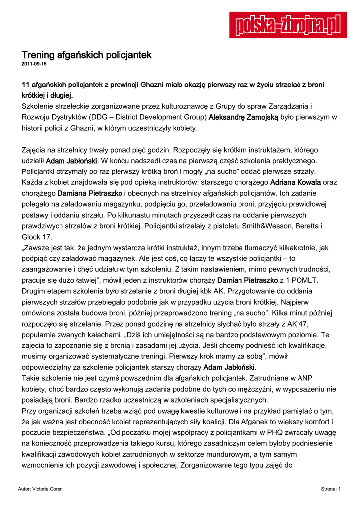 Trening afgańskich policjantek 2011-09-15 11 afgańskich policjantek z prowincji Ghazni miało okazję pierwszy raz w życiu strzelać z broni krótkiej i długiej. Szkolenie strzeleckie zorganizowane przez kulturoznawcę z Grupy do spraw Zarządzania i Rozwoju Dystryktów (DDG – District Development Group) Aleksandrę Zamojską było pierwszym w historii policji z Ghazni, w którym uczestniczyły kobiety. Zajęcia na strzelnicy trwały ponad pięć godzin. Rozpoczęły się krótkim instruktażem, którego udzielił Adam Jabłoński. W końcu nadszedł czas na pierwszą część szkolenia praktycznego. Policjantki otrzymały po raz pierwszy krótką broń i mogły „na sucho” oddać pierwsze strzały. Każda z kobiet znajdowała się pod opieką instruktorów: starszego chorążego Adriana Kowala oraz chorążego Damiana Pietraszko i obecnych na strzelnicy afgańskich policjantów. Ich zadanie polegało na załadowaniu magazynku, podpięciu go, przeładowaniu broni, przyjęciu prawidłowej postawy i oddaniu strzału. Po kilkunastu minutach przyszedł czas na oddanie pierwszych prawdziwych strzałów z broni krótkiej. Policjantki strzelały z pistoletu Smith&Wesson, Beretta i Glock 17. „Zawsze jest tak, że jednym wystarcza krótki instruktaż, innym trzeba tłumaczyć kilkakrotnie, jak podpiąć czy załadować magazynek. Ale jest coś, co łączy te wszystkie policjantki – to zaangażowanie i chęć udziału w tym szkoleniu. Z takim nastawieniem, mimo pewnych trudności, pracuje się dużo łatwiej”, mówił jeden z instruktorów chorąży Damian Pietraszko z 1 POMLT. Drugim etapem szkolenia było strzelanie z broni długiej kbk AK. Przygotowanie do oddania pierwszych strzałów przebiegało podobnie jak w przypadku użycia broni krótkiej. Najpierw omówiona została budowa broni, później przeprowadzono trening „na sucho”. Kilka minut później rozpoczęło się strzelanie. Przez ponad godzinę na strzelnicy słychać było strzały z AK 47, popularnie zwanych kałachami. „Dziś ich umiejętności są na bardzo podstawowym poziomie. Te zajęcia to zapoznanie się z bronią i zasadami jej użycia. Jeśli chcemy podnieść ich kwalifikacje, musimy organizować systematyczne treningi. Pierwszy krok mamy za sobą”, mówił odpowiedzialny za szkolenie policjantek starszy chorąży Adam Jabłoński. Takie szkolenie nie jest czymś powszednim dla afgańskich policjantek. Zatrudniane w ANP kobiety, choć bardzo często wykonują zadania podobne do tych co mężczyźni, w wyposażeniu nie posiadają broni. Bardzo rzadko uczestniczą w szkoleniach specjalistycznych. Przy organizacji szkoleń trzeba wziąć pod uwagę kwestie kulturowe i na przykład pamiętać o tym, że jak ważna jest obecność kobiet reprezentujących siły koalicji. Dla Afganek to większy komfort i poczucie bezpieczeństwa. „Od początku mojej współpracy z policjantkami w PHQ zwracały uwagę na konieczność przeprowadzenia takiego kursu, którego zasadniczym celem byłoby podniesienie kwalifikacji zawodowych kobiet zatrudnionych w sektorze mundurowym, a tym samym wzmocnienie ich pozycji zawodowej i społecznej. Zorganizowanie tego typu zajęć do Autor: Victoria Coren Strona: 1 najłatwiejszych nie należy, ale po jego zakończeniu mogę powiedzieć tylko jedno – było warto. Jedenaście z piętnastu kobiet służących w Ghazni ma za sobą pierwsze w życiu strzelanie. Wiem, że nauka strzelania to proces długi i czasochłonny, ale cieszę się, że podstawowy mamy już za sobą. Przed nami i przed policjantkami jeszcze długa droga, ale może być już tylko lepiej. Kurs wpisuje się w działalność rozwojową z zakresu gender, a także w cykl działań ONZ dążących do wyrównywania szans kobiet w społeczeństwie i pracy zawodowej”, tak o zajęciach mówi Aleksandra Zamojska z DDG. Szkolenie strzeleckie jest także przygotowaniem policjantek do współpracy z wojskami sił koalicji, a w przyszłości do samodzielnej, profesjonalnej pracy w ramach struktur policji, a co za tym idzie, podniesienia bezpieczeństwa w Ghazni. Działania te są szczególnie istotne również w kontekście przygotowań do przedsięwzięcia Ghazni 2013. Poniedziałkowy trening strzelecki był możliwy do przeprowadzenia dzięki współpracy Grupy do spraw Zarządzania Rozwojem Dystryktów, żołnierzy 1 POMLT z afgańskimi policjantami. Program szkolenia opracowany został przez Aleksandrę Zamojską z DDG, a za jego realizację bezpośrednio odpowiedzialni byli żołnierze 1 POMLT: starszy chorąży Adam Jabłoński i starszy chorąży Adrian Kowal (Oddział Specjalny Żandarmerii Wojskowej z Warszawy), chorąży Damian Pietraszko (Wydział Żandarmerii Wojskowej z Wrocławia) oraz chorąży Daniel Domański (Mazowiecki Oddział Żandarmerii Wojskowej). Swoje zadania mieli także afgańscy policjanci – oprócz zabezpieczenia amunicji niezbędnej do szkolenia, pomagali polskim instruktorom w pracy trenerskiej. *** W Afganistanie, według danych z czerwca 2011 roku, w Siłach Bezpieczeństwa liczących 305 tysięcy żołnierzy i funkcjonariuszy służy 1400 kobiet. 1100 z nich w afgańskiej policji, a około 300 w afgańskiej armii. W prowincji Ghazni służy 15 policjantek. Na co dzień pracują w Komendzie Głównej Policji w stolicy prowincji oraz na 4 Posterunku. Najczęściej angażowane są do spraw, w których jedną ze stron jest kobieta. Uczestniczą w przesłuchaniach, negocjacjach, a także wykonują czynności patrolowe na terenie stolicy prowincji. Fot.: Bogumiła Piekut Autor: Victoria Coren Strona: 2