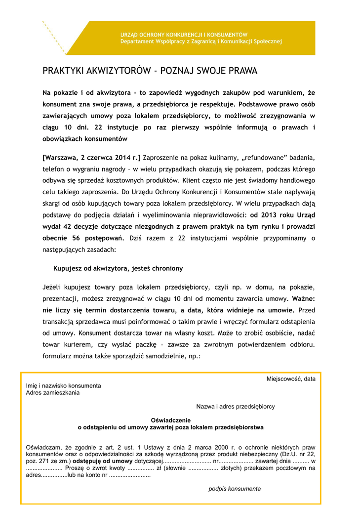PRAKTYKI AKWIZYTORÓW - POZNAJ SWOJE PRAWA Na pokazie i od akwizytora - to zapowiedź wygodnych zakupów pod warunkiem, że konsument zna swoje prawa, a przedsiębiorca je respektuje. Podstawowe prawo osób zawierających umowy poza lokalem przedsiębiorcy, to możliwość zrezygnowania w ciągu 10 dni. 22 instytucje po raz pierwszy wspólnie informują o prawach i obowiązkach konsumentów [Warszawa, 2 czerwca 2014 r.] Zaproszenie na pokaz kulinarny, „refundowane” badania, telefon o wygraniu nagrody – w wielu przypadkach okazują się pokazem, podczas którego odbywa się sprzedaż kosztownych produktów. Klient często nie jest świadomy handlowego celu takiego zaproszenia. Do Urzędu Ochrony Konkurencji i Konsumentów stale napływają skargi od osób kupujących towary poza lokalem przedsiębiorcy. W wielu przypadkach dają podstawę do podjęcia działań i wyeliminowania nieprawidłowości: od 2013 roku Urząd wydał 42 decyzje dotyczące niezgodnych z prawem praktyk na tym rynku i prowadzi obecnie 56 postępowań. Dziś razem z 22 instytucjami wspólnie przypominamy o następujących zasadach: Kupujesz od akwizytora, jesteś chroniony Jeżeli kupujesz towary poza lokalem przedsiębiorcy, czyli np. w domu, na pokazie, prezentacji, możesz zrezygnować w ciągu 10 dni od momentu zawarcia umowy. Ważne: nie liczy się termin dostarczenia towaru, a data, która widnieje na umowie. Przed transakcją sprzedawca musi poinformować o takim prawie i wręczyć formularz odstąpienia od umowy. Konsument dostarcza towar na własny koszt. Może to zrobić osobiście, nadać towar kurierem, czy wysłać paczkę – zawsze za zwrotnym potwierdzeniem odbioru. formularz można także sporządzić samodzielnie, np.: Miejscowość, data Imię i nazwisko konsumenta Adres zamieszkania Nazwa i adres przedsiębiorcy Oświadczenie o odstąpieniu od umowy zawartej poza lokalem przedsiębiorstwa Oświadczam, że zgodnie z art. 2 ust. 1 Ustawy z dnia 2 marca 2000 r. o ochronie niektórych praw konsumentów oraz o odpowiedzialności za szkodę wyrządzoną przez produkt niebezpieczny (Dz.U. nr 22, poz. 271 ze zm.) odstępuję od umowy dotyczącej............................. nr..................... zawartej dnia .......... w ...................... Proszę o zwrot kwoty ................ zł (słownie .................. złotych) przekazem pocztowym na adres................lub na konto nr ......................... podpis konsumenta Sprawdź, gdzie jesteś Bądź ostrożny i zawsze pytaj sprzedawcę, czy miejsce, w którym jesteś, to jego siedziba lub oddział. Niektórzy sprzedawcy często celowo zmieniają swoje siedziby, rejestrują jako oddział innej w nowym miejscu. Chcą przez to ominąć przepisy pozwalające na odstąpienie od umowy w ciągu 10 dni. Praktyczna rada: Jeżeli nie wiesz, czy prezentacja odbywa się w lokalu, poproś o przybicie pieczątki na pustej kartce – adres porównaj z tym, który jest zawarty w umowie, którą zamierzasz zawrzeć. Nie ufaj całkowicie zapewnieniom sprzedawcy – samodzielnie poszukaj w umowie informacji o tym, czy masz prawo odstąpienia od umowy. Jeżeli sprzedawca unika odpowiedzi na pytanie, namawia do podpisania kontraktu bez czytania – nie ulegaj presji. Obowiązuje to, co jest napisane w umowie, a nie zapewnienia sprzedawcy. Zapytaj o sprzedaż Jeśli nie chcesz uczestniczyć w pokazach połączonych ze sprzedażą - już podczas rozmowy telefonicznej, ustal jaki charakter ma spotkanie. Ukrywanie handlowego celu takich zaproszeń to jedna z nieuczciwych praktyk na którą skarżą się konsumenci. Uważaj na pokazy sprawiające wrażenie refundowanych badań medycznych: w rzeczywistości są to działania marketingowe mające przekonać do właściwości oferowanych produktów paramedycznych. Zawsze poproś o potwierdzenie kwalifikacji eksperta i właściwości sprzedawanych towarów. Poproś o dowód osobisty Akwizytor, sprzedawca na pokazie przed zawarciem umowy muszą pokazać konsumentom dokument potwierdzający prowadzenie działalności gospodarczej oraz dowód osobisty. Odmowa powinna wzbudzić podejrzenia klienta. Szukaj pomocy Jeżeli nie wiesz, jakie masz prawa lub jak odstąpić od umowy - nie czekaj – skorzystaj z bezpłatnej pomocy: infolinia 800 007 707, rzecznicy konsumentów, Inspekcja Handlowa, Federacja Konsumentów, Stowarzyszenie Konsumentów Polskich. Informacji o swoich prawach szukaj na stronach internetowych uczestników projektu: Gdy doszło do oszustwa - Prokuratura Generalna Zawierasz umowę z operatorem telekomunikacyjnym? Ufaj, ale sprawdzaj! - Urząd Komunikacji Elektronicznej Magia zaproszenia: „refundowane” badania medyczne? Pokaz kulinarny? Uwaga, sprzedaż - Urząd Ochrony Konkurencji i Konsumentów Akwizytor proponuje zmianę sprzedawcy prądu? Poznaj swoje prawa - Urząd Regulacji Energetyki Pokazy i prezentacje – oszustwa, których nie można udowodnić- Federacja Konsumentów Wademekum rozsądnego kupowania - Stowarzyszenie Konsumentów Polskich W akcji biorą także udział: Rzecznik Praw Obywatelskich, Wojewódzkie Inspektoraty Inspekcji Handlowej: Białystok, Bydgoszcz, Gdańsk, Gorzów Wielkopolski, Katowice, Kielce, Kraków, Lublin, Łódź, Olsztyn, Opole, Poznań, Rzeszów, Warszawa, Wrocław. Dodatkowe informacje dla mediów: Małgorzata Cieloch, Rzecznik prasowy UOKiK Departament Współpracy z Zagranicą i Komunikacji Społecznej Pl. Powstańców Warszawy 1, 00-950 Warszawa Tel. 22 827 28 92, 55 60 314 Fax 22 826 11 86 E-mail [email protected]