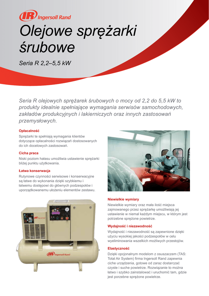 Olejowe sprężarki śrubowe Seria R 2,2–5,5 kW Seria R olejowych sprężarek śrubowych o mocy od 2,2 do 5,5 kW to produkty idealnie spełniające wymagania serwisów samochodowych, zakładów produkcyjnych i lakierniczych oraz innych zastosowań przemysłowych. Opłacalność Sprężarki te spełniają wymagania klientów dotyczące opłacalności rozwiązań dostosowanych do ich docelowych zastosowań. Cicha praca Niski poziom hałasu umożliwia ustawienie sprężarki bliżej punktu użytkowania. Łatwa konserwacja Rutynowe czynności serwisowe i konserwacyjne są łatwe do wykonania dzięki szybkiemu i łatwemu dostępowi do głównych podzespołów i uporządkowanemu ułożeniu elementów zestawu. Niewielkie wymiary Niewielkie wymiary oraz mała ilość miejsca zajmowanego przez sprężarkę umożliwiają jej ustawienie w niemal każdym miejscu, w którym jest potrzebne sprężone powietrze. Wydajność i niezawodność Wydajność i niezawodność są zapewnione dzięki użyciu wysokiej jakości podzespołów w celu wyeliminowania wszelkich możliwych przestojów. Elastyczność Dzięki opcjonalnym modelom z osuszaczem (TAS: Total Air System) firma Ingersoll Rand zapewnia ciche urządzenia, gotowe od zaraz dostarczać czyste i suche powietrze. Rozwiązanie to można łatwo i szybko zainstalować i uruchomić tam, gdzie jest porzebne sprężone powietrze. Układ standardowy Total Air System™ • Sprężarka • Sprężarka • Zbiornik wyrównawczy • Zbiornik wyrównawczy • Bezstratny zawór spustowy (opcjonalny) • Osuszacz ziębniczy • Bezstratny zawór spustowy (opcjonalny) Dane techniczne Model Silnik Maksymalne ciśnienie Zbiornik wyrównawczy Rozrusznik Pojemność Hałas Wymiary mm Masa l/min m3/min stopy3/ min dB(A)* (szer. x dł. x wys.) Kg DOL 241 0,24 8,5 64 555 x 1393 x 1111 184 200 DOL 467 0,47 16,5 64 555 x 1393 x 1111 186 145 200 S/D 467 0,47 16,5 64 555 x 1393 x 1111 186 10 145 200 S/D 623 0,62 22 67 555 x 1393 x 1111 187 3,0 10 145 200 DOL 241 0,24 8,5 64 555 x 1393 x 1111 210 4,0 5,5 10 145 200 DOL 467 0,47 16,5 64 555 x 1393 x 1111 212 R4IU-10-200SD-D 4,0 5,5 10 145 200 S/D 467 0,47 16,5 64 555 x 1393 x 1111 212 R5.5IU-10-200SD-D 5,5 7,5 10 145 200 S/D 623 0,62 22 67 555 x 1393 x 1111 213 kW KM bar (manom.) psi (manom.) litry R2.2IU-10-200 2,2 3,0 10 145 200 R4IU-10-200 4,0 5,5 10 145 R4IU-10-200SD 4,0 5,5 10 R5.5IU-10-200SD 5,5 7,5 R2.2IU-10-200-D 2,2 R4IU-10-200-D Układ standardowy Total Air System™ * Mierzone zgodnie z normą ISO 2151 ±3 dB(A). “D” = Osuszacz, „SD” = Rozrusznik gwiazda-trójkąt — Wszystkie urządzenia 400/3/50 elektryczne (230/3/50 elektryczne) Dla klientów z sektora przemysłu, handlu i usług Ingersoll Rand Industrial Technologies zapewnia produkty, usługi i rozwiązania mające na celu zwiększanie efektywności i wydajności pracy. Nasza zróżnicowana oferta innowacyjnych produktów obejmuje sprężarki, elementy systemów sprężonego powietrza, narzędzia, urządzenia do transportu cieczy oraz systemy transportu bliskiego zasięgu. Zwiększaniu wydajności sprzyjamy również dzięki rozwiązaniom stworzonym przez Club Car®, światowego lidera w dziedzinie wózków golfowych i pojazdów użytkowych, stosowanych przez przedsiębiorstwa i osoby fizyczne. Żadna z informacji zawartych w niniejszym dokumencie nie rozszerza wyraźnych lub domniemanych gwarancji lub zobowiązań dotyczących produktu w nim opisanego. Wszelkie takie gwarancje lub inne warunki zakupu produktów są zgodne ze standardowymi warunkami zakupu takich produktów Ingersoll Rand, dostępnymi na żądanie. Ulepszanie produktów jest stałym celem Ingersoll Rand. Projekty i specyfikacje mogą ulec zmianie bez wcześniejszego powiadomienia lub powstania jakichkolwiek zobowiązań. © 2011 Ingersoll Rand Company Limited. Form No. POL52709 www.ingersollrandproducts.com