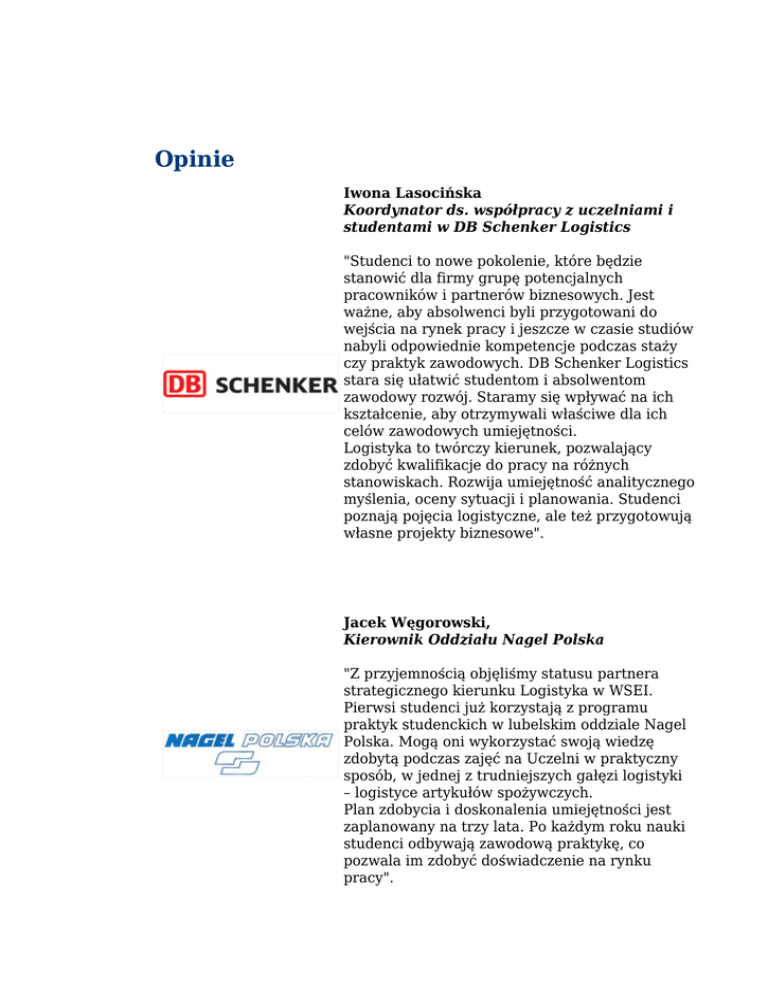 Opinie Iwona Lasocińska Koordynator ds. współpracy z uczelniami i studentami w DB Schenker Logistics "Studenci to nowe pokolenie, które będzie stanowić dla firmy grupę potencjalnych pracowników i partnerów biznesowych. Jest ważne, aby absolwenci byli przygotowani do wejścia na rynek pracy i jeszcze w czasie studiów nabyli odpowiednie kompetencje podczas staży czy praktyk zawodowych. DB Schenker Logistics stara się ułatwić studentom i absolwentom zawodowy rozwój. Staramy się wpływać na ich kształcenie, aby otrzymywali właściwe dla ich celów zawodowych umiejętności. Logistyka to twórczy kierunek, pozwalający zdobyć kwalifikacje do pracy na różnych stanowiskach. Rozwija umiejętność analitycznego myślenia, oceny sytuacji i planowania. Studenci poznają pojęcia logistyczne, ale też przygotowują własne projekty biznesowe". Jacek Węgorowski, Kierownik Oddziału Nagel Polska "Z przyjemnością objęliśmy statusu partnera strategicznego kierunku Logistyka w WSEI. Pierwsi studenci już korzystają z programu praktyk studenckich w lubelskim oddziale Nagel Polska. Mogą oni wykorzystać swoją wiedzę zdobytą podczas zajęć na Uczelni w praktyczny sposób, w jednej z trudniejszych gałęzi logistyki – logistyce artykułów spożywczych. Plan zdobycia i doskonalenia umiejętności jest zaplanowany na trzy lata. Po każdym roku nauki studenci odbywają zawodową praktykę, co pozwala im zdobyć doświadczenie na rynku pracy". Grażyna Jodłowska Studentka Logistyki I st., II rok "Rozpoczynając studia na Logistyce obawiałam się, czy pogodzę naukę z pracą. Jednak elastyczna forma kształcenia i indywidualne podejście do każdego studenta pozwala połączyć studiowanie z pracą zawodową i życiem rodzinnym. Część zajęć prowadzona jest w ramach e-learningu, co pozwala wrócić do zajęć w dowolnym czasie i miejscu. Również na bieżąco mogę sprawdzać swoje konto w Wirtualnym Dziekanacie". Sylwester Ekiert Student Logistyki, I st. "Jestem studentem kierunku Logistyka. Wybrałem ten kierunek, ponieważ wiedza i umiejętności, które na nim zdobywam są mi potrzebne w mojej pracy zawodowej. Wziąłem pod uwagę opinie kolegów i przyjaciół, którzy już studiowali we WSEI i są bardzo zadowoleni. Nie zawiodłem się. Na każdych zajęciach otrzymuję solidną wiedzę, popartą konkretnymi przykładami z życia. Na uwagę zasługuje również indywidualne podejście do studenta i bardzo dobrze wyposażona baza dydaktyczna oraz liczne laboratoria".
