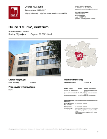 Oferta nr.: 4281 PAWLIK NIERUCHOMOŚCI ul. Pomorska 77, 90-224 Łódź www.pawlik.com.pl [email protected] Data wydruku: 08.03.2017 Więcej informacji i zdjęć na: www.pawlik.com.pl/4281 Kontakt z agentem: Gabriela Pawlik tel: 426386042 mob: 603307000 [email protected] Biuro 170 m2, centrum Powierzchnia: 170m2 Rodzaj: Wynajem Czynsz: 30.00PLN/m2 Oferta obejmuje: lokal biurowy Warunki transakcji 170 m2 Propozycje wykorzystania biuro Cena najmu(m2): Rodzaj kosztu: 30.00PLN Kwota: Rodzaj Rozliczenia: zużycie en. elektrycznej Na podstawie wskazań licznika parkowanie samochodu 80.00PLN Na podstawie wskazań licznika koszty eksploatacyjne 10.00PLN Za metr kwadratowy Sposób zawarcia po uzgodnieniu warunków z oferującym transakcji: Transakcja może w dowolnym terminie być zawarta: Dostępność: w dowolnym terminie Uwagi agenta: W przypadku przygotowania powierzchni bez klimatyzacji koszt wynajmu to 20 zł + 10 zł. Dodatkowo koszty wspólne 10% kwoty najmu lokalu. Niniejszy dokument i zawarte w nim dane nie stanowi oferty w rozumieniu Kodeksu Cywilnego i maj jedynie charakter informacyjny. 1 Oferta nr.: 4281 Więcej informacji i zdjęć na: www.pawlik.com.pl/4281 Opis oferty Bardzo ładne, nowopowstające centrum biurowe zlokalizowane w ścisłym centrum Łodzi. Świetny dojazd komunikacją miejską, 10 min od ul. Piotrkowskiej. Powierzchnia biurowa przestronna i jasna (duże okna), zostanie wykończona w standardzie biurowym wg. uzgodnień z Najemcą. Na posescji spory parking, widna, recepcja. Jest możliwość kimatyzowania pomieszczeń. Oferta obejmuje lokal biurowy Klasa obiektu: B+ Powierzchnia: 170 m2 Kondygnacja: IV p z 5 kond. Stan techniczny: bardzo dobry Rodzaje powierzchni użytkowych Kondygnacja Rodzaj powierzchni Powierzchnia Liczba pomieszczeń IV p biurowy 170.00 m2 2 Kondygnacja Charakter powierzchni Powierzchnia Podłoga Ściana IV p biurowy 170.00 m2 gładź gipsowa wg. wskazań Standard wg. wskazań Sufit Okna okna Stan techniczny Budynek istniejący Rok budowy Opis techniczny Konstrukcja budynku: Strop: Kondygnacja Rodzaj powierzchni Powierzchnia IV p biurowy 170.00 m2 Dostęp Wysokość Siatka słupów Strop Wyposażenie Winda osobowa Parking Niniejszy dokument i zawarte w nim dane nie stanowi oferty w rozumieniu Kodeksu Cywilnego i maj jedynie charakter informacyjny. 2 Oferta nr.: 4281 Więcej informacji i zdjęć na: www.pawlik.com.pl/4281 Bezpieczeństwo Ochrona fizyczna Lokal dostępny 24h Recepcja P-poż Teleinformatyka Telefon Sieć komputerowa Internet Podłoga techniczna Ogrzewanie/klimatyzacja Ogrzewanie Klimatyzacja Media Toaleta Położenie wspólna na korytarzu Dostęp do lokalu z klatki schodowej Przyłącza elektryczne Instalacja elektryczna Instalacja siłowa Przyłącze wodne ZDJĘCIA OFERTY Niniejszy dokument i zawarte w nim dane nie stanowi oferty w rozumieniu Kodeksu Cywilnego i maj jedynie charakter informacyjny. 3 Oferta nr.: 4281 Więcej informacji i zdjęć na: www.pawlik.com.pl/4281 Niniejszy dokument i zawarte w nim dane nie stanowi oferty w rozumieniu Kodeksu Cywilnego i maj jedynie charakter informacyjny. 4