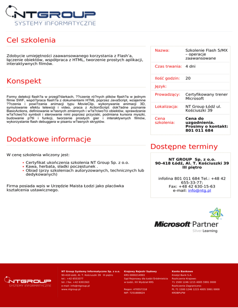 Cel szkolenia Nazwa: Zdobycie umiejętności zaawansowanego korzystania z Flash’a, łączenie obiektów, współpraca z HTML, tworzenie prostych aplikacji, interaktywnych filmów. Szkolenie Flash 5/MX – operacje zaawansowane Czas trwania: 4 dni Ilość godzin: Konspekt 20 Język: Formy detekcji flash?a w przegl?darkach, ??czenie ró?nych plików flash?a w jednym filmie SWF, wspó?praca flash?a z dokumentami HTML poprzez JavaScript, wzajemne ??czenia i powi?zania animacji typu MovieClip, wykonywanie animacji 3D, symulowanie efektu telewizji i video, praca z ActionScript: dok?adne poznanie BasicActions, definiowanie w?asnych zmiennych i w?a?ciwo?ci obiektów, sprawdzanie w?a?ciwo?ci symboli i sterowanie nimi poprzez przyciski, podmiana kursora myszki, budowanie p?tli i funkcji, tworzenie prostych gier i interaktywnych filmów, wykorzystanie flash debuggera w pisaniu w?asnych skryptów. Dodatkowe informacje Prowadzący: Certyfikowany trener Microsoft Lokalizacja: NT Group Łódź ul. Kościuszki 39 Cena szkolenia: Cena do uzgodnienia. Prosimy o kontakt: 801 011 684 Dostępne terminy W cenę szkolenia wliczony jest: Certyfikat ukończenia szkolenia NT Group Sp. z o.o. Kawa, herbata, sładki poczęstunek . Obiad (przy szkoleniach autoryzowanych, technicznych lub dedykowanych) NT GROUP Sp. z o.o. 90-418 Łódź, Al. T. Kościuszki 39 III piętro Firma posiada wpis w Urzędzie Maista Łodzi jako placówka kształcenia ustawicznego. infolina 801 011 684 Tel.: +48 42 655-33-77; Fax: +48 42 630-15-63 e-mail: [email protected] NT Group Systemy Informatyczne Sp. z o.o. Krajowy Rejestr Sądowy Konto Bankowe 90-418 Łódź, Al. T. Kościuszki 39 III piętro KRS 0000214993 Kredyt Bank S.A. tel.: +42 6553377 Sąd Rejonowy dla Łodzi-Śródmieścia Rozliczenie Krajowe: tel. / fax. +42 6301563 w Łodzi, XX Wydział KRS 71 1500 1246 1215 4005 5991 0000 e-mail: [email protected] www.ntgroup.pl Rozliczenie Zagraniczne: Regon: 470557218 PL 71 1500 1246 1215 4005 5991 0000 NIP: 7251888624 KRDBPLPW