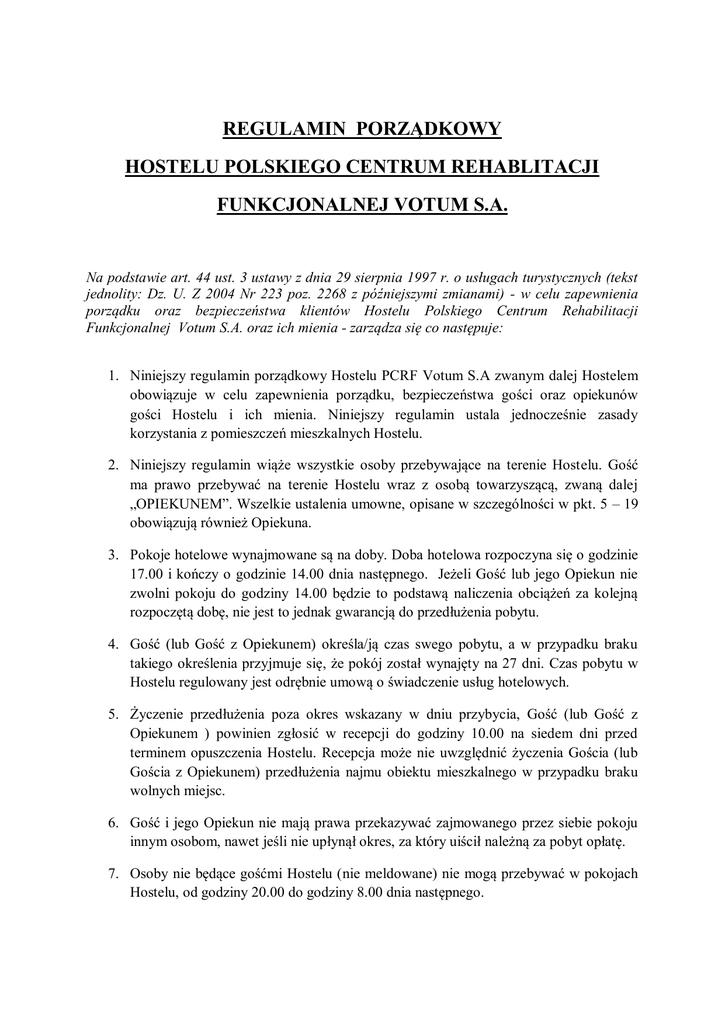 REGULAMIN PORZĄDKOWY HOSTELU POLSKIEGO CENTRUM REHABLITACJI FUNKCJONALNEJ VOTUM S.A. Na podstawie art. 44 ust. 3 ustawy z dnia 29 sierpnia 1997 r. o usługach turystycznych (tekst jednolity: Dz. U. Z 2004 Nr 223 poz. 2268 z późniejszymi zmianami) - w celu zapewnienia porządku oraz bezpieczeństwa klientów Hostelu Polskiego Centrum Rehabilitacji Funkcjonalnej Votum S.A. oraz ich mienia - zarządza się co następuje: 1. Niniejszy regulamin porządkowy Hostelu PCRF Votum S.A zwanym dalej Hostelem obowiązuje w celu zapewnienia porządku, bezpieczeństwa gości oraz opiekunów gości Hostelu i ich mienia. Niniejszy regulamin ustala jednocześnie zasady korzystania z pomieszczeń mieszkalnych Hostelu. 2. Niniejszy regulamin wiąże wszystkie osoby przebywające na terenie Hostelu. Gość ma prawo przebywać na terenie Hostelu wraz z osobą towarzyszącą, zwaną dalej „OPIEKUNEM”. Wszelkie ustalenia umowne, opisane w szczególności w pkt. 5 – 19 obowiązują również Opiekuna. 3. Pokoje hotelowe wynajmowane są na doby. Doba hotelowa rozpoczyna się o godzinie 17.00 i kończy o godzinie 14.00 dnia następnego. Jeżeli Gość lub jego Opiekun nie zwolni pokoju do godziny 14.00 będzie to podstawą naliczenia obciążeń za kolejną rozpoczętą dobę, nie jest to jednak gwarancją do przedłużenia pobytu. 4. Gość (lub Gość z Opiekunem) określa/ją czas swego pobytu, a w przypadku braku takiego określenia przyjmuje się, że pokój został wynajęty na 27 dni. Czas pobytu w Hostelu regulowany jest odrębnie umową o świadczenie usług hotelowych. 5. Życzenie przedłużenia poza okres wskazany w dniu przybycia, Gość (lub Gość z Opiekunem ) powinien zgłosić w recepcji do godziny 10.00 na siedem dni przed terminem opuszczenia Hostelu. Recepcja może nie uwzględnić życzenia Gościa (lub Gościa z Opiekunem) przedłużenia najmu obiektu mieszkalnego w przypadku braku wolnych miejsc. 6. Gość i jego Opiekun nie mają prawa przekazywać zajmowanego przez siebie pokoju innym osobom, nawet jeśli nie upłynął okres, za który uiścił należną za pobyt opłatę. 7. Osoby nie będące gośćmi Hostelu (nie meldowane) nie mogą przebywać w pokojach Hostelu, od godziny 20.00 do godziny 8.00 dnia następnego. 8. W obiektach mieszkalnych należy zachować ciszę nocną od godziny 21.00 do godziny 7.00 dnia następnego. 9. Posiłki wydawane są w jadalni w porach wyznaczonych przez pracowników firmy cateringowej 10. Ze względu na wymagania ochrony przeciwpożarowej w pomieszczeniach mieszkalnych nie wolno używać jakichkolwiek przyrządów lub aparatów zasilanych energią elektryczną lub gazową, niestanowiących wyposażenia tych pomieszczeń i mogących wytworzyć zagrożenie pożarowe np. grzałek elektrycznych, grzejników, żelazek oraz palników gazowych. 11. Każdy gość otrzymuje jeden klucz do pokoju, furtki wejściowej oraz pralni i jest za niego odpowiedzialny od momentu otrzymania do dnia opuszczenia Hostelu. 12. Gość jest zobowiązany do zwrotu kosztów związanych z utratą lub uszkodzeniem klucza do pokoju który zamieszkuje. Za zgubienie lub uszkodzenie klucza obowiązuje opłata 150 złotych. Opłatę uiszcza się w recepcji Hostelu. 13. Gość ponosi pełną odpowiedzialność materialną za wszelkiego rodzaju uszkodzenia lub zniszczenia przedmiotów wyposażenia i urządzeń technicznych obiektów mieszkalnych należących do Hostelu Votum–RehaPlus S.A, które powstaną z winy umyślnej lub nieumyślnej gościa hotelowego, Opiekuna lub z winy osób go odwiedzających. 14. W obiektach noclegowych Hostelu wymiana bielizny pościelowej i ręczników odbywa się co siedem dni. 15. Odpowiedzialność za utratę lub uszkodzenie rzeczy wniesionych przez gości regulują przepisy tytułu XXIX Kodeksu Cywilnego – Odpowiedzialność, prawo zastawu i przedawnienie roszczeń utrzymujących hotele i podobne zakłady. 16. Hostel nie ponosi odpowiedzialności za uszkodzenie lub utratę samochodu lub innego pojazdu należącego do Gościa bądź do jego Opiekuna. Gość i Opiekun przyjmują do wiadomości, że znajdujące się na terenie Hostelu parkingi są parkingami niestrzeżonymi. 17. Przedmioty pozostawione przez Gościa lub Opiekuna w pomieszczeniu mieszkalnym, po opuszczeniu Hostelu zostaną odesłane przez recepcję na koszt Gościa na wskazany przez niego adres. W przypadku braku wskazania przez Gościa adresu, na który mają być odesłane pozostawione rzeczy lub w przypadku braku osobistego odbioru tych rzeczy przez Gościa w ciągu 3 dni od daty wyjazdu Hostel postąpi z rzeczami stosownie do przepisów o rzeczach zagubionych lub znalezionych. 18. Przed każdorazowym opuszczeniem Hostelu Gość zobowiązany jest do zamknięcia okien i pokoju. 19. Zabrania się wprowadzania zwierząt na teren Hostelu. 20. W obiekcie obowiązuje całkowity zakaz palenia. 21. Platformami (dźwigami) znajdującymi się na terenie Hostelu mogą poruszać się tylko osoby niepełnosprawne (Pacjenci). Wyjątek stanowi sytuacja kiedy pacjent jest niesamodzielny, wówczas jego Opiekun może korzystać z danej platformy. Wszystkie pozostałe osoby korzystają z nich tylko na własną odpowiedzialność. 22. Życzenie przedłużenia pobytu poza okres wskazany w dniu przybycia, gość powinien zgłosi w recepcji co najmniej siedem dni roboczych przed dniem w którym upływa termin wynajmu pokoju. 23. Gość powinien zawiadomić dyrekcję obiektu o wystąpieniu szkody, wszelkiego rodzaju usterek sprzętu lub substancji lokalu powstałych nawet bez winy Gościa lub Opiekuna. 24. W przypadku, gdy Gość lub jego Opiekun nie przestrzega regulaminu, łamie powszechnie obowiązujące zasady współżycia społecznego może być poproszony przez personel do opuszczenia Hostelu. W przypadku naruszeń opisanych wyżej a dokonywanych przez Opiekuna Gość ma obowiązek opuszczenia Hostelu razem z Opiekunem. 25. Wcześniejszy wyjazd Gościa z przyczyn niezależnych od Hostelu nie upr