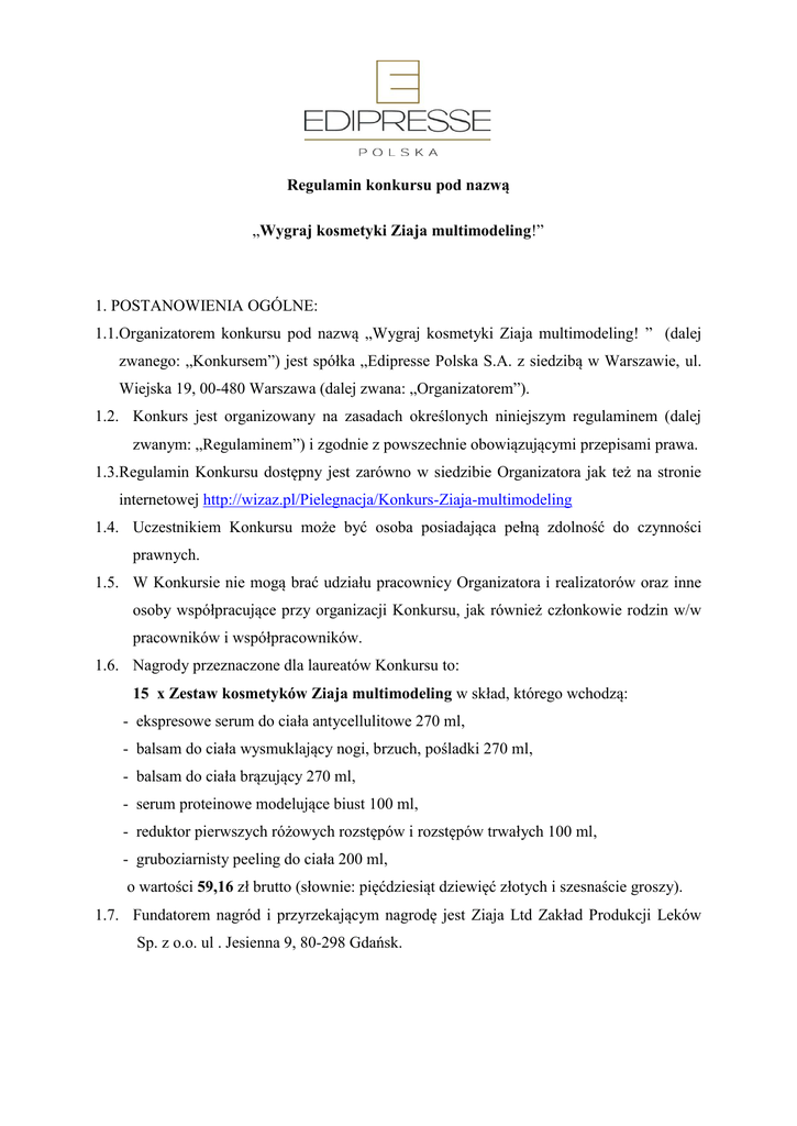Regulamin konkursu pod nazwą „Wygraj kosmetyki Ziaja multimodeling!” 1. POSTANOWIENIA OGÓLNE: 1.1.Organizatorem konkursu pod nazwą „Wygraj kosmetyki Ziaja multimodeling! ” (dalej zwanego: „Konkursem”) jest spółka „Edipresse Polska S.A. z siedzibą w Warszawie, ul. Wiejska 19, 00-480 Warszawa (dalej zwana: „Organizatorem”). 1.2. Konkurs jest organizowany na zasadach określonych niniejszym regulaminem (dalej zwanym: „Regulaminem”) i zgodnie z powszechnie obowiązującymi przepisami prawa. 1.3.Regulamin Konkursu dostępny jest zarówno w siedzibie Organizatora jak też na stronie internetowej http://wizaz.pl/Pielegnacja/Konkurs-Ziaja-multimodeling 1.4. Uczestnikiem Konkursu może być osoba posiadająca pełną zdolność do czynności prawnych. 1.5. W Konkursie nie mogą brać udziału pracownicy Organizatora i realizatorów oraz inne osoby współpracujące przy organizacji Konkursu, jak również członkowie rodzin w/w pracowników i współpracowników. 1.6. Nagrody przeznaczone dla laureatów Konkursu to: 15 x Zestaw kosmetyków Ziaja multimodeling w skład, którego wchodzą: - ekspresowe serum do ciała antycellulitowe 270 ml, - balsam do ciała wysmuklający nogi, brzuch, pośladki 270 ml, - balsam do ciała brązujący 270 ml, - serum proteinowe modelujące biust 100 ml, - reduktor pierwszych różowych rozstępów i rozstępów trwałych 100 ml, - gruboziarnisty peeling do ciała 200 ml, o wartości 59,16 zł brutto (słownie: pięćdziesiąt dziewięć złotych i szesnaście groszy). 1.7. Fundatorem nagród i przyrzekającym nagrodę jest Ziaja Ltd Zakład Produkcji Leków Sp. z o.o. ul . Jesienna 9, 80-298 Gdańsk. 2. ZAŁOŻENIA KONKURSU 2.1. 0Konkurs będzie ogłoszony na serwisie wizaz.pl i przeprowadzony na stronie internetowej http://wizaz.pl/Pielegnacja/Konkurs-Ziaja-multimodeling (ogłoszenie Konkursu). 2.2. Konkurs będzie trwał w dniach 15.04.2016 - 29.04.2016 r i zostanie ogłoszony wraz z datą ukazania się ogłoszenia o Konkursie na serwisie http://wizaz.pl/Pielegnacja/KonkursZiaja-multimodeling 2.3. Rozwiązanie Konkursu i lista laureatów Konkursu w postaci: imię, pierwsza litera nazwiska oraz miejscowość zamieszkania Uczestnika zostaną ogłoszone na serwisie http://wizaz.pl/Pielegnacja/Konkurs-Ziaja-multimodeling w terminie nie później niż 7 dni od ostatniego dnia czasu trwania Konkursu tj. do 06.05.2016. 3. ZASADY PROWADZENIA KONKURSU: 3.1. Zgłoszenie do konkursu polegać będzie na: - wypełnieniu wszystkich wymaganych pól formularza zgłoszeniowego znajdującego się na stronie: http://wizaz.pl/Pielegnacja/Konkurs-Ziaja-multimodeling w tym: - udzieleniu odpowiedzi na zadanie konkursowe: „W jaki sposób dbasz o swoją figurę na wiosnę?”, - podaniu danych osobowych niezbędnych do wysyłki nagrody, - akceptacji regulaminu konkursu. 3.2. Spośród wszystkich Zgłoszeń Komisja Konkursowa wybierze w podanym w punkcie 2.3 terminie 15 Laureatów Nagrody. Przy wyborze najlepszych Zgłoszeń do Konkursu, Komisja Konkursowa kierować się będzie swoim własnym uznaniem, przy czym będzie brać pod uwagę jakość i oryginalność udzielonej odpowiedzi w formularzu zgłoszeniowym. Komisja Konkursowa będzie oceniać Zgłoszenia wyłącznie ze względu na ww. kryteria. Wszelkie inne aspekty Zgłoszenia nie będą oceniane. 3.3. Jedna osoba może wziąć udział w Konkursie jeden raz i może być Laureatem tylko jednej Nagrody. 3.4. O fakcie wygranej Uczestnicy zostaną poinformowani poprzez ogłoszenie w Serwisie na stronie http://wizaz.pl/Pielegnacja/Konkurs-Ziaja-multimodeling listy Laureatów. Lista Laureatów Konkursu zawierać będzie imię, pierwszą literę nazwiska oraz miejscowość zamieszkania Uczestnika. 3.5. Organizator oświadcza, że dane osobowe uczestnika w zakresie: imię i nazwisko, numer telefonu komórkowego lub stacjonarnego, adresu e-mailowego lub odpowiednio adres zamieszkania, będą przetwarzane przez Organizatora Konkursu z siedzibą w Warszawie przy ul. Wiejskiej 19 w celu realizacji umowy przystąpienia do konkursu i jego prawidłowego przeprowadzenia lub marketingu bezpośredniego własnych produktów Organizatora Konkursu. Gwarantujemy prawo wglądu do swoich danych osobowych oraz ich poprawiania, jak również żądania zaprzestania przetwarzania danych. Dane osobowe nie będą udostępniane innym podmiotom. Podanie danych jest dobrowolne. 3.6. Prawa autorskie majątkowe do prac nadesłanych przez uczestników konkursu powinny należeć do uczestników Konkursu. Uczestnicy Konkursu udzielają Organizatorowi licencji niewyłącznej do nadesłanych w ramach Konkursu prac (odpowiedzi na pytanie), bez ograniczeń terytorialnych, na czas trwania Konkursu na polu eksploatacji publiczne udostępnienie w taki sposób, aby każdy mógł mieć dostęp w miejscu i czasie przez siebie wybranym. 3.7. Zgłoszenia muszą być unikalnymi treściami, stworzonymi specjalnie na potrzeby danego konkursu. Teksty, które dostępne są już w Internecie, na innych serwisach, będą dyskwalifikowane. 3.8. Zgłoszenia do Konkursu nie mogą zawierać treści sprzecznych z przepisami prawa lub dobrymi obyczajami. Pełną odpowiedzialność za treści zawarte w Zgłoszeniu ponosi Uczestnik. 3.9. Zgłoszenia niezgodne z Regulaminem lub zawierające treści opisane w poprzedzającym postanowieniu nie będą brane pod uwagę w Konkursie. 4. PRZYZNAWANIE NAGRÓD: 4.1. Laureaci wyłonieni zostaną w wyniku realizacji procedury opisanej w punkcie 3. w terminie najpóźniej do dnia wskazanego w pkt 2.3 powyżej. 4.2. Laureaci powiadomieni zostaną o wygranej poprzez ogłoszenie wyników na stronie konkursowej http://wizaz.pl/Pielegnacja/Konkurs-Ziaja-multimodeling w terminie najpóźniej do dnia wskazanego w pkt.2.3 4.3. Przyrzekający nagrody oświadcza, że wartość każdej z nagród przewidzianych w ramach niniejszego konkursu nie przekracza kwoty 760 PLN netto, o której mowa w art. 21 ust. 1 pkt 68 ustawy z dnia 26 lipca 19