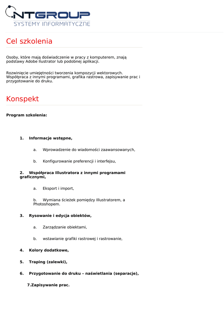 Cel szkolenia Osoby, które mają doświadczenie w pracy z komputerem, znają podstawy Adobe Ilustrator lub podobnej aplikacji. Rozwinięcie umiejętności tworzenia kompozycji wektorowych. Współpraca z innymi programami, grafika rastrowa, zapisywanie prac i przygotowanie do druku. Konspekt Program szkolenia: 1. Informacje wstępne, a. Wprowadzenie do wiadomości zaawansowanych, b. Konfigurowanie preferencji i interfejsu, 2. Współpraca Illustratora z innymi programami graficznymi, a. Eksport i import, b. Wymiana ścieżek pomiędzy Illustratorem, a Photoshopem. 3. Rysowanie i edycja obiektów, a. Zarządzanie obiektami, b. wstawianie grafiki rastrowej i rastrowanie, 4. Kolory dodatkowe, 5. Traping (zalewki), 6. Przygotowanie do druku – naświetlania (separacje), 7.Zapisywanie prac. Dodatkowe informacje W cenę szkolenia wliczony jest: Certyfikat ukończenia szkolenia NT Group Sp. z o.o. Materiały szkoleniowe, notatnik, długopis Kontakt z trenerem po szkoleniu Kawa, herbata, słodki poczęstunek Obiad Nazwa: Firma posiada wpis w Urzędzie Miasta Łodzi jako placówka kształcenia ustawicznego. Szkolenie Adobe Illustrator – operacje zaawansowane Czas trwania: 2 dni Ilość godzin: 16 Język: Prowadzący: Wykształcony grafik, z 20 letnim doświadczeniem zawodowym w dziedzinie grafiki komputerowej oraz wykładowca programów graficznych od 14 lat. Lokalizacja: NT Group Łódź, siedziba klienta, lub dowolne miasto w Polsce Cena szkolenia: 900 PLN Dostępne terminy NT GROUP Sp. z o.o. 90-418 Łódź, Al. T. Kościuszki 39 III piętro infolina 801 011 684 Tel.: +48 42 655-33-77; Fax: +48 42 630-15-63 e-mail: [email protected] NT Group Systemy Informatyczne Sp. z o.o. Krajowy Rejestr Sądowy Konto Bankowe 90-418 Łódź, Al. T. Kościuszki 39 III piętro KRS 0000214993 Kredyt Bank S.A. tel.: +42 6553377 Sąd Rejonowy dla Łodzi-Śródmieścia Rozliczenie Krajowe: tel. / fax. +42 6301563 w Łodzi, XX Wydział KRS 71 1500 1246 1215 4005 5991 0000 e-mail: [email protected] www.ntgroup.pl Rozliczenie Zagraniczne: Regon: 470557218 PL 71 1500 1246 1215 4005 5991 0000 NIP: 7251888624 KRDBPLPW