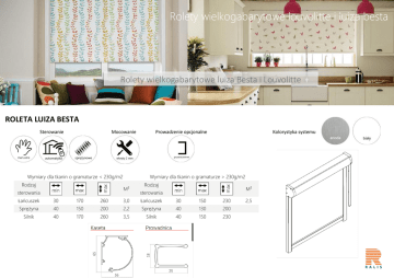 Rolety wielkogabarytowe louvolitte i luiza besta Rolety wielkogabarytowe luiza Besta i Louvolitte ROLETA LUIZA BESTA Sterowanie Mocowanie Wymiary dla tkanin o gramaturze < 230g/m2 Rodzaj Kolorystyka systemu Wymiary dla tkanin o gramaturze > 230g/m2 M² sterowania Prowadzenie opcjonalne Rodzaj M² sterowania Łańcuszek 30 170 260 3,0 Łańcuszek 30 150 230 Sprężyna 40 150 200 2,2 Sprężyna 40 130 200 Silnik 40 170 260 3,5 Silnik 40 150 230 2,5 ROLETY W SYSTEMACH LOUVOLITE WOLNOWISZĄCE Sterowanie Mocowanie Wolnowiszące Louvolite 32 mm Wymiary dla tkanin o gramaturze < 230g/m2 Rodzaj M² sterowania Łańcuszek Wymiary dla tkanin o gramaturze > 230g/m2 50 210 300 5 Rodzaj M² sterowania Łańcuszek 50 190 260 4,5 Kolorystyka : biały, czarny, szary Sposoby montażu: ściana lub sufit Wolnowiszące Louvolite 40/45mm Wymiary dla tkanin o gramaturze < 230g/m2 Rodzaj M² sterowania Łańcuszek Wymiary dla tkanin o gramaturze > 230g/m2 50 250 350 7 50 300 400 10 Silnik fi 40 40 250 400 7 Silnik fi45 55 320 380 9 fi 40 Łańcuszek fi 45 Kolorystyka : biały, czarny, szary Sposoby montażu: ściana lub sufit Rodzaj M² sterowania Łańcuszek 50 220 300 6,2 50 290 350 8 Silnik fi 40 40 220 350 6 Silnik fi45 55 300 320 8 fi 40 Łańcuszek fi45 ROLETY W SYSTEMACH LOUVOLITE KASETOWE Kaseta – Louvolite 32/40 mm Wymiary dla tkanin o gramaturze < 230g/m2 Rodzaj M² sterowania Wymiary dla tkanin o gramaturze > 230g/m2 Rodzaj M² sterowania Łańcuszek 50 250 350 6,3 Łańcuszek 50 220 300 5,2 Silnik 24V 40 250 320 6 Silnik fi 40 40 220 280 5,5 55 200 320 6,4 Silnik fi45 55 180 280 5 Silnik 230V Kolorystyka: biały, czarny Sposoby montażu: ściana lub sufit Informacja dodadtkowa: możliwe wmontowanie sprężyny wspomagającej do łatwiejszego zwijania łańcuszka- sugerowane powyżej 5m2 Kaseta – Louvolite 40/45 mm Wymiary dla tkanin o gramaturze < 230g/m2 Rodzaj M² sterowania Wymiary dla tkanin o gramaturze > 230g/m2 Rodzaj M² sterowania Łańcuszek 50 300 400 7,3 Łańcuszek 50 280 350 6,2 Silnik 24V 50 250 400 7 Silnik 24V 50 220 350 6 55 320 380 9 55 300 320 8 Silnik 230V Silnik 230V Kolorystyka: biały, czarny, szary Sposoby montażu: ściana lub sufit Informacja dodadtkowa: możliwe wmontowanie sprężyny wspomagającej do łatwiejszego zwijania łańcuszka-sugerowane powyżej 6m2