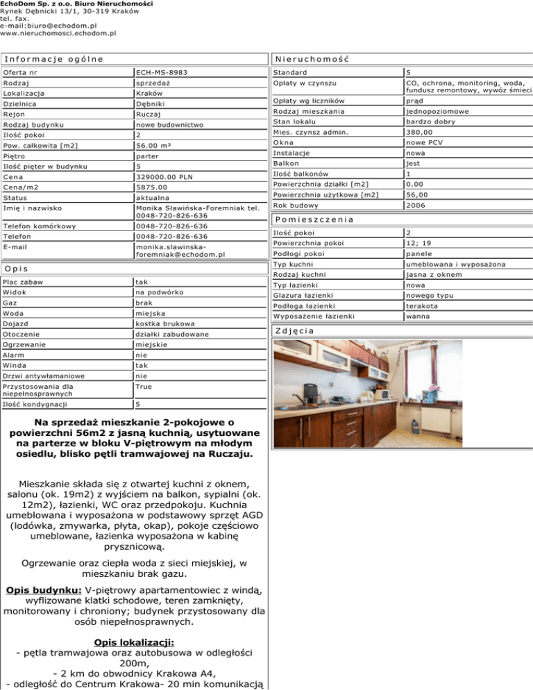 EchoDom Sp. z o.o. Biuro Nieruchomości Rynek Dębnicki 13/1, 30-319 Kraków tel. fax. e-mail:[email protected] www.nieruchomosci.echodom.pl Informacje ogólne Nieruchomość Oferta nr ECH-MS-8983 Standard 5 Rodzaj sprzedaż Opłaty w czynszu Lokalizacja Kraków CO, ochrona, monitoring, woda, fundusz remontowy, wywóz śmieci Dzielnica Dębniki Opłaty wg liczników prąd Ruczaj Rodzaj mieszkania jednopoziomowe Rodzaj budynku nowe budownictwo Stan lokalu bardzo dobry Ilość pokoi 2 Mies. czynsz admin. 380,00 56.00 m² Okna nowe PCV parter Instalacje nowa 5 Balkon jest 329000.00 PLN Ilość balkonów 1 Cena/m2 5875.00 Powierzchnia działki [m2] 0.00 Status aktualna Powierzchnia użytkowa [m2] 56,00 Imię i nazwisko Monika Sławińska-Foremniak tel. 0048-720-826-636 Rok budowy 2006 Telefon komórkowy 0048-720-826-636 Telefon 0048-720-826-636 Rejon Pow. całkowita [m2] Piętro Ilość pięter w budynku Cena E-mail [email protected] Opis Pomieszczenia Ilość pokoi 2 Powierzchnia pokoi 12; 19 Podłogi pokoi panele Typ kuchni umeblowana i wyposażona Rodzaj kuchni jasna z oknem Plac zabaw tak Typ łazienki nowa Widok na podwórko Glazura łazienki nowego typu Gaz brak Podłoga łazienki terakota Woda miejska Wyposażenie łazienki wanna Dojazd kostka brukowa Otoczenie działki zabudowane Ogrzewanie miejskie Alarm nie Winda tak Drzwi antywłamaniowe nie Przystosowania dla niepełnosprawnych True Ilość kondygnacji 5 Na sprzedaż mieszkanie 2-pokojowe o powierzchni 56m2 z jasną kuchnią, usytuowane na parterze w bloku V-piętrowym na młodym osiedlu, blisko pętli tramwajowej na Ruczaju. Mieszkanie składa się z otwartej kuchni z oknem, salonu (ok. 19m2) z wyjściem na balkon, sypialni (ok. 12m2), łazienki, WC oraz przedpokoju. Kuchnia umeblowana i wyposażona w podstawowy sprzęt AGD (lodówka, zmywarka, płyta, okap), pokoje częściowo umeblowane, łazienka wyposażona w kabinę prysznicową. Ogrzewanie oraz ciepła woda z sieci miejskiej, w mieszkaniu brak gazu. Opis budynku: V-piętrowy apartamentowiec z windą, wyflizowane klatki schodowe, teren zamknięty, monitorowany i chroniony; budynek przystosowany dla osób niepełnosprawnych. Opis lokalizacji: - pętla tramwajowa oraz autobusowa w odległości 200m, - 2 km do obwodnicy Krakowa A4, - odległość do Centrum Krakowa- 20 min komunikacją Zdjęcia miejską. W okolicy pełna infrastruktura, blisko szkoła, przedszkola prywatne i samorządowe, Kampus UJ. Świetna inwestycja pod wynajem jak i dla rodziny, polecam! Więcej ofert na EchoDom.pl! BIURO NIERUCHOMOŚCI EchoDom Sp. z o.o.- szeroki wybór ofert. Kompleksowa obsługa przy sprzedaży, wynajmie nieruchomości. Atrakcyjne propozycje kredytowe, sporządzane wedle potrzeb Klientów. ZAPEWNIAMY PROFESJONALIZM I BEZPIECZEŃSTWO ZAWIERANYCH TRANSAKCJI! © Wszelkie prawa zastrzeżone - EchoDom
