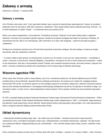 Zabawy z armatą Utworzono: czwartek, 11 sierpnia 2005 Zabawy z armatą Artur Ochniak unika słowa „broń”, choć zgromadził całkiem spory arsenał ze świetnej klasy egzemplarzami. Uważa, że strzelanie większości ludzi źle się kojarzy. Woli więc nazywać je „zabawkami”. Stan swojej kolekcji otacza całkowitą dyskrecją. Ochniak – na co dzień dyspozytor w kopalni „Wujek” – w strzelectwo bawi się od prawie 20 lat. Wolny czas zawsze spędzaliśmy z żoną aktywnie. Chodziliśmy po górach. Zdarzyło mi się nawet zdobyć jeden z alpejskich lodowców. Kontuzja żony przecięła te górskie wyprawy. Serdeczny przyjaciel wyciągnął nas kiedyś na strzelnicę w Wesołej. Ze strzelectwem jest tak: albo w nim zasmakujesz, albo machniesz na to ręką. Nas wciągnęło – wspomina początki przygody z „zabawkami”. W klasyczne strzelectwo sportowe Artur Ochniak bawił się jednak stosunkowo niedługo. Nie tylko dlatego, że jedna po drugiej obumierały, takie jak mysłowicka, strzelnice. – Z czasem zdałem sobie sprawę, że olimpijczykiem na pewno już nie zostanę. A przy tym ten rodzaj strzelania – rozwlekłego w czasie, z tarczami w niezmiennej, ustalonej odległości i zawodnikami, mierzącymi do nich w trzech statycznych postawach – wydał mi się nienaturalny. Któż tak w rzeczywistości strzela? Prawda, sam zawodnik przeżywa emocje, ale trudno porwać i rozgrzać nimi widza – tłumaczy umiarkowany powab nieco skostniałej już formy klasycznego strzelectwa sportowego. Wzorem agentów FBI Od tej rutyny Artur Ochniak uciekł w nową zabawę, czyli w tzw. strzelectwo praktyczne. Ze Stanów Zjednoczonych do Polski przeflancował je Janusz Michalik, obywatel Niemiec polskiego pochodzenia. Za oceanem już w latach 30. ubiegłego stulecia kierownictwo FBI uznało, że szkolenie agenta nie może polegać wyłącznie na strzelaniu statycznym, albowiem wyzwania realnych akcji są dużo bardziej skomplikowane i wymagające perfekcyjnego posługiwania się bronią. Na ogół jest to strzelanie w biegu, zza rozmaitych zasłon i w wielu innych, nieprzewidywalnych okolicznościach. W ten sposób narodziła się nowa strzelecka dyscyplina sportowa. W 1976 r. powstała Międzynarodowa Federacja Strzelectwa Praktycznego (International Practical Shooting Confederation – IPSC). Jej siedzibą jest Kanada. Polski Związek Strzelectwa Praktycznego został zarejestrowany w 1997 r. w Koszalinie. Jego pierwszym prezydentem został wspomniany Janusz Michalik. Szybko jednak stolicą nowej dyscypliny stał się Śląsk. Już w dwa lata później w Zabrzu rozegrano pierwsze Międzynarodowe Mistrzostwa Polski. Układ dynamiczny – Atrakcyjność strzelania praktycznego, albo – jak zwykło się je też określać – strzelania inaczej tkwi w jego dynamice, ustawicznym ruchu, rozmaitości scenografii, presji czasu, widowiskowości i rozmaitości stosowanych „zabawek”. Na ogół strzela się z potężnych kalibrów. Najpopularniejszym jest „czterdziestka” – Artur Ochniak opisuje walory takiej „armaty” i świeżość nowej dyscypliny. Dziś w strzelectwo praktyczne bawi się już w Polsce około 300 osób, na Śląsku – przeszło 70, w samym „Wujku” – kilka. Fenomen niesłychanego rozwoju zainteresowania tą dyscypliną nakręca – zdaniem Ochniaka – właśnie owa niepowtarzalność. – Tor za każdym razem jest inny. W jego scenografii może być zainscenizowany lasek lub fragment miasteczka z Dzikiego Zachodu. Istnieje też różnorodność tarcz, niczym nie przypominających tych z tradycyjnej strzelnicy. W tej zabawie istnieje dowolność technik i stylu. Liczy się szybkość i skuteczność. Najbardziej charakterystyczną cechą tej dyscypliny jest sposób punktacji. Wynik na tarczach tzw. metodą coomstock dzieli się przez czas zawodnika. Jest on obniżany za trafienia w tarcze „karne” („nie strzelać”) – Artur Ochniak demonstruje timer, czyli rodzaj stopera, rejestrującego czas po hukach wystrzałów. Rygorystyczne przepisy Swoboda strzelca ma jedno, żelazne ograniczenie. Jest nim wymóg respektowania niesłychanie rygorystycznych zasad bezpieczeństwa. Za nawet najmniejsze ich naruszenie sędziowie nakładają jedyną w takich sytuacjach karę – dyskwalifikację z zawodów. Artur Ochniak wielokrotnie uczestniczył w zawodach rangi Mistrzostw Polski i międzynarodowych. Jako członek zarządu Związku Strzelectwa Praktycznego często angażuje się również w ich organizację. Ma także status sędziego. – W strzelaniu praktycznym jest rywalizacja, jest ruch, jest sprawność, siła... Ale mnie pociąga w nim, nawet nie tyle wykazywanie się pewnością ręki i celnością oka, lecz przede wszystko trening w panowaniu nad emocjami. Ten sport pozwala mi oderwać się od codzienności, od stresu, jaki niesie praca w kopalni. Jest też okazją do poznawania innych ludzi. Ten rodzaj strzelectwa w sporej części uprawiają mundurowi, ale też mechanicy samochodowi, prawnicy, lekarze... Wśród członków ZSP na Śląsku mamy na przykład fantastycznie strzelającego stomatologa. Nasze spotkania mają więc nie tylko sportowy, lecz towarzyski wymiar – opowiada dyspozytor z „Wujka”. W kolorycie westernu Taki towarzyski koloryt – Ochniak wertuje album z dziesiątkami fotografii z zawodów w Rembertowie – ma tzw. wielobój kowbojski. Strzela się w nim z replik broni z epoki w scenografii wyjętej z Dzikiego Zachodu. Także w stroju każdego z zawodników musi znajdować się co najmniej jeden „kowbojski” rekwizyt. Ich ocena to, notabene, odrębny konkurs. Działacze Polskiego Związku Strzelectwa Sportowego długo krzywili się na strzelających „inaczej”. Dziś strzelcy „praktyczni” przenoszą się akurat z Zabrza do siedziby Okręgowego ZSS w Katowicach. – Każda dyscyplina sportowa ewoluuje i ortodoksyjni tradycjonaliści muszą przegrać z nowymi trendami i zjawiskami – uśmiecha się Artur Ochniak. J