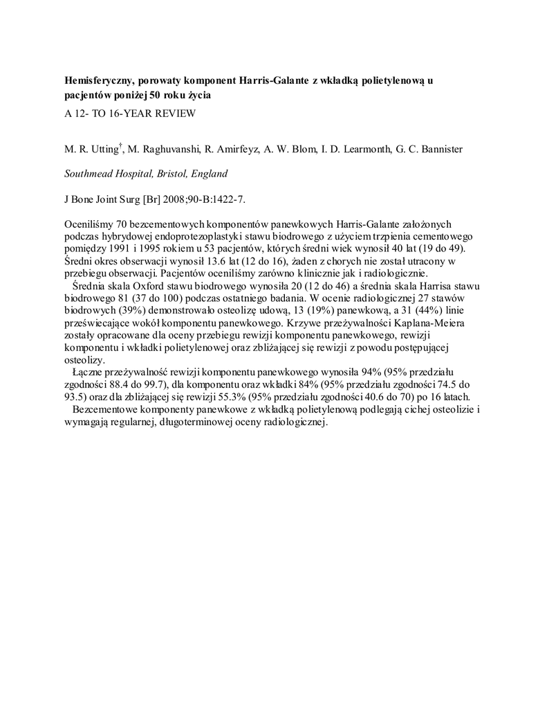 Hemisferyczny, porowaty komponent Harris-Galante z wkładką polietylenową u pacjentów poniżej 50 roku życia A 12- TO 16-YEAR REVIEW M. R. Utting†, M. Raghuvanshi, R. Amirfeyz, A. W. Blom, I. D. Learmonth, G. C. Bannister Southmead Hospital, Bristol, England J Bone Joint Surg [Br] 2008;90-B:1422-7. Oceniliśmy 70 bezcementowych komponentów panewkowych Harris-Galante założonych podczas hybrydowej endoprotezoplastyki stawu biodrowego z użyciem trzpienia cementowego pomiędzy 1991 i 1995 rokiem u 53 pacjentów, których średni wiek wynosił 40 lat (19 do 49). Średni okres obserwacji wynosił 13.6 lat (12 do 16), żaden z chorych nie został utracony w przebiegu obserwacji. Pacjentów oceniliśmy zarówno klinicznie jak i radiologicznie. Średnia skala Oxford stawu biodrowego wynosiła 20 (12 do 46) a średnia skala Harrisa stawu biodrowego 81 (37 do 100) podczas ostatniego badania. W ocenie radiologicznej 27 stawów biodrowych (39%) demonstrowało osteolizę udową, 13 (19%) panewkową, a 31 (44%) linie przeświecające wokół komponentu panewkowego. Krzywe przeżywalności Kaplana-Meiera zostały opracowane dla oceny przebiegu rewizji komponentu panewkowego, rewizji komponentu i wkładki polietylenowej oraz zbliżającej się rewizji z powodu postępującej osteolizy. Łączne przeżywalność rewizji komponentu panewkowego wynosiła 94% (95% przedziału zgodności 88.4 do 99.7), dla komponentu oraz wkładki 84% (95% przedziału zgodności 74.5 do 93.5) oraz dla zbliżającej się rewizji 55.3% (95% przedziału zgodności 40.6 do 70) po 16 latach. Bezcementowe komponenty panewkowe z wkładką polietylenową podlegają cichej osteolizie i wymagają regularnej, długoterminowej oceny radiologicznej.