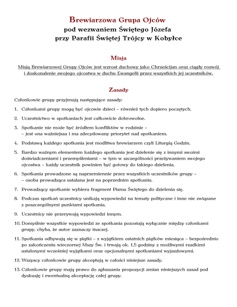 Brewiarzowa Grupa Ojców pod wezwaniem Świętego Józefa przy Parafii Świętej Trójcy w Kobyłce Misja Misją Brewiarzowej Grupy Ojców jest wzrost duchowy jako Chrześcijan oraz ciągły rozwój i doskonalenie swojego ojcostwa w duchu Ewangelii przez wszystkich jej uczestników. Zasady Członkowie grupy przyjmują następujące zasady: 1. Członkami grupy mogą być ojcowie dzieci – również tych dopiero poczętych. 2. Uczestnictwo w spotkaniach jest całkowicie dobrowolne. 3. Spotkanie nie może być źródłem konfliktów w rodzinie – – jest ona ważniejsza i ma zdecydowany priorytet nad spotkaniem. 4. Podstawą każdego spotkania jest modlitwa brewiarzem czyli Liturgią Godzin. 5. Bardzo ważnym elementem każdego spotkania jest dzielenie się z innymi swoimi doświadczeniami i przemyśleniami – w tym w szczególności przeżywaniem swojego ojcostwa – każdy uczestnik powinien być gotowy do takiego dzielenia. 6. Spotkania prowadzone są naprzemiennie przez wszystkich uczestników grupy – – osoba prowadząca ustalana jest na poprzednim spotkaniu. 7. Prowadzący spotkanie wybiera fragment Pisma Świętego do dzielenia się. 8. Podczas spotkań uczestnicy unikają wypowiedzi na tematy polityczne i inne nie związane z poszczególnymi punktami spotkania. 9. Uczestnicy nie przerywają wypowiedzi innym. 10. Domyślnie wszystkie wypowiedzi ze spotkania pozostają wyłącznie między członkami grupy, chyba, że autor zaznaczy inaczej. 11. Spotkania odbywają się w piątki – z wyjątkiem ostatnich piątków miesiąca – bezpośrednio po zakończeniu wieczornej Mszy Św. i trwają ok. 1,5 godziny z możliwymi rzadkimi ustalonymi wcześniej wyjątkami oraz opcjonalnymi spotkaniami wyjazdowymi. 12. Wszyscy członkowie grupy akceptują w całości niniejsze zasady. 13. Członkowie grupy mają prawo do zgłaszania propozycji zmian niniejszych zasad pod dyskusję i ewentualną akceptację całej grupy.