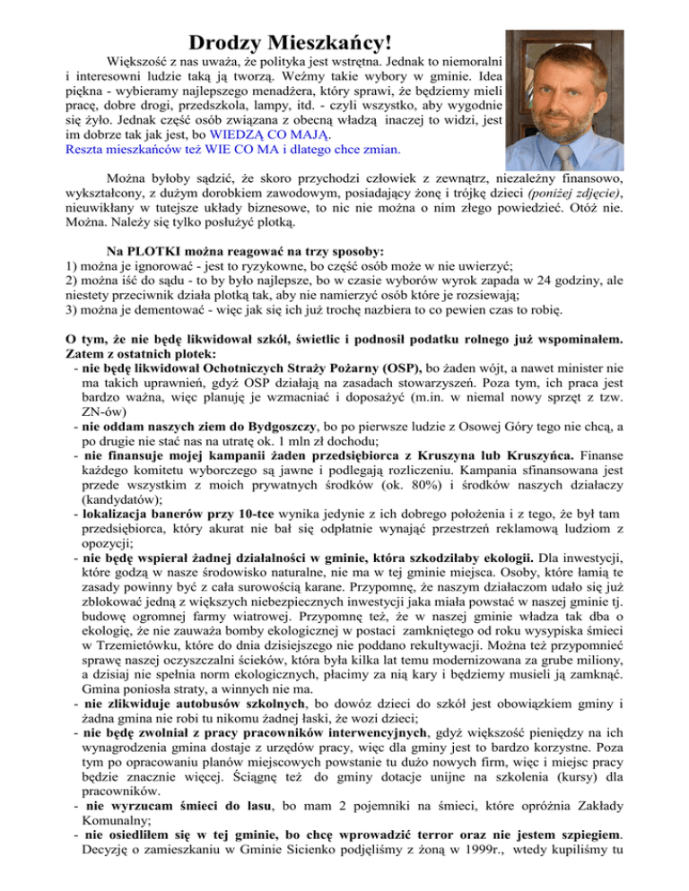 Drodzy Mieszkańcy! Większość z nas uważa, że polityka jest wstrętna. Jednak to niemoralni i interesowni ludzie taką ją tworzą. Weźmy takie wybory w gminie. Idea piękna - wybieramy najlepszego menadżera, który sprawi, że będziemy mieli pracę, dobre drogi, przedszkola, lampy, itd. - czyli wszystko, aby wygodnie się żyło. Jednak część osób związana z obecną władzą inaczej to widzi, jest im dobrze tak jak jest, bo WIEDZĄ CO MAJĄ. Reszta mieszkańców też WIE CO MA i dlatego chce zmian. Można byłoby sądzić, że skoro przychodzi człowiek z zewnątrz, niezależny finansowo, wykształcony, z dużym dorobkiem zawodowym, posiadający żonę i trójkę dzieci (poniżej zdjęcie), nieuwikłany w tutejsze układy biznesowe, to nic nie można o nim złego powiedzieć. Otóż nie. Można. Należy się tylko posłużyć plotką. Na PLOTKI można reagować na trzy sposoby: 1) można je ignorować - jest to ryzykowne, bo część osób może w nie uwierzyć; 2) można iść do sądu - to by było najlepsze, bo w czasie wyborów wyrok zapada w 24 godziny, ale niestety przeciwnik działa plotką tak, aby nie namierzyć osób które je rozsiewają; 3) można je dementować - więc jak się ich już trochę nazbiera to co pewien czas to robię. O tym, że nie będę likwidował szkół, świetlic i podnosił podatku rolnego już wspominałem. Zatem z ostatnich plotek: - nie będę likwidował Ochotniczych Straży Pożarny (OSP), bo żaden wójt, a nawet minister nie ma takich uprawnień, gdyż OSP działają na zasadach stowarzyszeń. Poza tym, ich praca jest bardzo ważna, więc planuję je wzmacniać i doposażyć (m.in. w niemal nowy sprzęt z tzw. ZN-ów) - nie oddam naszych ziem do Bydgoszczy, bo po pierwsze ludzie z Osowej Góry tego nie chcą, a po drugie nie stać nas na utratę ok. 1 mln zł dochodu; - nie finansuje mojej kampanii żaden przedsiębiorca z Kruszyna lub Kruszyńca. Finanse każdego komitetu wyborczego są jawne i podlegają rozliczeniu. Kampania sfinansowana jest przede wszystkim z moich prywatnych środków (ok. 80%) i środków naszych działaczy (kandydatów); - lokalizacja banerów przy 10-tce wynika jedynie z ich dobrego położenia i z tego, że był tam przedsiębiorca, który akurat nie bał się odpłatnie wynająć przestrzeń reklamową ludziom z opozycji; - nie będę wspierał żadnej działalności w gminie, która szkodziłaby ekologii. Dla inwestycji, które godzą w nasze środowisko naturalne, nie ma w tej gminie miejsca. Osoby, które łamią te zasady powinny być z cała surowością karane. Przypomnę, że naszym działaczom udało się już zblokować jedną z większych niebezpiecznych inwestycji jaka miała powstać w naszej gminie tj. budowę ogromnej farmy wiatrowej. Przypomnę też, że w naszej gminie władza tak dba o ekologię, że nie zauważa bomby ekologicznej w postaci zamkniętego od roku wysypiska śmieci w Trzemietówku, które do dnia dzisiejszego nie poddano rekultywacji. Można też przypomnieć sprawę naszej oczyszczalni ścieków, która była kilka lat temu modernizowana za grube miliony, a dzisiaj nie spełnia norm ekologicznych, płacimy za nią kary i będziemy musieli ją zamknąć. Gmina poniosła straty, a winnych nie ma. - nie zlikwiduje autobusów szkolnych, bo dowóz dzieci do szkół jest obowiązkiem gminy i żadna gmina nie robi tu nikomu żadnej łaski, że wozi dzieci; - nie będę zwolniał z pracy pracowników interwencyjnych, gdyż większość pieniędzy na ich wynagrodzenia gmina dostaje z urzędów pracy, więc dla gminy jest to bardzo korzystne. Poza tym po opracowaniu planów miejscowych powstanie tu dużo nowych firm, więc i miejsc pracy będzie znacznie więcej. Ściągnę też do gminy dotacje unijne na szkolenia (kursy) dla pracowników. - nie wyrzucam śmieci do lasu, bo mam 2 pojemniki na śmieci, które opróżnia Zakłady Komunalny; - nie osiedliłem się w tej gminie, bo chcę wprowadzić terror oraz nie jestem szpiegiem. Decyzję o zamieszkaniu w Gminie Sicienko podjęliśmy z żoną w 1999r., wtedy kupiliśmy tu działkę i wystąpiliśmy o pozwolenie na budowę. Całe swoje życie zawodowe zajmowałem się finansami publicznymi, najpierw jako gł. księgowy, później 8 lat jako specjalista od finansów w Departamencie Budżetowym Ministerstwa ON. Pracę w Ministerstwie zakończyłem w momencie ukończenia budowy domu i znalezienia pracy (audytora w dwóch urzędach miejskich). Odejście z MON-u po 15 latach jest bardzo popularne wśród mundurowych lekarzy, informatyków, prawników lub, tak jak w moim przypadku, finansistów. Jeżeli są jeszcze jakieś plotki, które warto zdementować to proszę o kontakt za pośrednictwem strony www.nasze-sicienko.pl. Na koniec chciałbym zaapelować, że jeżeli są urzędnicy bądź inni pracownicy gminni, którzy zamiast pracować zajmują się agitacją wyborczą lub rozsiewaniem kłamliwych informacji, to z całą stanowczością powiem, że dla dobra nas wszystkich powinni zmienić miejsce swojego zatrudnienia. Jeżeli jesteś moim zwolennikiem i wierzysz, że moja praca ma sens, bardzo Cię proszę o pomoc. Wydrukuj ten list i zanieś go swoim przyjaciołom i sąsiadom. Dużo osób nie korzysta z Internetu, więc do nich ta informacja nigdy nie dotrze. Ta gmina może być silna i nowoczesna. Jednak, aby tak się stało wszyscy musimy podjąć ten ostatni wysiłek i pójść 5 grudnia na wybory, bo będzie liczył się każdy głos. Może to właśnie Twój Głos zdecyduje o naszym losie przez kolejne 4 lata. Pozdrawiam Piotr Chudzyński Zdjęcie mojej rodziny (bez naszej kotki, bo nie dała się namówić)