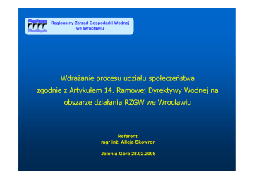 Regionalny Zarząd Gospodarki Wodnej we Wrocławiu WdraŜanie procesu udziału społeczeństwa zgodnie z Artykułem 14. Ramowej Dyrektywy Wodnej na obszarze działania RZGW we Wrocławiu Referent: mgr inŜ. Alicja Skowron Jelenia Góra 28.02.2008 Udział społeczeństwa zgodnie z art. 14 Ramowej Dyrektywy Wodnej Dyrektywa 2000/60/WE Parlamentu Europejskiego i Rady z dnia 23 października 2000 r. ustanawiająca ramy wspólnotowego działania w dziedzinie polityki wodnej (tzw. Ramowa Dyrektywa Wodna) nakreśla potrzebę udziału społeczeństwa planów gospodarowania umoŜliwienia w procesie wodami, społeczeństwu przygotowywania a tym wywierania samym wpływu na merytoryczną zawartość i realizację powyŜszych planów. Udział społeczeństwa zgodnie z art. 14 Ramowej Dyrektywy Wodnej Artykuł 14: Informowanie społeczeństwa i konsultacje społeczne 1. Państwa Członkowskie zachęcają wszystkie zainteresowane strony do czynnego udziału we wdraŜaniu niniejszej dyrektywy, w szczególności w opracowywaniu, przeglądzie i uaktualnianiu planów gospodarowania wodami na obszarach dorzeczy. Państwa Członkowskie zapewniają, Ŝe dla kaŜdego obszaru dorzecza zostaną opublikowane i udostępnione społeczeństwu, równieŜ uŜytkownikom, w celu zgłaszania uwag, następujące informacje: a) harmonogram i program prac związanych z tworzeniem planu, w tym wykaz konsultacji społecznych, które naleŜy przeprowadzić, co najmniej trzy lata przed rozpoczęciem okresu, do którego odnosi się plan; b) wyniki okresowego przeglądu istotnych problemów gospodarki wodnej, określonych dla danego dorzecza, co najmniej przed rozpoczęciem okresu, do którego odnosi c) projekty dwa lata się plan; planu gospodarowania wodami na obszarze dorzecza, co najmniej rok przed rozpoczęciem okresu, którego dotyczy plan. Udział społeczeństwa zgodnie z art. 14 Ramowej Dyrektywy Wodnej Wymogi dotyczące udziału społeczeństwa wprowadza Artykuł 14 Ramowej Dyrektywy Wodnej, która zakłada trzy formy udziału społeczeństwa: Dostęp do informacji Trzystopniowe konsultacje w ramach procesu planowania Aktywne zaangaŜowanie zainteresowanych stron we wszystkie aspekty wdraŜania RDW DOSTARCZANIE INFORMACJI KONSULTACJE naleŜy zapewnić CZYNNE ZAANGAśOWANIE naleŜy zachęcać PROGRAM UDZIAŁU SPOŁECZEŃSTWA W PROCESIE PLANOWANIA GOSPODAROWANIA WODAMI W POLSCE ZGODNIE WYMAGANIAMI RDW W sierpniu 2005 roku został opracowany Program Udziału Społeczeństwa we wdraŜaniu RDW w Polsce przez Zespół ds. Udziału Społeczeństwa przy Departamencie Zasobów Wodnych MŚ. W Programie uwzględniono m. in.: Szczegółowe wytyczne na temat organizacji procesu udziału społeczeństwa na poziomie krajowym Zidentyfikowano i wybrano grupy społeczne, które naleŜy zaangaŜować we wdraŜanie RDW Ustalono instytucje państwowe i samorządowe odpowiedzialne za zapewnienie Udziału społeczeństwa oraz formy, metody i narzędzia realizacji Program udziału społeczeństwa w procesie planowania gospodarowania wodami w regionach wodnych na obszarze działania RZGW we Wrocławiu na rok 2007 (z uwzględnieniem perspektywy na lata 2008-2009) W celu skoordynowania i sprawnej realizacji działań prowadzonych w ramach wdraŜania RDW, Krajowy Zarząd Gospodarki Wodnej opracował „Wykaz zadań i działań dla procesu planowania gospodarowania wodami zgodnie z wymaganiami RDW w Polsce w latach 2006 – 2010”. PoniewaŜ Wykaz ten jest dokumentem nadrzędnym względem innych dokumentów tworzonych w procesie planowania gospodarowania wodami, zaistniała konieczność aktualizacji „Programu udziału społeczeństwa na poziomie krajowym….”, dokument otrzymał tytuł „Program udziału społeczeństwa w procesie planowania gospodarowania wodami w Polsce zgodnie z wymaganiami Ramowej Dyrektywy Wodnej”. Aktualizacji dokonała Grupa Robocza ds. Konsultacji Społecznych (GR ds. KS) utworzona w ramach krajowej struktury grup roboczych, powstała w miejsce Zespołu ds. Udziału Społeczeństwa. Program udziału społeczeństwa w procesie planowania gospodarowania wodami w regionach wodnych na obszarze działania RZGW we Wrocławiu na rok 2007 (z uwzględnieniem perspektywy na lata 2008-2009) W związku z tym Regionalny Zarząd Gospodarki Wodnej we Wrocławiu opracował „Program Udziału Społeczeństwa w procesie planowania gospodarowania wodami w regionach wodnych na obszarze działania RZGW we Wrocławiu na rok 2007” (z uwzględnieniem perspektywy na lata 2008 – 2009) będący aktualizacją pierwotnego „Programu udziału społeczeństwa…” Na obszarze działania RZGW we Wrocławiu znajduje się sześć regionów wodnych: region wodny Środkowej Odry, region wodny Morawy, region wodny Izery, region wodny Łaby i OstroŜnicy (Upa), region wodny Metuje, region wodny Orlicy. Przebieg realizacji procesu udziału społeczeństwa na obszarze działania RZGW we Wrocławiu NARZĘDZIA PROCESU UDZIAŁU SPOŁECZEŃSTWA RADA GOSPODARKI WODNEJ REGIONU WODNEGO ŚRODKOWEJ ODRY STAŁA KOMISJA ds. UDZIAŁU SPOŁECZEŃSTWA INTERNET MEDIA FORUM INTERAKTYWNE BROSZURY ULOTKI INFORMACYJNE FOLDERY ANKIETY Przebieg realizacji procesu udziału społeczeństwa na obszarze działania RZGW we Wrocławiu Koordynacją i prowadzeniem spraw bieŜących związanych z procesem wdraŜania udziału społeczeństwa oraz działaniem Stałej Komisji ds. Udziału Społeczeństwa zajmują się pracownicy merytoryczni Wydziału Współpracy Międzynarodowej. Główne zadania: prowadzenie procesu komunikacji i informowania społeczeństwa; czynne zaangaŜowanie społeczeństwa w proces planowania i gospodarowania wodami w dorzeczu; organizowanie spotkań na wniosek Rady Gospodarki Wodnej Regionu Wodnego Środkowej Odry oraz Stałej Komisji ds. Udziału Społeczeństwa Wszelkie dokumenty są udostępniane w na stronie internetowej RZGW we Wrocławiu oraz wyłoŜone w siedzibie RZGW i jego jednostkach terenowych jak równieŜ innych wybranych miejscach public