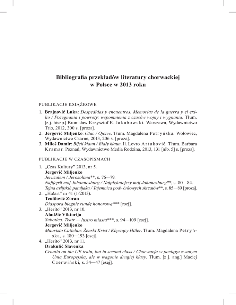 Bibliografia przekładów literatury chorwackiej w Polsce w 2013 roku PUBLIKACJE KSIĄŻKOWE 1. Brajnović Luka: Despedidas y encuentros. Memorias de la guerra y el exi‑ lio / Pożegnania i powroty: wspomnienia z czasów wojny i wygnania. Tłum. [z j. hiszp.] Bronisław Krzysztof E. Ja k u b owsk i. Warszawa, Wydawnictwo Trio, 2012, 300 s. [proza]. 2. Jergović Miljenko: Otac / Ojciec. Tłum. Magdalena Pe t r y ń sk a. Wołowiec, Wydawnictwo Czarne, 2013, 206 s. [proza]. 3. Miloš Damir: Bijeli klaun / Biały klaun. Il. Lovro A r t u kov ić. Tłum. Barbara K r a m a r. Poznań, Wydawnictwo Media Rodzina, 2013, 131 [nlb. 5] s. [proza]. PUBLIKACJE W CZASOPISMACH 1. „Czas Kultury” 2013, nr 5. Jergović Miljenko Jeruzalem / Jerozolima**, s. 76 —79. Najljepši moj Johannesburg / Najpiękniejszy mój Johanesburg**, s. 80 —84. Tajna avlijskih patuljaka / Tajemnica podwórkowych skrzatów**, s. 85—89 [proza]. 2. „Ha!art” nr 41 (1/2013). Teofilović Zoran Diaspora biegnie rundę honorową*** [esej]. 3. „Herito” 2013, nr 10. Aladžić Viktorija Subotica. Teatr — lustro miasta***, s. 94 —109 [esej]. Jergović Miljenko Maurizio Cattelan: Ženski Krist / Klęczący Hitler. Tłum. Magdalena Pe t r y ń sk a, s. 180 —193 [esej]. 4. „Herito” 2013, nr 11. Drakulić Slavenka Croatia on the UE train, but in second class / Chorwacja w pociągu zwanym Unią Europejską, ale w wagonie drugiej klasy. Tłum. [z j. ang.] Maciej Cz e r w i ń sk i, s. 34 — 47 [esej]. 42 Przekłady chorwacko‑polskie i polsko‑chorwackie Matvejević Predrag O idei jugosłowiańskiej przed i po Jugosławii*. Tłum. Maciej Cz e r w i ń sk i, s. 48—59 [esej]. Špikić Marko Przyszłość przeszłości w Chorwacji*. Tłum. Maciej Cz e r w i ń sk i, s. 60 —73 [esej]. 5. „Literatura na Świecie” 2013, nr 5— 6. Benić Gordana Osiem wierszy prozą [wybrane wiersze z tomiku Oblik duše] Dijalozi o tami / Dialogi o ciemności, s. 401— 402. Električni svemir / Elektryczny wszechświat, s. 397—398. Izravni prijenos / Bezpośredni przekaz, s. 396 —397. Krivotvorine i čuda / Falsyfikaty i cuda, s. 398—399. Nebeski događaj / Niebiańskie wydarzenie, s. 402. Posljednji geografi / Ostatni geografowie, s. 399— 400. San i prva opsjena / Sen i pierwsze złudzenie, s. 395—396. Zemlja nulta / Ziemia Nulta. Tłum. Dorota Jovanka Ći rl ić, s. 400 — 401 [poezja]. Jergović Miljenko Dvori od oraha / Orzechowe dwory [fragment powieści], s. 171—190. Wilimowski / Wilimowski [fragment powieści]. Tłum. Magdalena Pe t r y ń sk a, s. 191—221 [proza]. 6. „Odra” 2013, nr 7—8. Jergović Miljenko Grob / Grób. Tłum. Maciej Cz e r w i ń sk i, s. 73—75. Komunist / Komunista. Tłum. Miłosz Wa l igór sk i, s. 69—71. Vrtlar / Ogrodnik. Tłum. Maciej Cz e r w i ń sk i, s. 71—73 [opowiadania ze zbioru Sarajevski Marlboro], [proza]. 7. „Res Publica Nowa” 2013, nr 23 (213). Jergović Miljenko Nadmorska baśń*. Tłum. Miłosz Wa l igór sk i, s. 155—157 [proza]. [ze zbioru Drugi poljubac Gite Danon] 8. „Teatr Lalek” 2013, nr 1 (111—112). Kroflin Livija Ścieżki chorwackiego lalkarstwa*** [esej]. Opracowała Katarzyna Majdzik