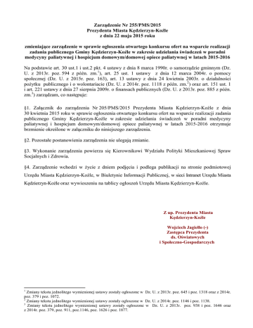 Zarządzenie Nr 255/PMS/2015 Prezydenta Miasta Kędzierzyn-Koźle z dnia 22 maja 2015 roku zmieniające zarządzenie w sprawie ogłoszenia otwartego konkursu ofert na wsparcie realizacji zadania publicznego Gminy Kędzierzyn-Koźle w zakresie udzielania świadczeń w poradni medycyny paliatywnej i hospicjum domowym/domowej opiece paliatywnej w latach 2015-2016 Na podstawie art. 30 ust.1 i ust.2 pkt. 4 ustawy z dnia 8 marca 1990r. o samorządzie gminnym (Dz. U. z 2013r. poz. 594 z późn. zm.1), art. 25 ust. 1 ustawy z dnia 12 marca 2004r. o pomocy społecznej (Dz. U. z 2015r. poz. 163), art. 13 ustawy z dnia 24 kwietnia 2003r. o działalności pożytku publicznego i o wolontariacie (Dz. U. z 2014r. poz. 1118 z późn. zm.2) oraz art. 151 ust. 1 i art. 221 ustawy z dnia 27 sierpnia 2009r. o finansach publicznych (Dz. U. z 2013r. poz. 885 z późn. zm.3) zarządzam, co następuje: §1. Załącznik do zarządzenia Nr 205/PMS/2015 Prezydenta Miasta Kędzierzyn-Koźle z dnia 30 kwietnia 2015 roku w sprawie ogłoszenia otwartego konkursu ofert na wsparcie realizacji zadania publicznego Gminy Kędzierzyn-Koźle w zakresie udzielania świadczeń w poradni medycyny paliatywnej i hospicjum domowym/domowej opiece paliatywnej w latach 2015-2016 otrzymuje brzmienie określone w załączniku do niniejszego zarządzenia. §2. Pozostałe postanowienia zarządzenia nie ulegają zmianie. §3. Wykonanie zarządzenia powierza się Kierownikowi Wydziału Polityki Mieszkaniowej Spraw Socjalnych i Zdrowia. §4. Zarządzenie wchodzi w życie z dniem podjęcia i podlega publikacji na stronie podmiotowej Urzędu Miasta Kędzierzyn-Koźle, w Biuletynie Informacji Publicznej, w sieci Intranet Urzędu Miasta Kędzierzyn-Koźle oraz wywieszeniu na tablicy ogłoszeń Urzędu Miasta Kędzierzyn-Koźle. Z up. Prezydenta Miasta Kędzierzyn-Koźle Wojciech Jagiełło (-) Zastępca Prezydenta ds. Oświatowych i Społeczno-Gospodarczych 1 Zmiany tekstu jednolitego wymienionej ustawy zostały ogłoszone w Dz. U. z 2013r. poz. 645 i poz. 1318 oraz z 2014r. poz. 379 i poz. 1072. 2 Zmiany tekstu jednolitego wymienionej ustawy zostały ogłoszone w Dz. U. z 2014r. poz. 1146 i poz. 1138. 3 Zmiany tekstu jednolitego wymienionej ustawy zostały ogłoszone w Dz. U. z 2013r. poz. 938 i poz. 1646 oraz z 2014r. poz. 379, poz. 911, poz.1146, poz. 1626 i poz. 1877. Załącznik do Zarządzenia Nr 205 /PMS/2015 Prezydenta Miasta Kędzierzyn – Koźle z dnia 30 kwietnia 2015 roku zmieniony Zarządzeniem Nr 255 /PMS/2015 Prezydenta Miasta Kędzierzyn – Koźle z dnia 22 maja 2015 roku Ogłoszenie otwartego konkursu ofert na wsparcie realizacji zadania publicznego Gminy Kędzierzyn-Koźle w zakresie udzielania świadczeń w poradni medycyny paliatywnej i hospicjum domowym/domowej opiece paliatywnej w latach 2015-2016 Na podstawie art. 25 ust. 1 ustawy z dnia 12 marca 2004r. o pomocy społecznej (Dz. U. z 2015r. poz. 163), art. 13 ustawy z dnia 24 kwietnia 2003r. o działalności pożytku publicznego i o wolontariacie (Dz. U. z 2014r. poz. 1118 z późn. zm.) oraz art. 221 ustawy z dnia 27 sierpnia 2009r. o finansach publicznych (Dz. U. z 2013r. poz. 885 z późn. zm.) i budżetu miasta na rok 2015, Prezydent Miasta Kędzierzyn-Koźle ogłasza otwarty konkurs ofert na wsparcie realizacji zadania w zakresie udzielania świadczeń w poradni medycyny paliatywnej i hospicjum domowym/domowej opiece paliatywnej w latach 20152016. Zadanie będzie kontynuowane na zasadach wskazanych w niniejszym ogłoszeniu konkursowym w roku 2016. W konkursie mogą wziąć udział organizacje pozarządowe oraz osoby prawne i jednostki organizacyjne, o których mowa w art. 3 ust. 2 i 3 ustawy o działalności pożytku publicznego i o wolontariacie. I. OPIS ZADANIA 1. Cel i zakres zadania Udzielanie świadczeń realizowanych w poradni medycyny paliatywnej i hospicjum domowym/domowej opiece paliatywnej mieszkańcom Gminy Kędzierzyn-Koźle zameldowanym na pobyt stały lub na pobyt czasowy powyżej roku, chorującym na nieuleczalne, niepoddające się leczeniu przyczynowemu, postępujące choroby. Świadczenia obejmują: 1) w poradni medycyny paliatywnej: a) porady i konsultacje lekarskie w poradni lub w domu pacjenta, b) porady psychologa w poradni lub w domu pacjenta. Przy czym poradnia powinna być czynna co najmniej 2 razy w miesiącu po 2,5 godziny, w tym przynajmniej 1 raz w godzinach popołudniowych – do godziny 18.00. 2) w hospicjum domowym/domowej opiece paliatywnej: a) całodobowy dostęp przez 7 dni w tygodniu do świadczeń opieki zdrowotnej udzielanych przez lekarza, porady lekarskie w zależności od potrzeb, nie rzadziej niż 2 razy w miesiącu, b) całodobowy dostęp przez 7 dni w tygodniu do świadczeń opieki zdrowotnej udzielanych przez pielęgniarkę, wizyty pielęgniarskie w zależności od potrzeb, nie rzadziej niż 2 razy w tygodniu, c) porady lub wizyty fizjoterapeuty, psychologa ustalane indywidualnie przez lekarza. Wizyta personelu hospicjum domowego/domowej opieki paliatywnej jest każdorazowo potwierdzana przez chorego, członka jego rodziny lub opiekuna. Świadczenia te winny być udzielane w przeciągu lat 2015- 2016 od daty zawarcia umowy do 13 grudnia 2016r., z zastrzeżeniem ust. 5 w części IV. 2. Wysokość dotacji: 1) Wysokość środków ujętych w budżecie przeznaczonych na zadanie w 2014r. – 0,00 zł; 2) Wysokość środków niezbędnych do sfinansowania realizacji zadania w 2015r. – 139.440,00 zł; 3) Wysokość środków planowanych na realizację zadania w 2016r. – 239.040,00 zł. 3. Wydatki pokrywane z dotacji: Z dotacji finansowane będą: 1) porady lekarskie, psychologa w ramach poradni świadczone w poradni lub w domu pacjenta w kwocie 60 zł za 1 poradę; 2) osobodzień w skład którego wchodzą w zależności od potrzeb świadczenia udzielane przez lekarza, pielęgniarkę, porady lub wizyty fizjoterapeuty, psychologa w wysokości 60 zł za 1 osobodzień. 4. Warunki, jakie winien spełniać podmiot ubiegający s