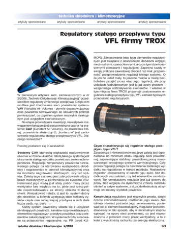 artykuły sponsorowane artykuły sponsorowane artykuły sponsorowane artykuły sponsorowane Regulatory stałego przepływu typu VFL firmy TROX W pierwszym artykule serii, zamieszczonym w nr 2/2006 „Techniki Ch³odniczej i Klimatyzacyjnej” przedstawi³em regulatory zmiennego przep³ywu. Dziêki nim mo¿liwe jest zbudowanie sieci powietrznej systemu VAV (Variable Air Volume) - p³ynnie dopasowuj¹cego iloœæ powietrza nawiewanego do aktualnych potrzeb pomieszczeñ, co czyni ten system niezwykle atrakcyjnym pod wzglêdem ekonomicznym. Na etapie prowadzenia inwestycji, niew¹tpliwie rozwi¹zaniem tañszym jest sieæ powietrzna oparta na systemie CAV (Constant Air Volume), do stworzenia której, przewrotnie stwierdzê ☺, „konieczne” jest zastosowanie regulatorów sta³ego przep³ywu typu VFL. Dlaczego konieczne? Poni¿ej postaram siê to uzasadniæ. Systemy CAV stanowi¹ wiêkszoœæ realizowanych obecnie w Polsce uk³adów. Istot¹ takiego systemu jest utrzymanie sta³ego wydatku powietrza o zmiennej temperaturze. Regulacja temperatury powietrza nawiewanego polega na sterowaniu wydajnoœci¹ ch³odnicy i nagrzewnicy w centrali klimatyzacyjnej oraz na monta¿u nagrzewnic strefowych, czy te¿ splitów. Zalet¹ tego systemu jest zdecydowanie ni¿szy koszt inwestycyjny w porównaniu do systemu VAV. Natomiast jego wad¹ jest sta³y pobór mocy przez wentylator bez wzglêdu na to, jakie jest rzeczywiste zapotrzebowanie ze strony obiektu w danej chwili. Wnioskowaæ nale¿y, i¿ jest to system dobry dla obiektów, w których wystêpuj¹ sta³e rozk³ady zysków ciep³a oraz mniej wiêcej przebywa w nich sta³a liczba osób, np. biura. Ka¿dy system powietrzny sk³ada siê z urz¹dzeñ obrabiaj¹cych powietrze, kana³ów rozprowadzaj¹cych, elementów reguluj¹cych przep³yw powietrza oraz z elementów zakañczaj¹cych. W systemach CAV stosowane s¹ przepustnice regulacyjne, np. PR (prod. KLItechnika ch³odnicza i klimatyzacyjna 4/2006 MOR). Zastosowanie tego typu elementów regulacyjnych jest zwi¹zane z obliczeniami, doborami wzglêdnie ¿mudnymi, czasoch³onnymi, a co za tym idzie kosztownymi pomiarami i regulacjami. Zapewne ka¿dy w swojej praktyce zawodowej chocia¿ raz mia³ „przyjemnoœæ” przeprowadzenia regulacji takiego systemu. O ile jest to uk³ad ma³y, to jeszcze mo¿na w miarê bezboleœnie przejœæ przez etap jego regulacji, ale przy uk³adach rozbudowanych jest to ju¿ spory problem – wzajemnego oddzia³ywania elementów. I w³aœnie w tym miejscu firma TROX proponuje zastosowanie regulatora sta³ego przep³ywu typu VFL zamiast typowych przepustnic regulacyjnych. Czym charakteryzuje siê regulator sta³ego przep³ywu typu VFL? Zasadnicz¹ i niekwestionowan¹ jego zalet¹ jest ograniczenie do minimum czasu regulacji sieci powietrznej, zapewniaj¹ce stabiln¹ i prawid³ow¹ pracê nowoczesnego i wydajnego systemu wentylacyjnego. Ca³y proces regulacji polega na nastawieniu zadanego wydatku na regulatorze w trakcie monta¿u. Nastawiony regulator umieszczamy w kanale typu spiro, bez dodatkowych uszczelnieñ, czy te¿ elementów monta¿owych. Tak umieszczony regulator jest ju¿ gotowy do pracy. Bez wzglêdu na dynamiczne zmiany rozk³adu ciœnieñ w ca³ym systemie, z du¿¹ dok³adnoœci¹ utrzymuje on zadany wydatek powietrza. Konstrukcja regulatora jest niezwykle prosta, dziêki czemu zminimalizowano mo¿liwoœæ jego awarii. Nie istnieje równie¿ potrzeba jego serwisowania, poniewa¿ jest to element bezobs³ugowy. Regulator jest skonstruowany w taki sposób, aby w minimalnym stopniu wp³ywaæ na opory sieci powietrznej, co jest równoznaczne z poborem mocy przez wentylatory, a to z kolei z wysokoœci¹ rachunku za energiê elektryczn¹. 179 artykuły sponsorowane artykuły sponsorowane artykuły sponsorowane - nastawy przepływu VFL-a mieszek z tworzywa sztucznego powietrze przepustnica element nastawny Cechy wewn¹trz-kana³owego regulatora sta³ego przep³ywu typu VFL: - dok³adnoœæ pomiarowa przep³ywu +/- 10%, relatywnie do Vnom, - objêtoœciowy strumieñ przep³ywu >5:1; 11 stopni regulacji, - mechanizm dzia³ania automatyczny, - zakres ciœnieñ od 30 do 300 Pa, - mo¿na stosowaæ na nawiewie i na wyci¹gu, - nie wymaga konserwacji, - temperatura pracy od 0oC do 50oC, - temperatura magazynowa od -20oC do 60oC, - kontrolka wykonana ze stali nierdzewnej, - mniejsze tarcie na elementach przepustnicy, 180 artykuły sponsorowane zasuwa regulacyjna i obudowa zrobiona z wysokiej jakoœci plastiku (UL 94 V2), odpowiedni dla kana³ów wyszczególnionych w DIN EN 1506 i DIN EN 13180. Regulatory tego typu spotkaæ mo¿na równie¿ u innych producentów, jednak oferowane przez nich rozwi¹zania posiadaj¹ sta³e nastawy fabryczne, przez co jesteœmy zmuszeni do dokonania zamówienia regulatorów o konkretnych parametrach. VFL stwarza mo¿liwoœæ przestawienia wydajnoœci w dowolnym momencie w zakresie wydajnoœci min i max, co czyni go bardziej uniwersalnym. W ten sposób unikamy niebezpieczeñstwa zwi¹zanego ze zmianami projektu (zmiana wydatków powietrza), czyli koniecznoœci zakupu nowego regulatora. Wystarczy nastawiæ regulator VFL na nowy strumieñ przep³ywu powietrza, zgodny ze zaktualizowanym projektem. Regulatory typu VFL s¹ produkowane od stycznia 2006 roku. Aktualnie w ofercie firmy TROX znajduj¹ siê dwie œrednice : 100 mm i 125 mm. Kolejne wielkoœci bêd¹ wprowadzane do oferty sukcesywnie w ci¹gu roku. Podsumowuj¹c: Id¹c z duchem czasu i stosuj¹c tak nowoczesne rozwi¹zanie, u³atwiamy sobie regulacjê i uruchomienie instalacji, dziêki czemu skracamy czas ca³ej inwestycji, a zatem oszczêdzamy pieni¹dze. Powiem wiêcej, unikamy problemu z rozregulowaniem sieci powietrznej. W rezultacie utwierdzamy inwestora o swoim profesjonalizmie, a dobra marka, to podstawa. Tak wiêc wracaj¹c do pocz¹tku tego artyku³u, „konieczne” jest zastosowanie regulatora typu VFL ☺ po to, aby stworzyæ nowoczesny i niezawodny system CAV. Zainteresowanych sz