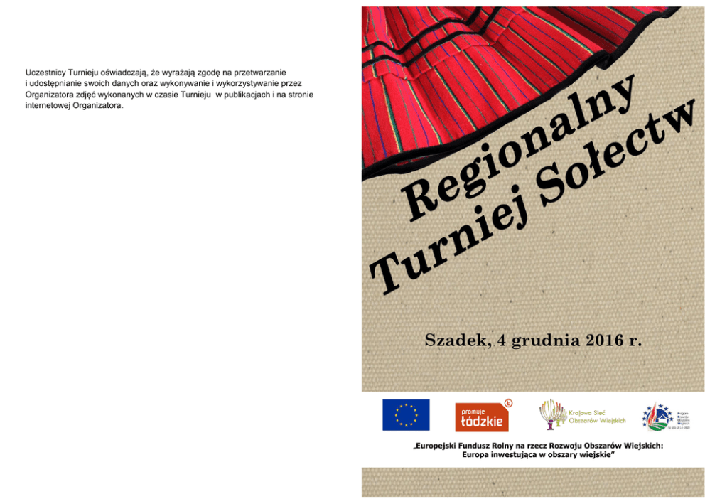 Uczestnicy Turnieju oświadczają, że wyrażają zgodę na przetwarzanie i udostępnianie swoich danych oraz wykonywanie i wykorzystywanie przez Organizatora zdjęć wykonanych w czasie Turnieju w publikacjach i na stronie internetowej Organizatora. Szadek, 4 grudnia 2016 r. „Europejski Fundusz Rolny na rzecz Rozwoju Obszarów Wiejskich: Europa inwestująca w obszary wiejskie” I. Cel imprezy: · Ochrona i kultywowanie bogactwa tradycyjnej kultury ludowej · Integracja środowiska lokalnego. · Pobudzenie i aktywizacja środowiska lokalnego do uczestnictwa w inicjatywach kulturowych. · Promocja, poszukiwanie rozwiązań innowacyjnych dla rozwoju obszarów wiejskich Województwa Łódzkiego. II. Miejsce i czas: Hala sportowa, Zespół Szkół w Szadku, ul. Prusinowska 4 00 4.12.2016 r., rozpoczęcie od godz. 12 2. Wystawa tematyczna zawierająca elementy rękodzielnictwa i przedmiotów użytkowych związanych z wsią ( np. prace haftowane lub szydełkowe, wycinanki, ozdoby świąteczne, rzeźby, wyroby wikliniarskie, rymarskie). Kryteria oceny: - kompozycja przestrzenna stoiska oraz koncepcja układania eksponatów - wartość artystyczna wyeksponowanych rzeczy w domku oraz sposób prezentacji sołectwa - prezentacja rzemiosła lokalnego - ogólne wrażenia estetyczne stoiska oraz zastosowane wzornictwo 3. III. IV. Uczestnicy: Turniej skierowany jest do wszystkich sołectw z terenu województwa łódzkiego. Zasady organizacyjne: 1. Zgłoszenia uczestników przyjmowane są do dnia 22.11.2016 r. na załączonych kartach uczestnictwa na adres: Miejsko-Gminny Ośrodek Kultury w Szadku ul. Widawska 16, 98-240 Szadek [email protected] 2 . Z uwagi na ograniczenie liczby uczestników do 30 reprezentacji, o udziale decyduje kolejność zgłoszeń. 3. Organizator zapewnia domki do prezentacji wystaw i potraw. Każdy wystawca otrzymuje jeden domek o wymiarach 2 m x 3 m (+/- 10%) i odpowiada za ewentualne zniszczenia. 4. O rozmieszczeniu stoisk konkursowych decyduje organizator. 5. Uczestnicy wystaw konkursowych zobowiązani są do utrzymania czystości i porządku na stoiskach i w otoczeniu. 6. Prezentacje artystyczne będą się odbywać na scenie w hali sportowej 7. Sprawy nie ujęte w regulaminie rozstrzyga organizator. V. Prezentacje konkursowe - kategorie: 1. Prezentacja artystyczna obejmująca program kabaretowy lub obrzędowy (np. Andrzejki, zapusty, dożynki, oczepiny, śmigus-dyngus, sobótka i inne). Czas prezentacji nie może przekroczyć 15 minut. Kryteria oceny: - oryginalność i pomysłowość przedstawianej prezentacji, - walory artystyczne i estetyka wykonania, - zaangażowanie całego środowiska wiejskiego przy realizacji zadania (wielopokoleniowy charakter). Tradycyjne potrawy regionalne – prezentacja i degustacje Na stoisku może być prezentowanych wiele potraw, ale do konkursu zgłaszamy tylko jedną. Kryteria oceny: - walory smakowe i dobór produktów - sposób podania potrawy - kreatywność i pomysłowość VIII. Nagrody: Każda z kategorii konkursowych będzie odrębnie oceniana i nagradzana. Zwycięzcy w poszczególnych kategoriach otrzymają nagrody pieniężne. W kategorii „ Prezentacja artystyczna” otrzymają: I miejsce – 2500 zł II miejsce – 2000 zł III miejsce – 1500 zł Wyróżnienie –1000 zł Wyróżnienie –1000 zł W kategorii „Wystawa rękodzieła i przedmiotów użytkowych związanych z wsią” otrzymają: I miejsce – 2500 zł II miejsce – 2000 zł III miejsce – 1500 zł Wyróżnienie – 1000 zł Wyróżnienie – 1000 zł W kategorii „Tradycyjna potrawa regionalna” otrzymają: I miejsce – 1600 zł II miejsce – 1100 zł III miejsce – 1000 zł Wyróżnienie – 800 zł Wyróżnienie – 800 zł